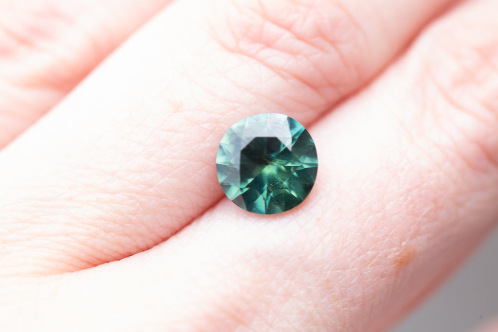 This absolutely stunning round sapphire has the most incredible blue green teal coloring that deepens indoors but shines bright outside! Just the most gorgeous stone that will make such a special piece!