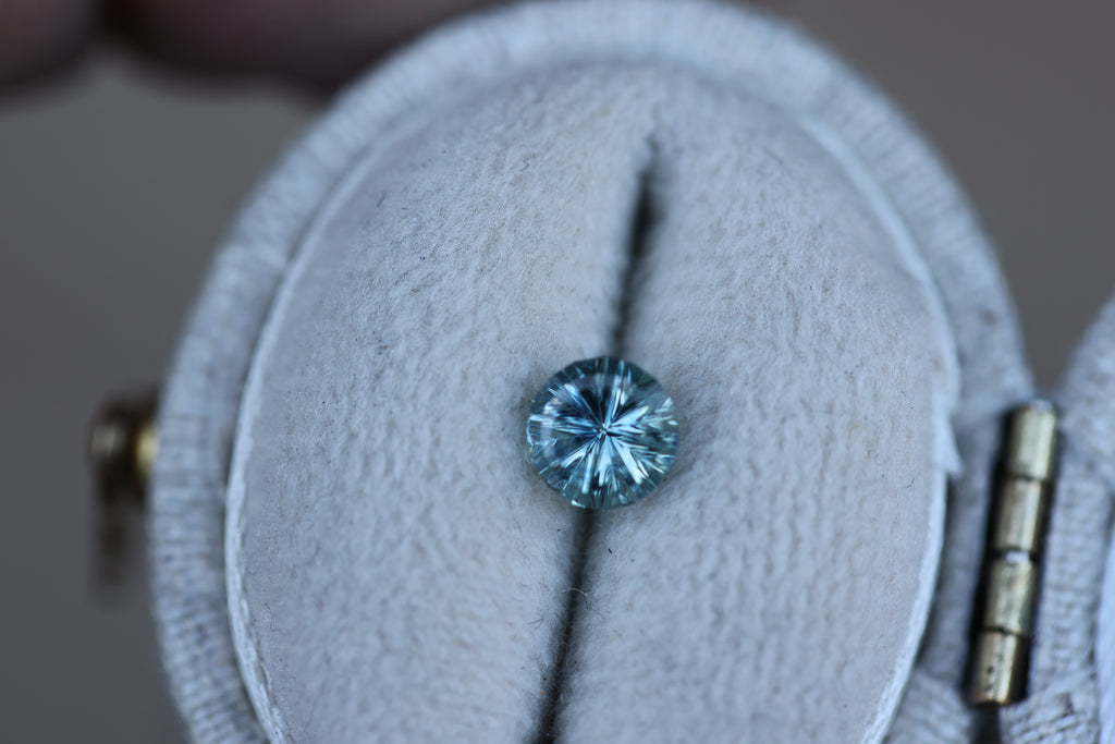 This absolute beauty is a special custom cut Starbrite sapphire by award winning gem cutter John Dyer. It has such lovely light blue teal coloring and the most magical Starbrite faceting!