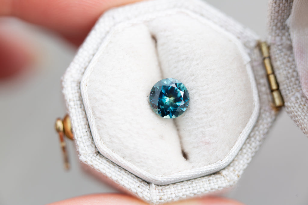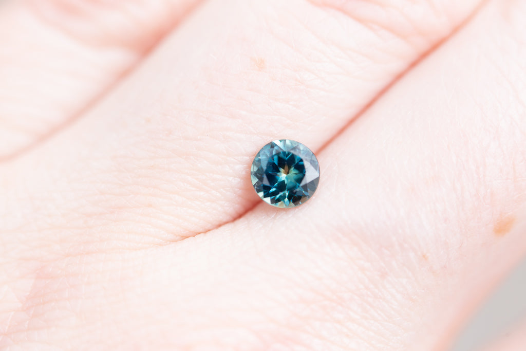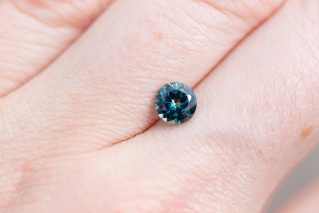 This is a really special sapphire with a little yellow center and beautiful surrounding deep blue green that slightly gives the illusion of a flower