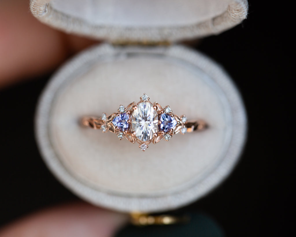 Briar rose three stone with oval moissanite and tanzanite (fairy queen ring)