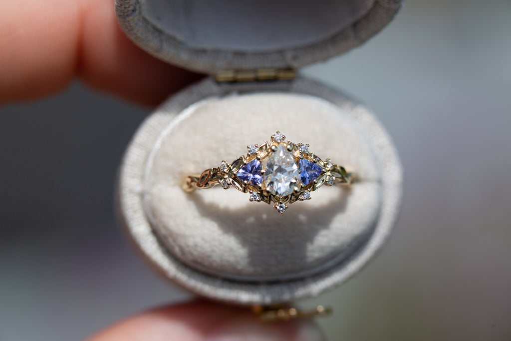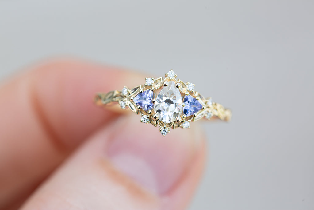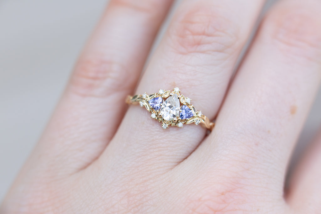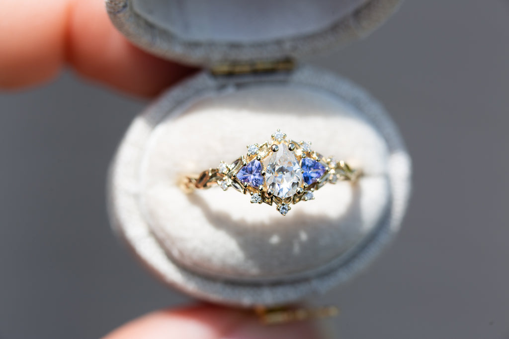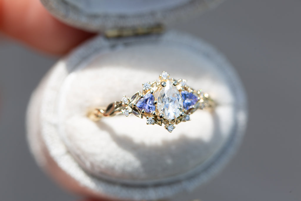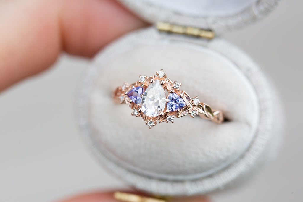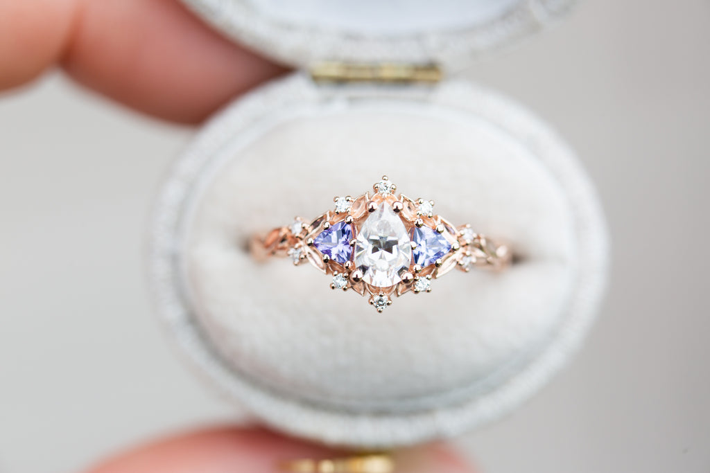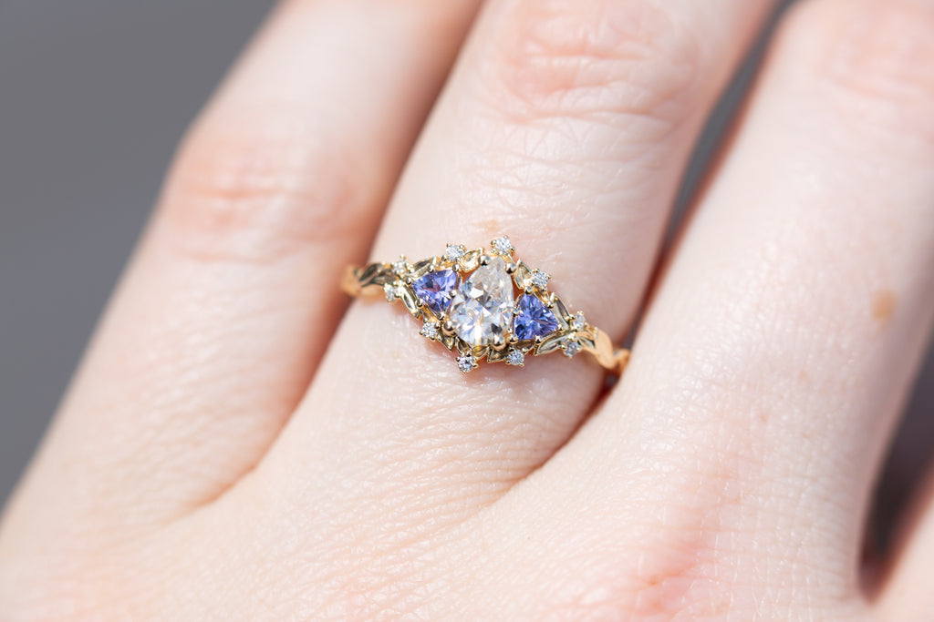 Briar rose three stone with pear moissanite and tanzanite (fairy queen ring)
