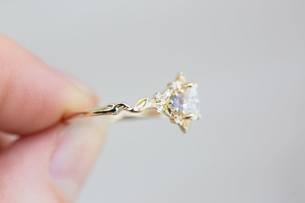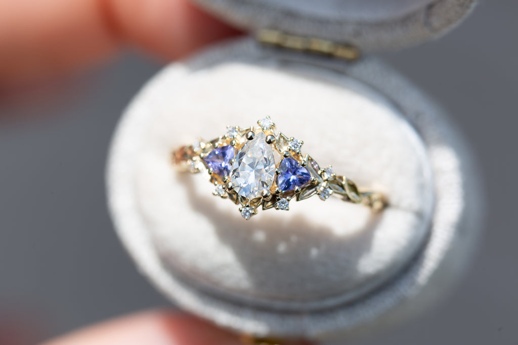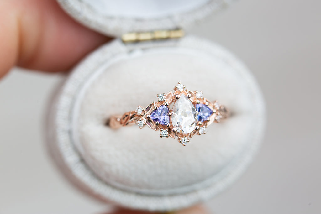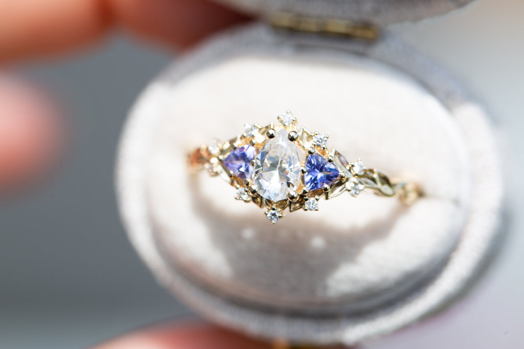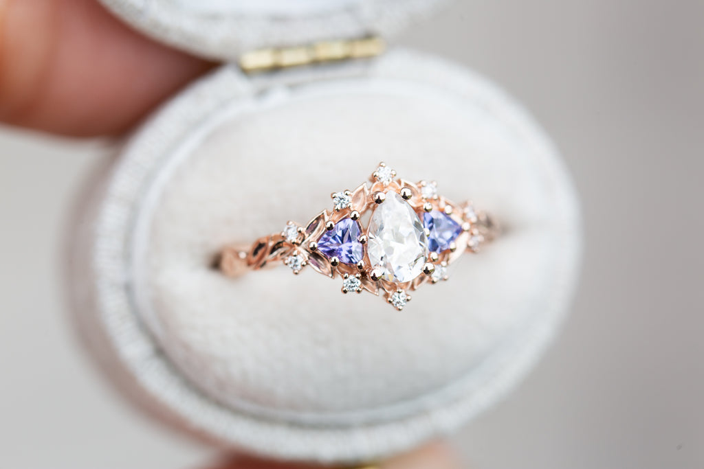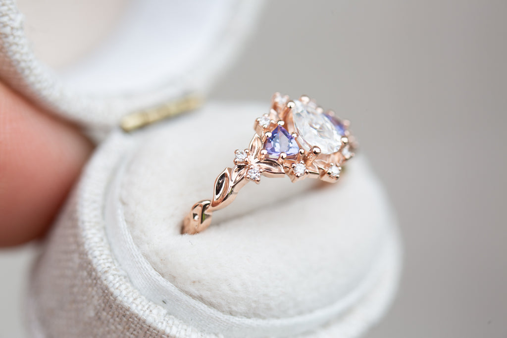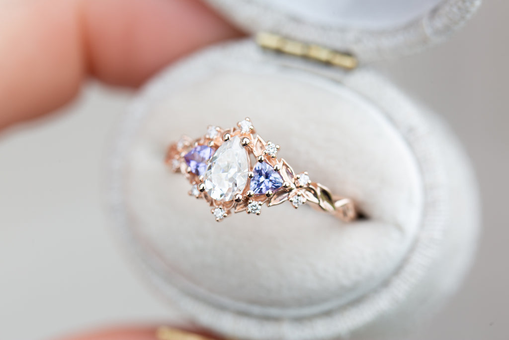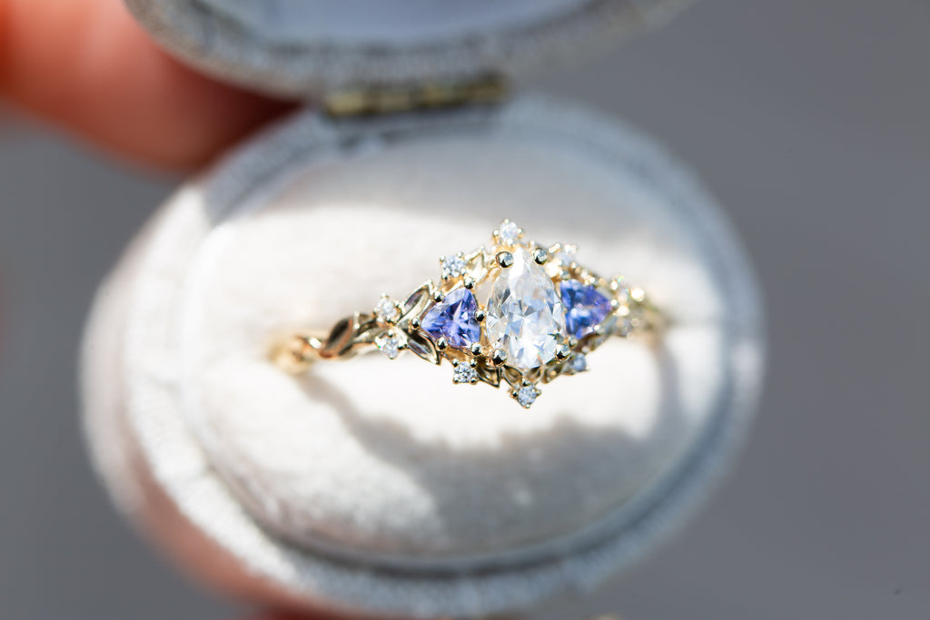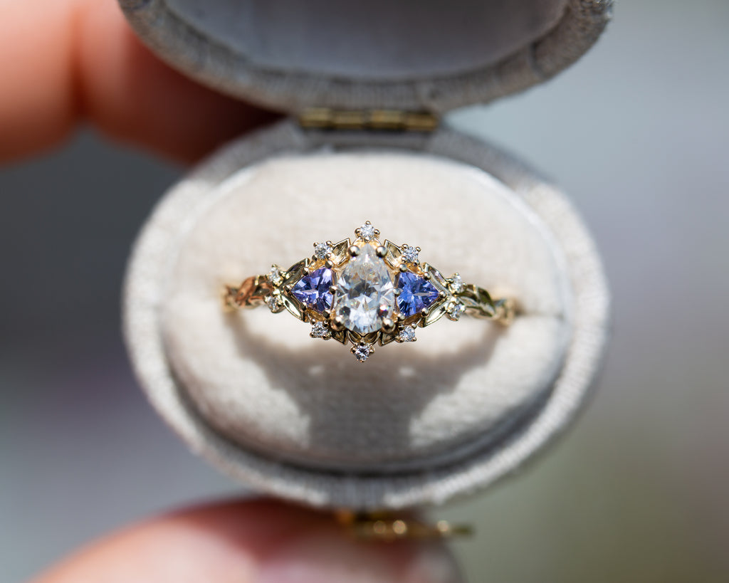 Briar rose three stone with pear moissanite and tanzanite (fairy queen ring)