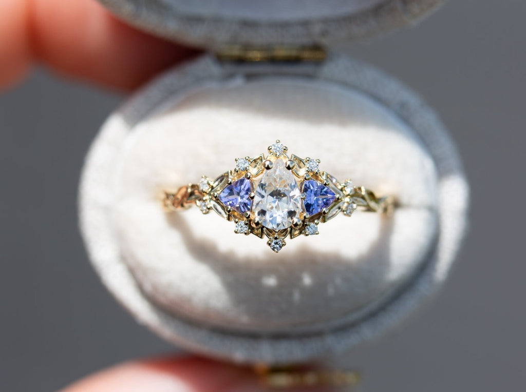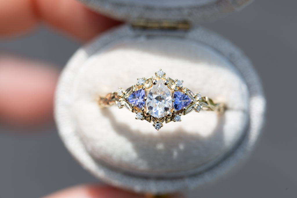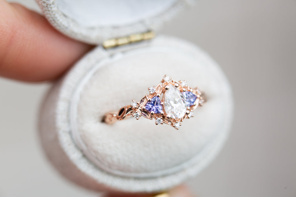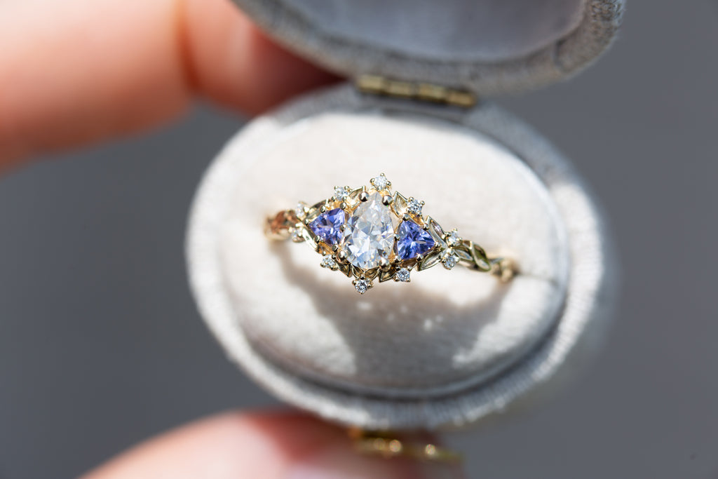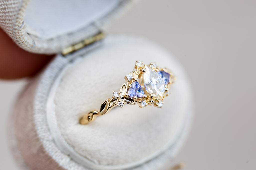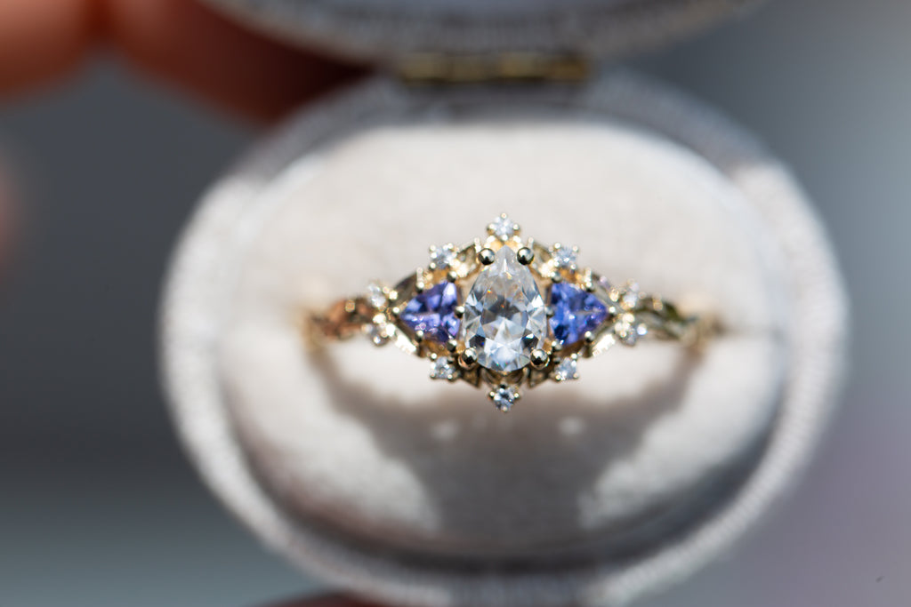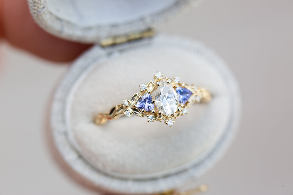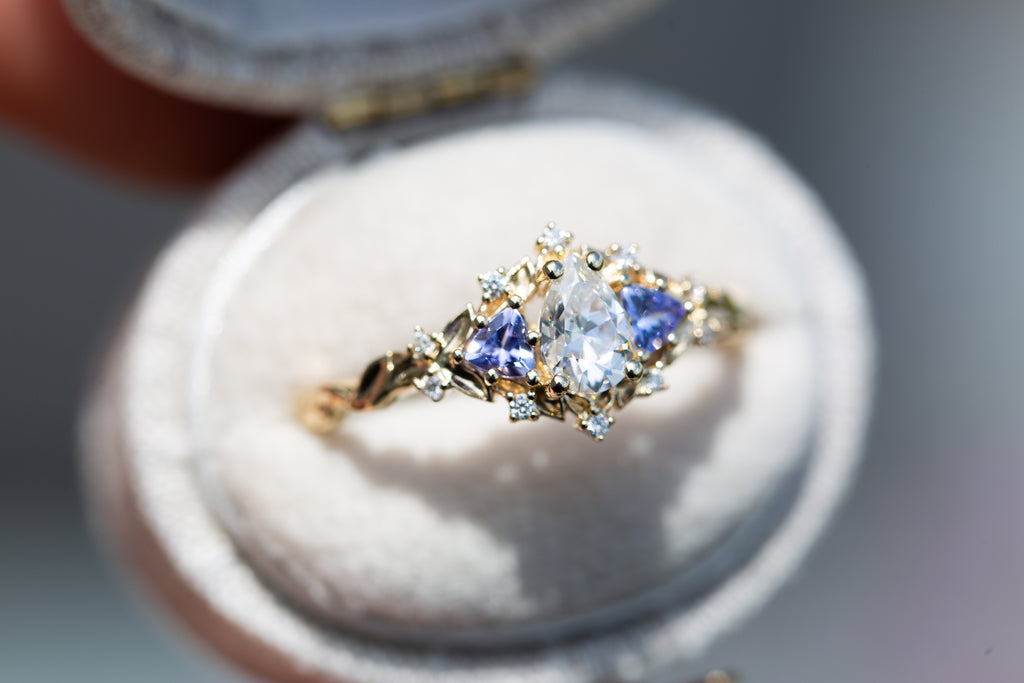 Briar rose three stone with pear moissanite and tanzanite (fairy queen ring)