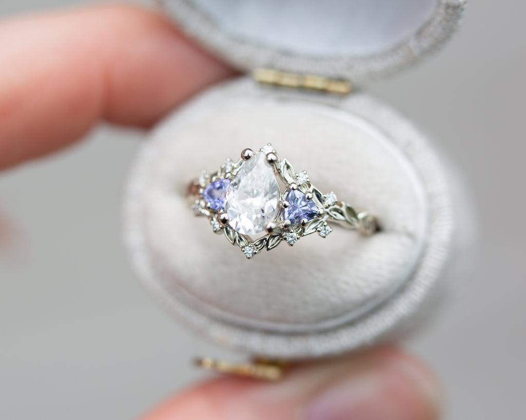 Briar rose three stone with pear moissanite and tanzanite
