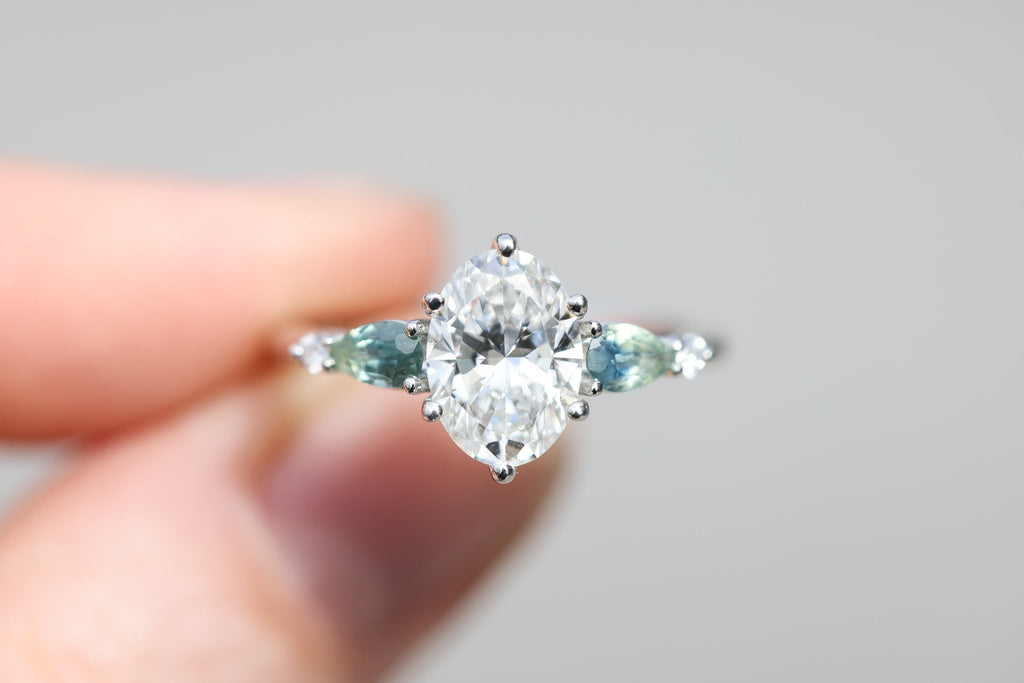 - Oval DEF moissanite center (select size from drop down menu - shown in 9x7mm)