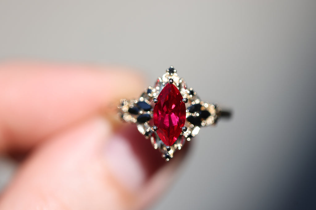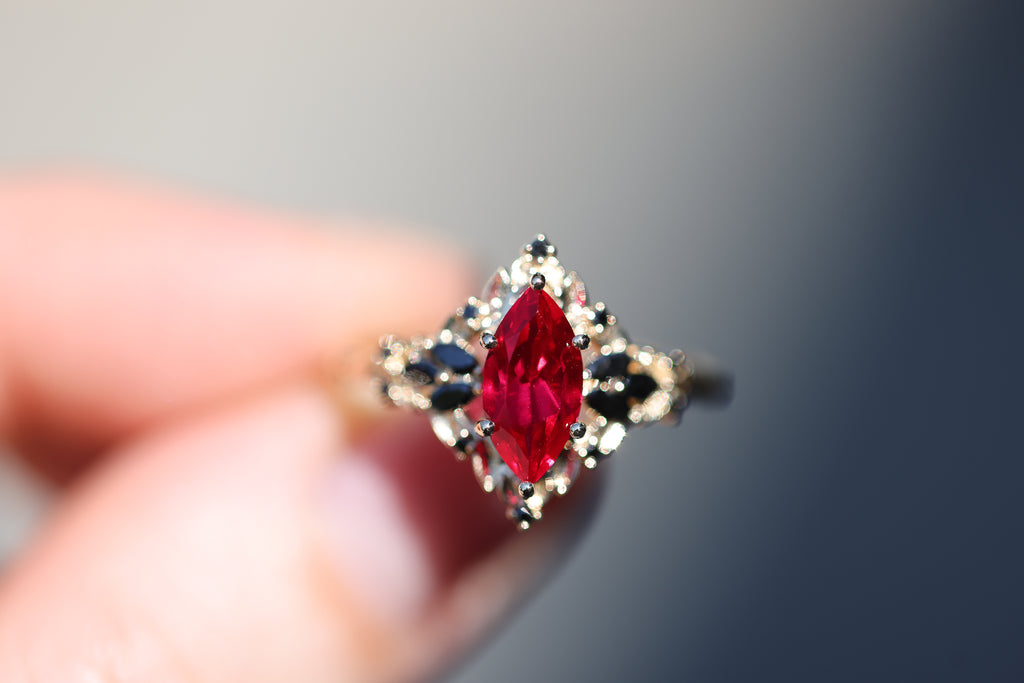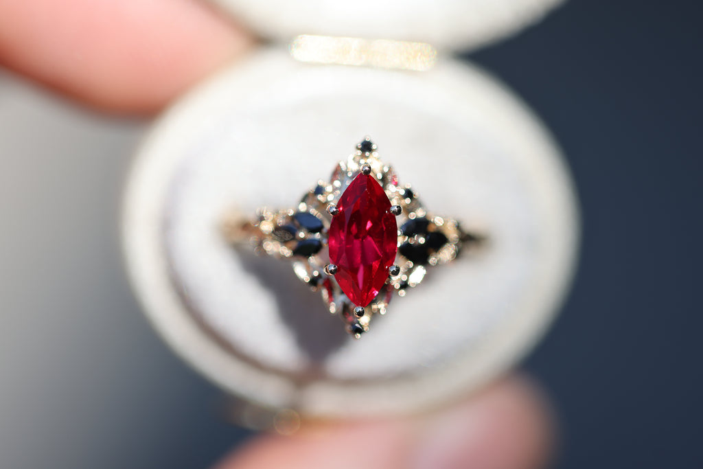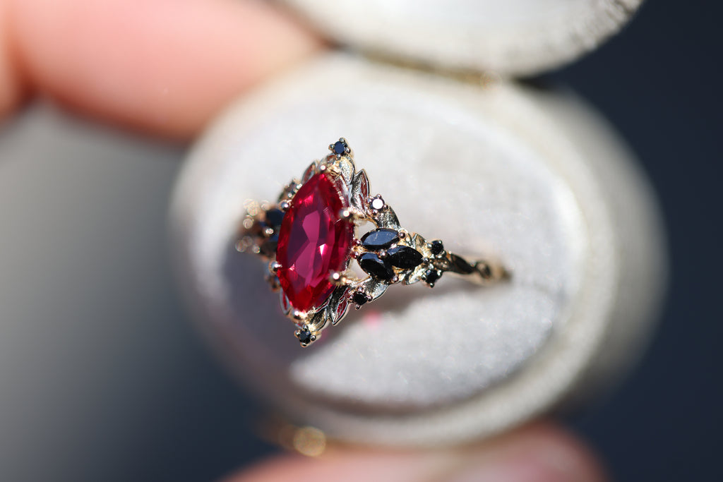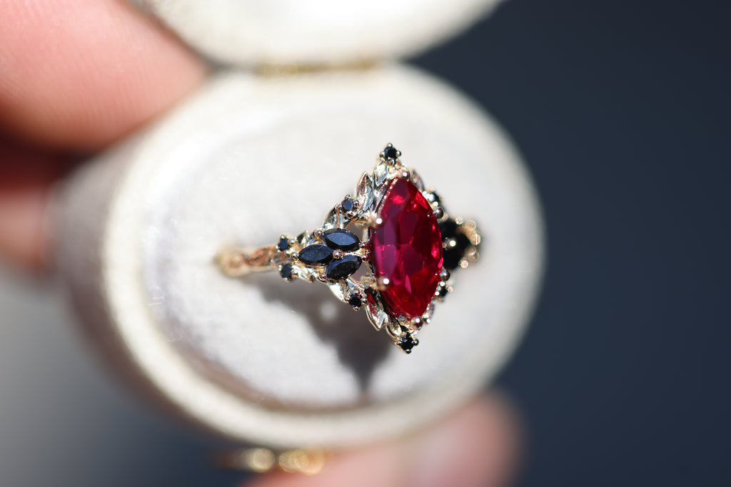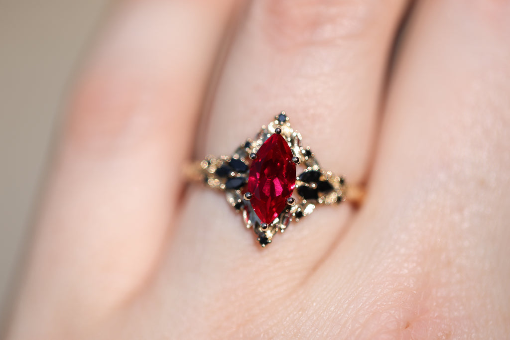 Briar Rose Starlight with 10x5mm Lab Ruby and Black Diamonds
