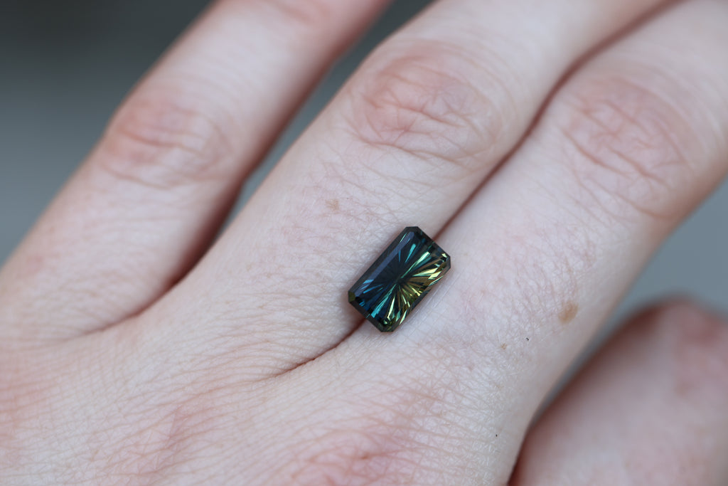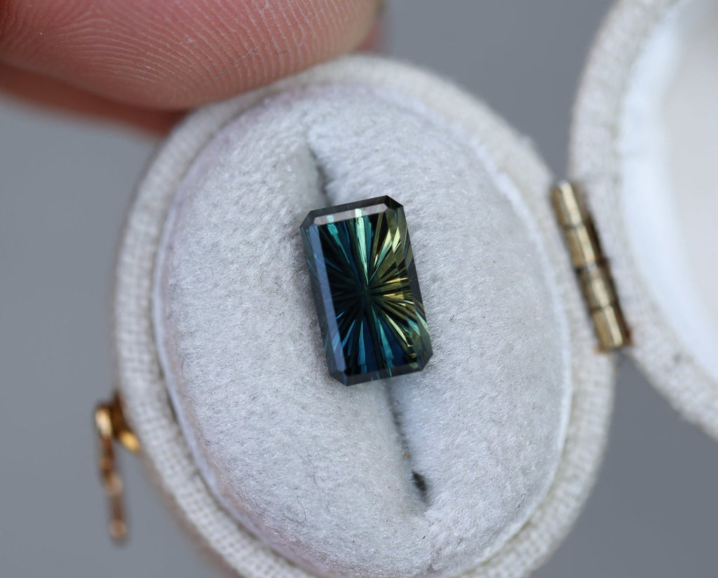 This absolutely stunning rectangle parti sapphire has the most incredible blue teal yellow coloring! It is just such a gorgeous stone from award winning gem cutter John Dyer! It will make a striking one of a kind ring!