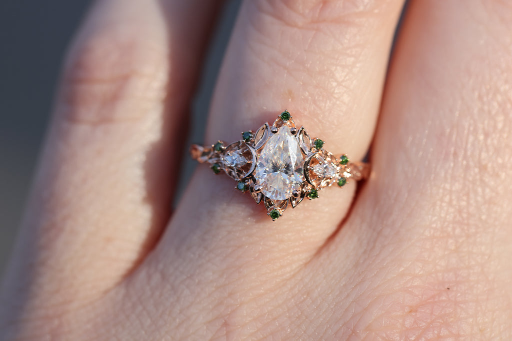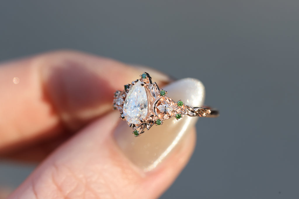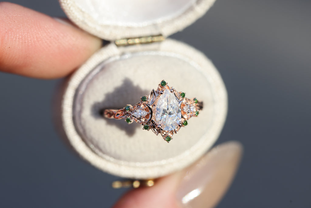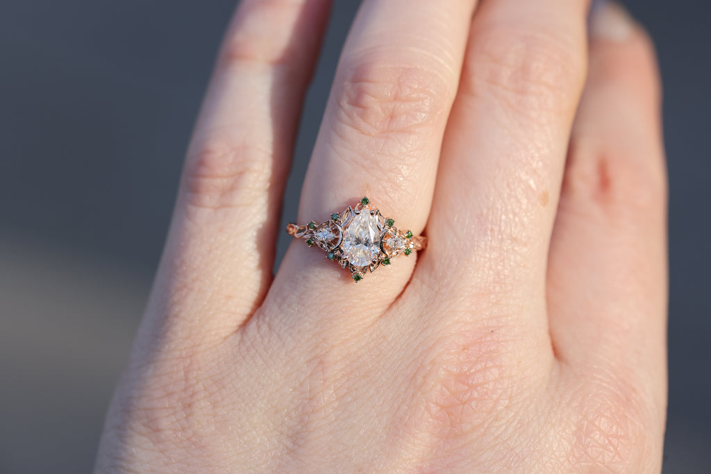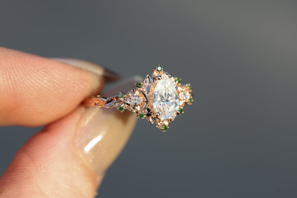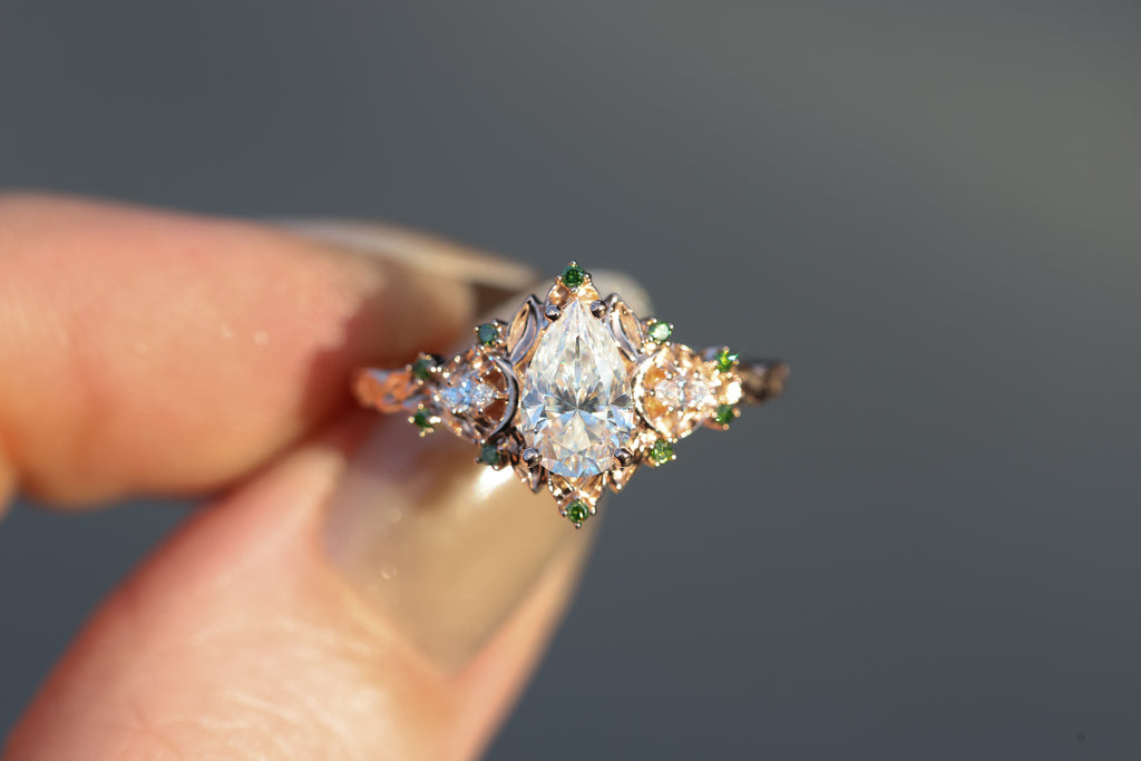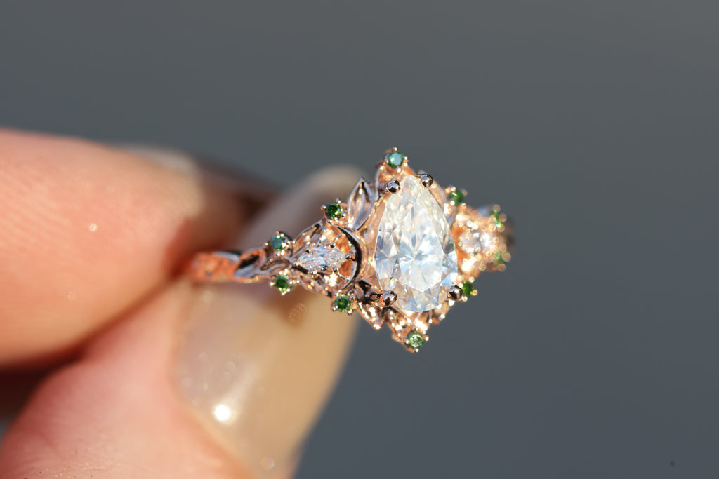 Briar moon three stone with 8x5mm pear moissanite and dark green diamonds