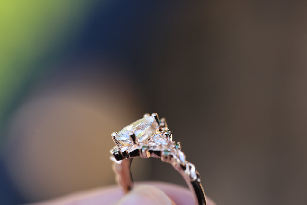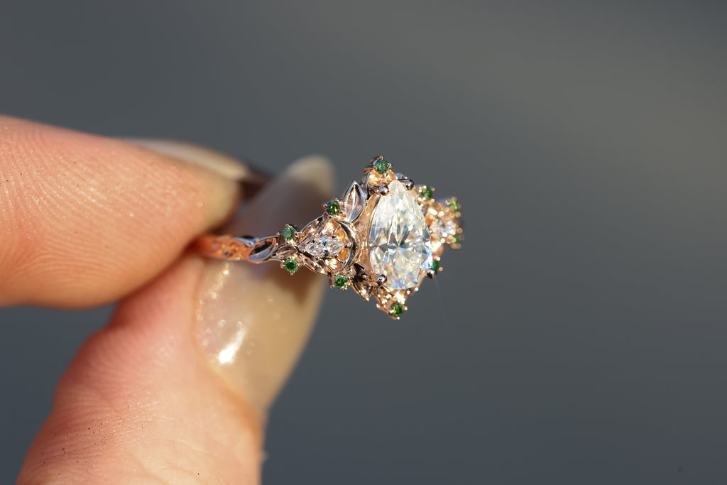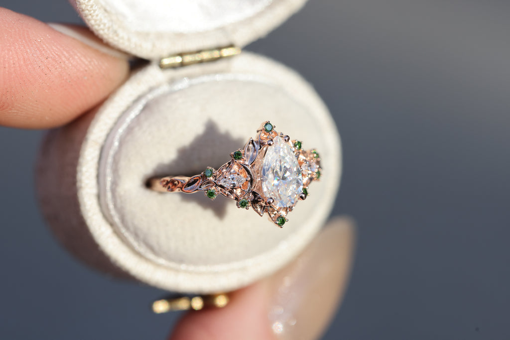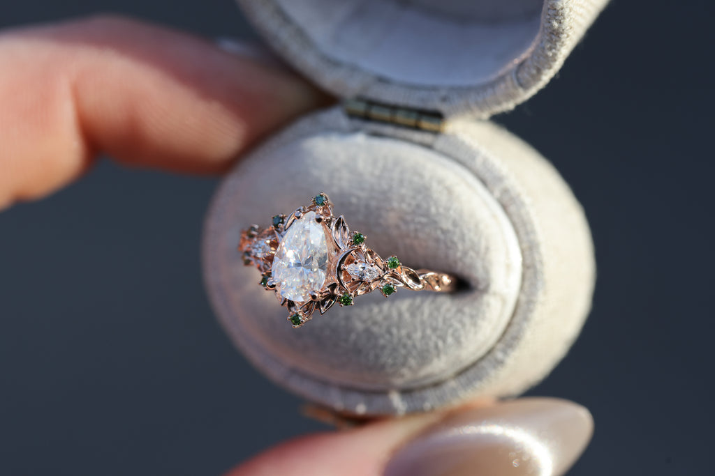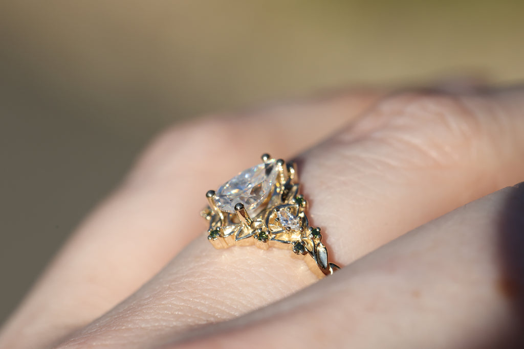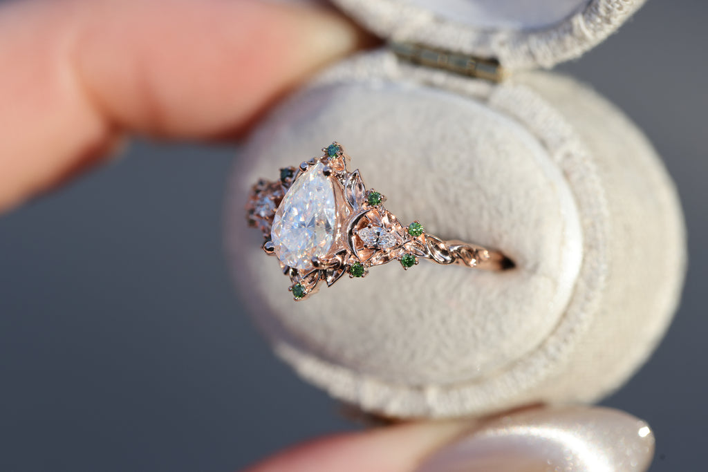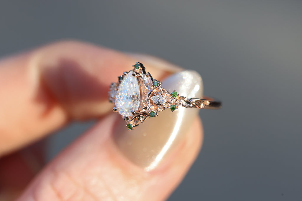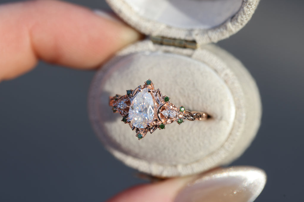 Briar moon three stone with 8x5mm pear moissanite and dark green diamonds