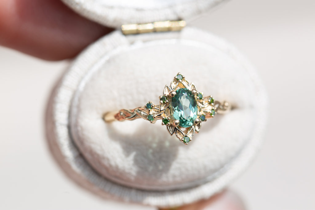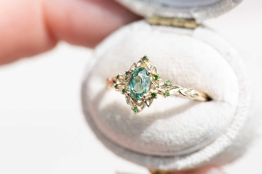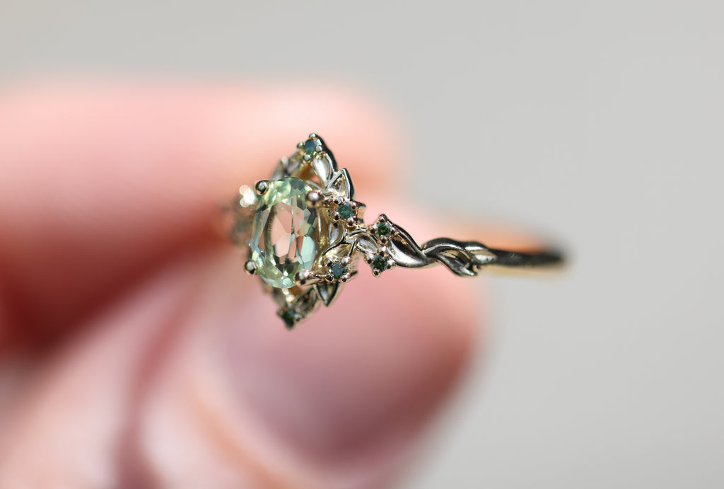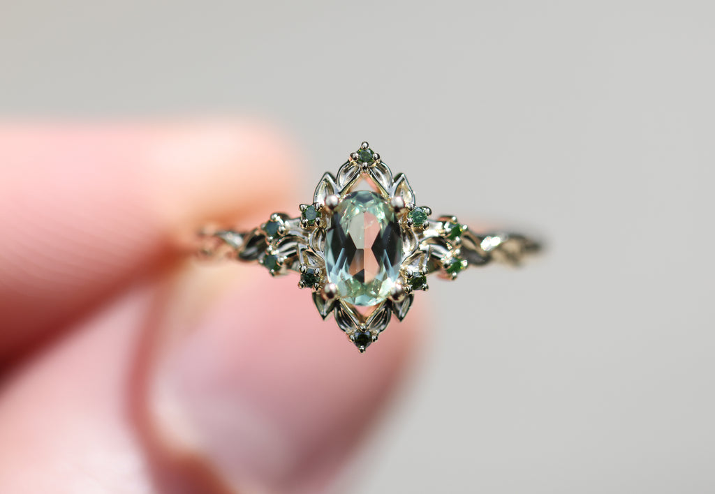- 6x4mm oval lab green sapphire center stone. This is green in color (PLEASE NOTE it is a lighter green that can shift to a more medium color in different lighting). Metal will also heavily affect the color with white gold making it appear lighter.