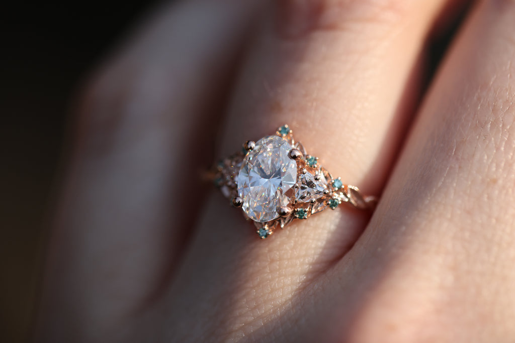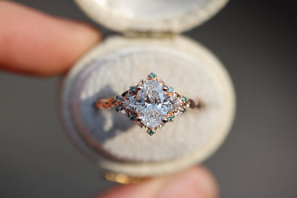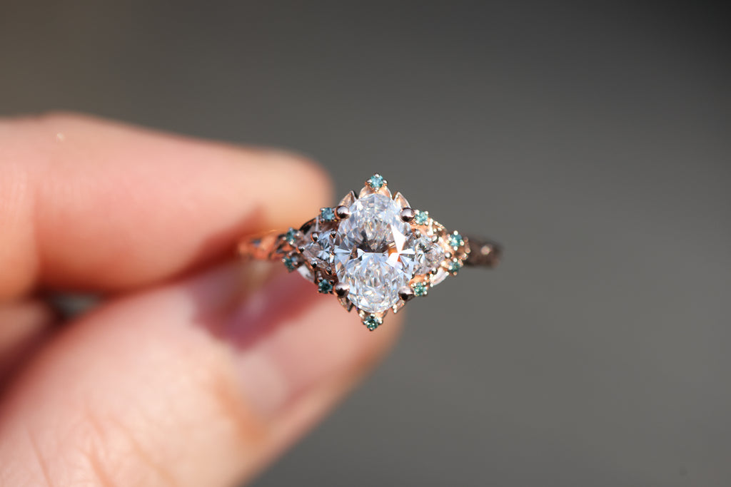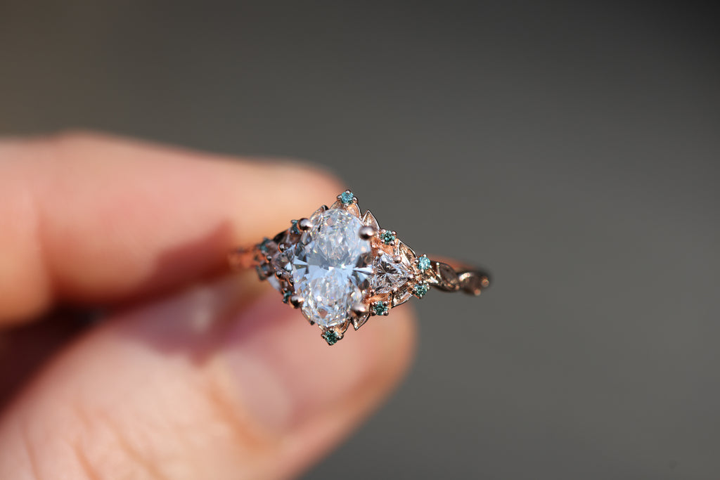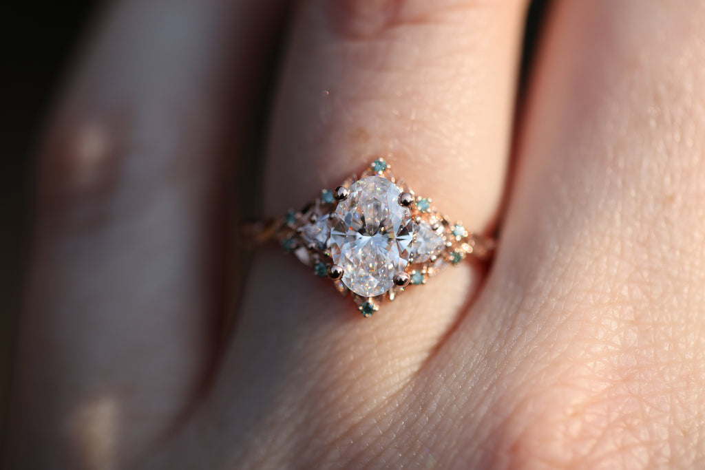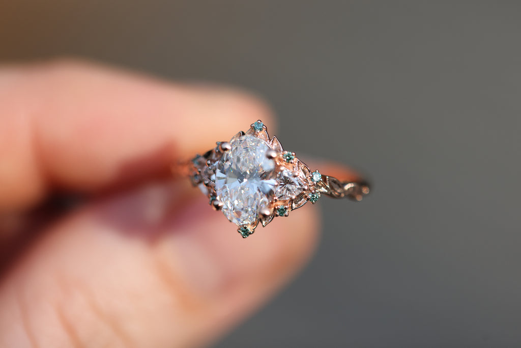 Briar Rose Three Stone with 1.2ct Oval Lab Diamond and Mint Diamond Accents