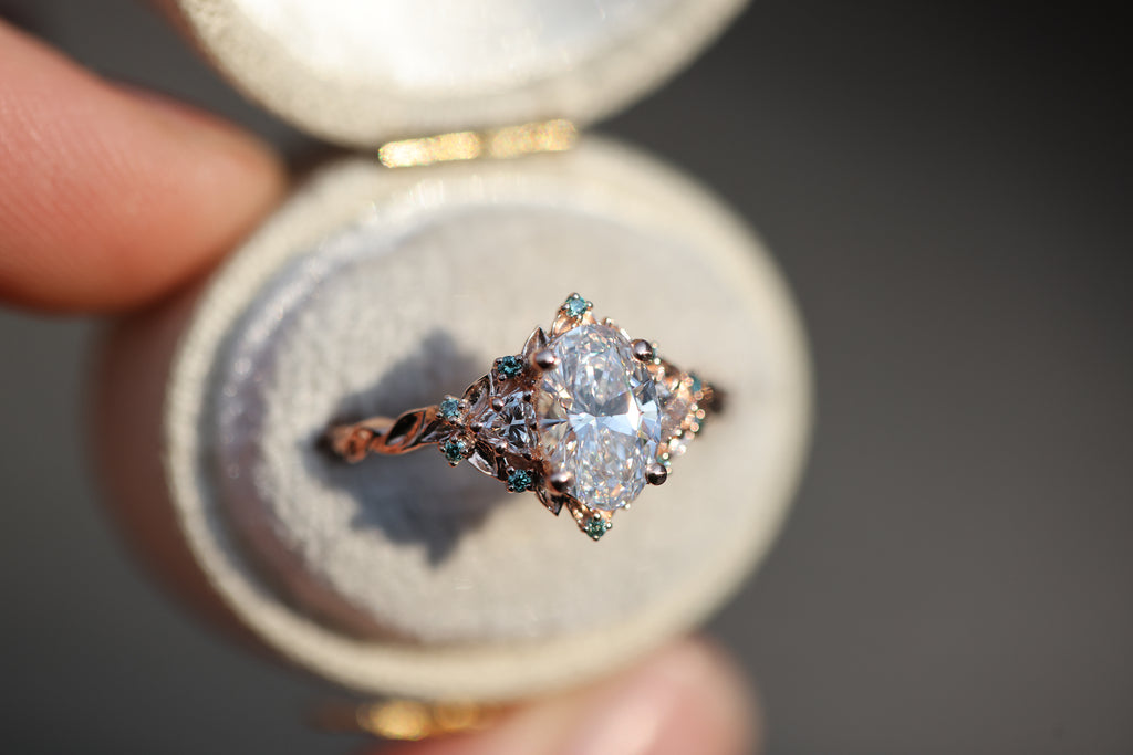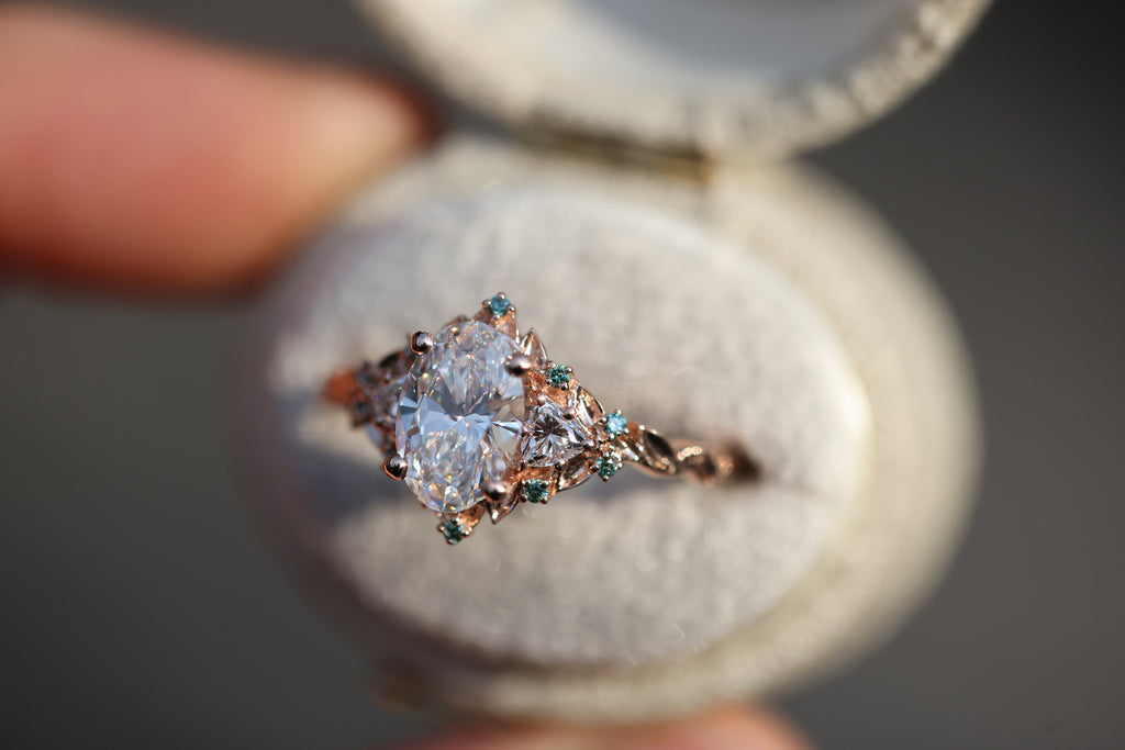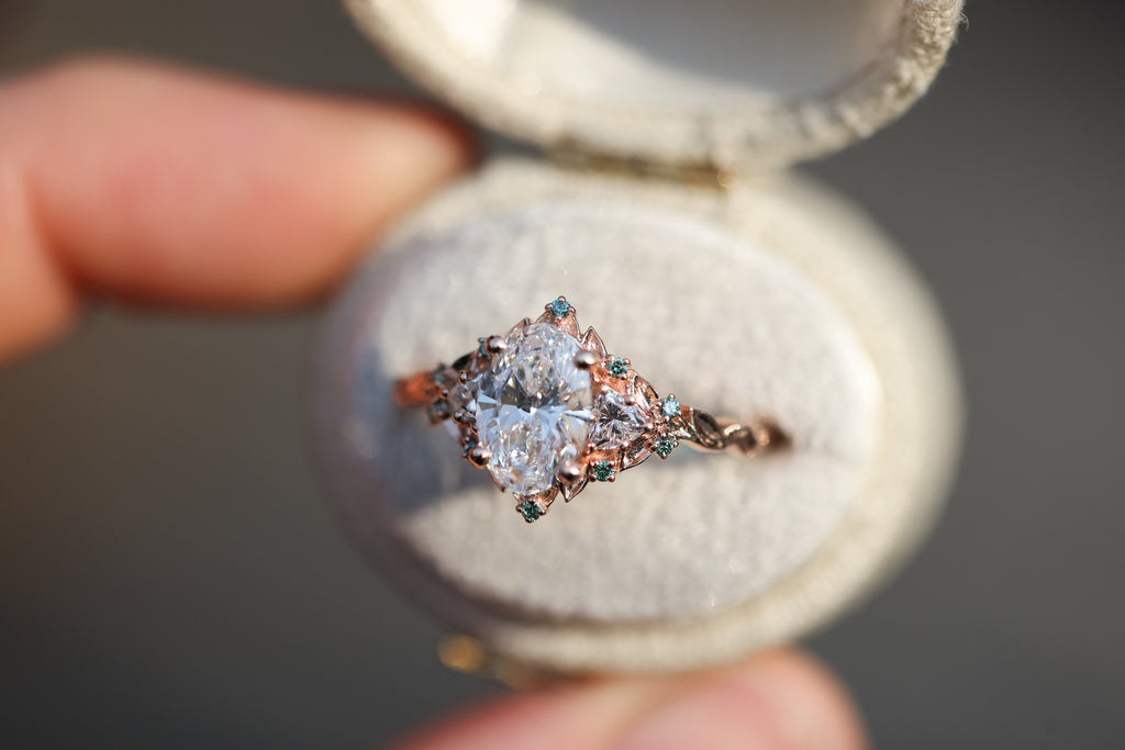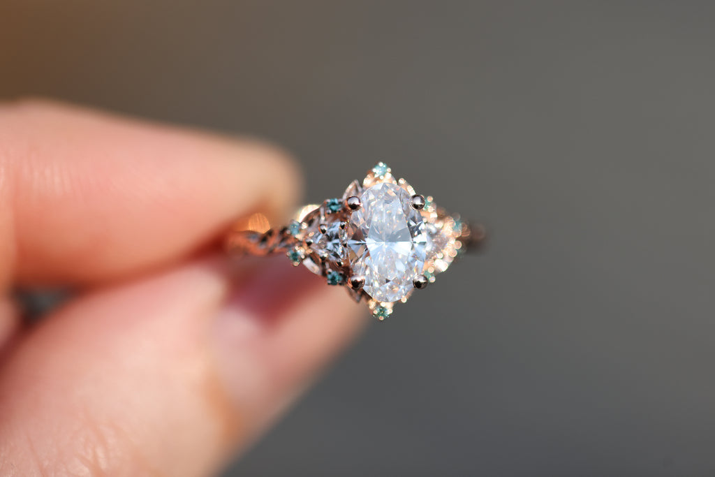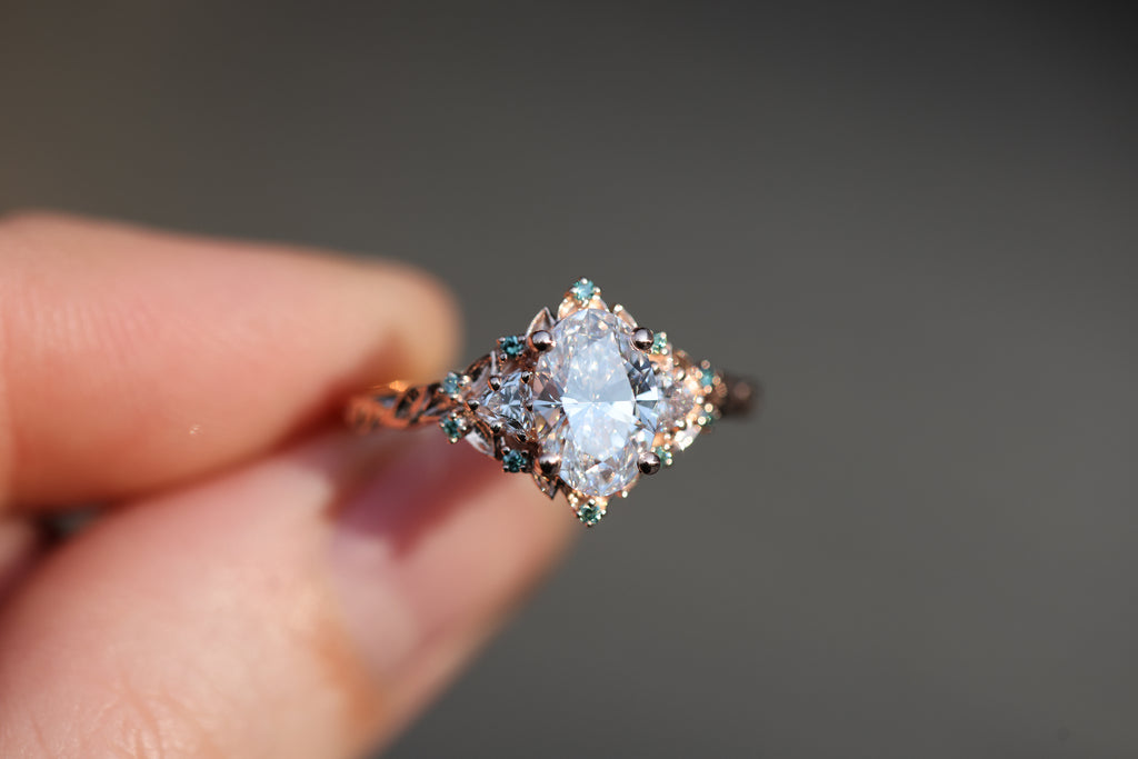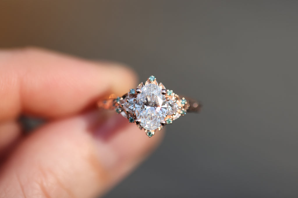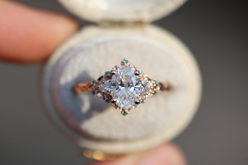 Briar Rose Three Stone with 1.2ct Oval Lab Diamond and Mint Diamond Accents