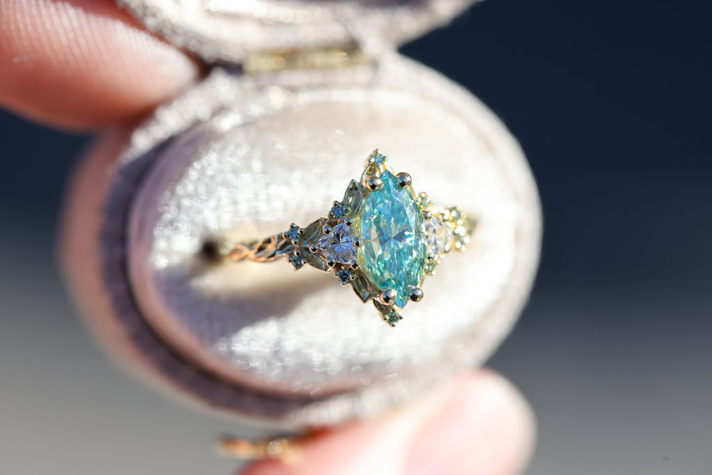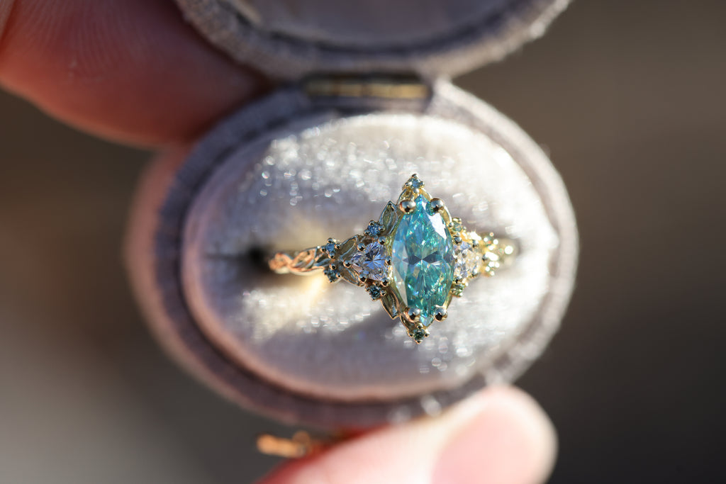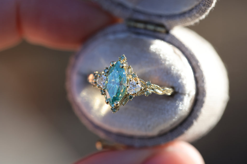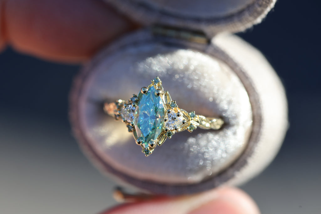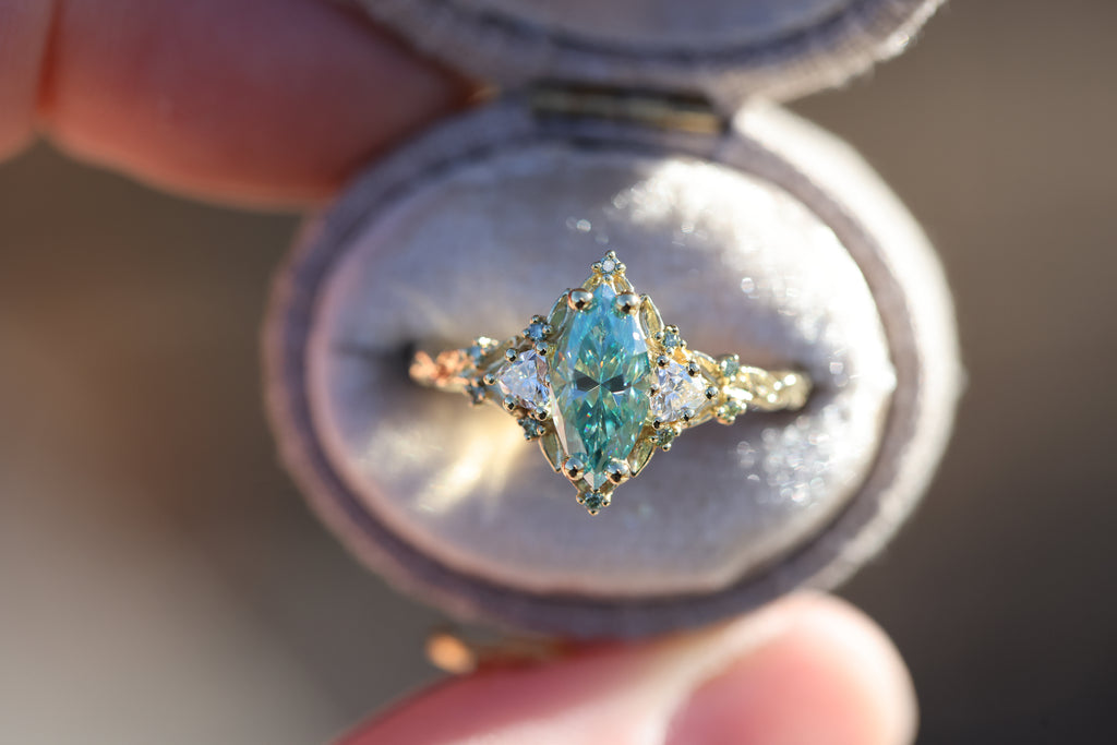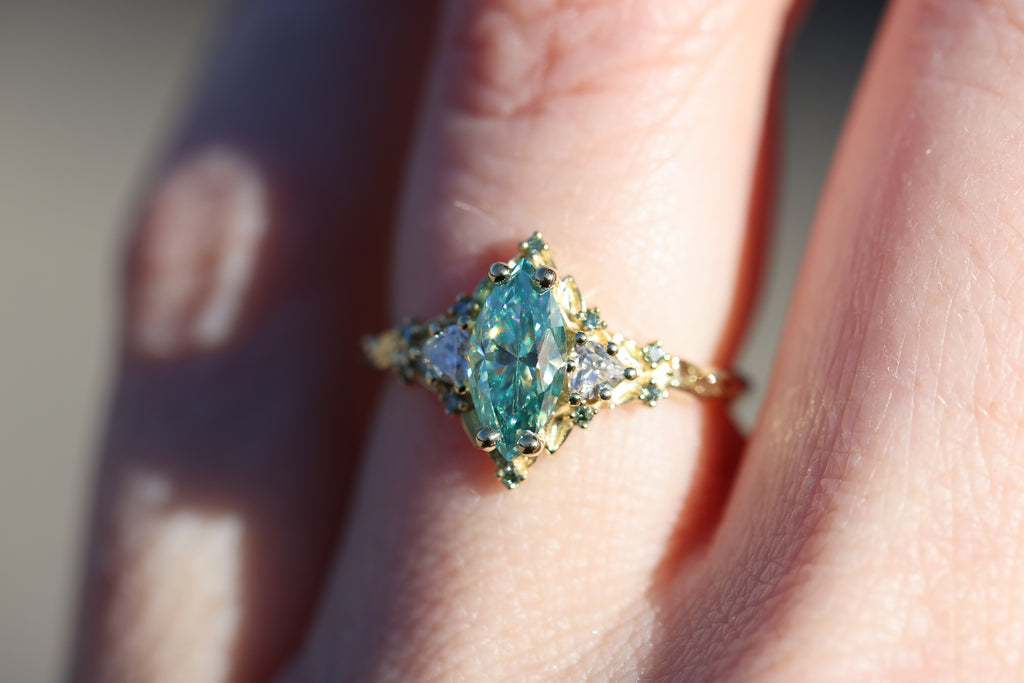 Briar Rose Three Stone with 10x5mm marquise teal moissanite, mint diamond accents