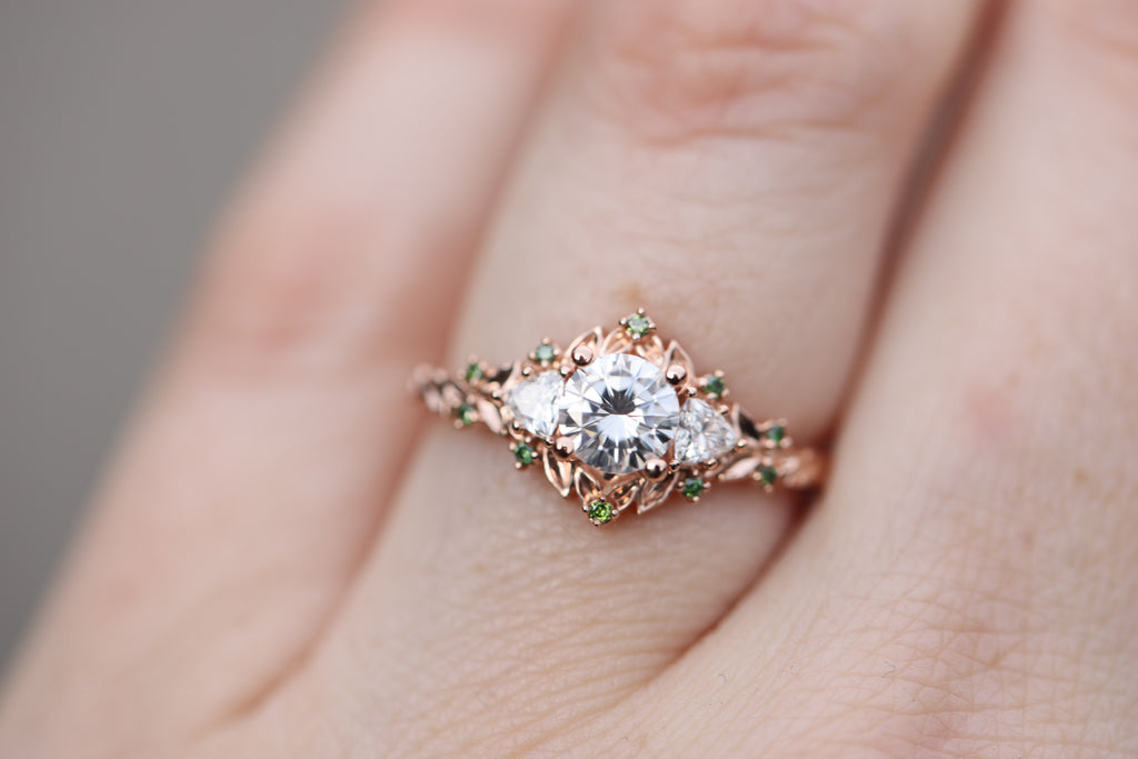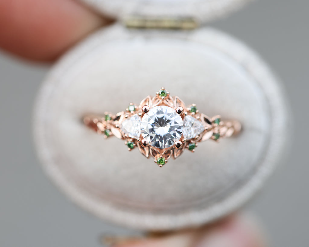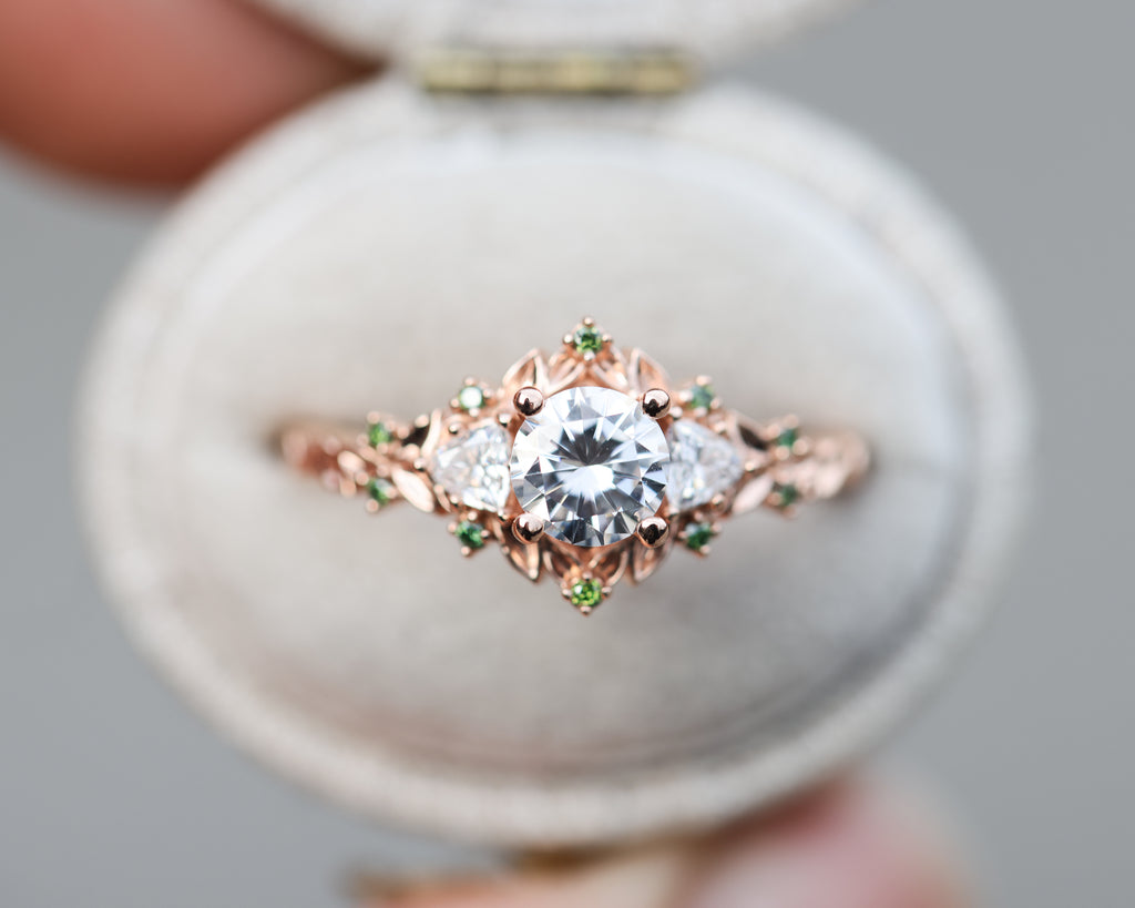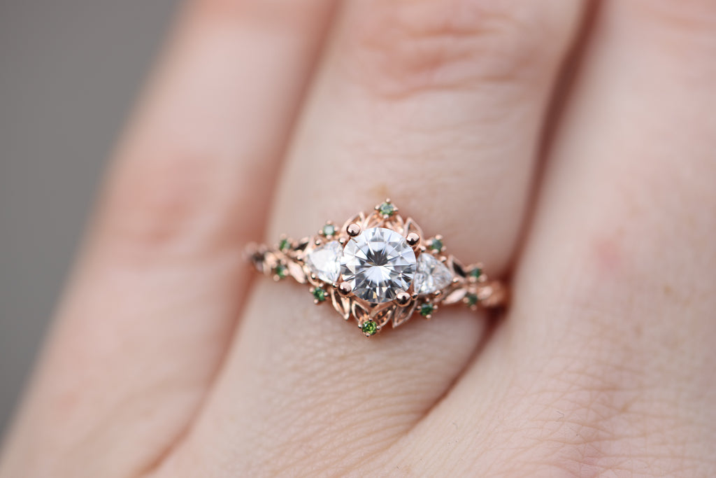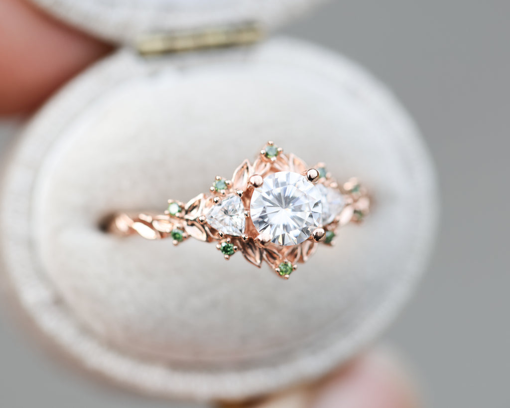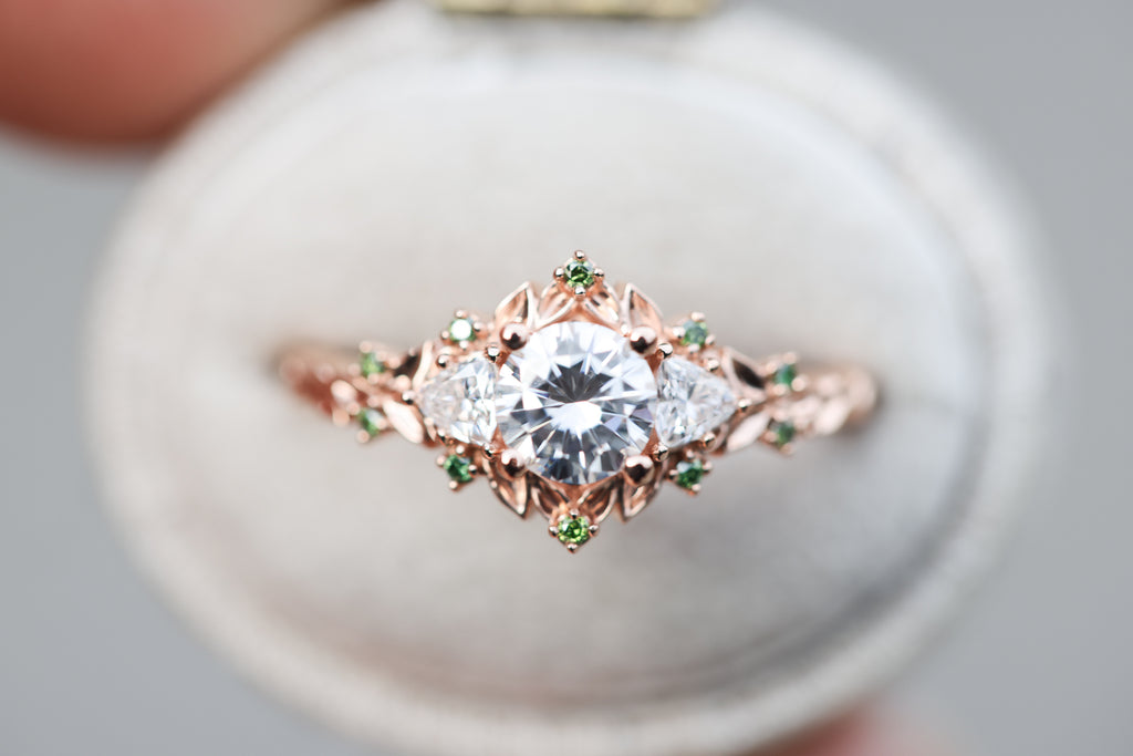 Briar rose three stone with 5.5mm round moissanite and green diamonds accents