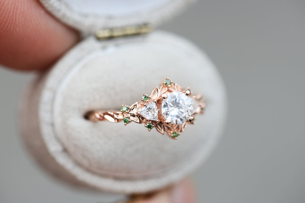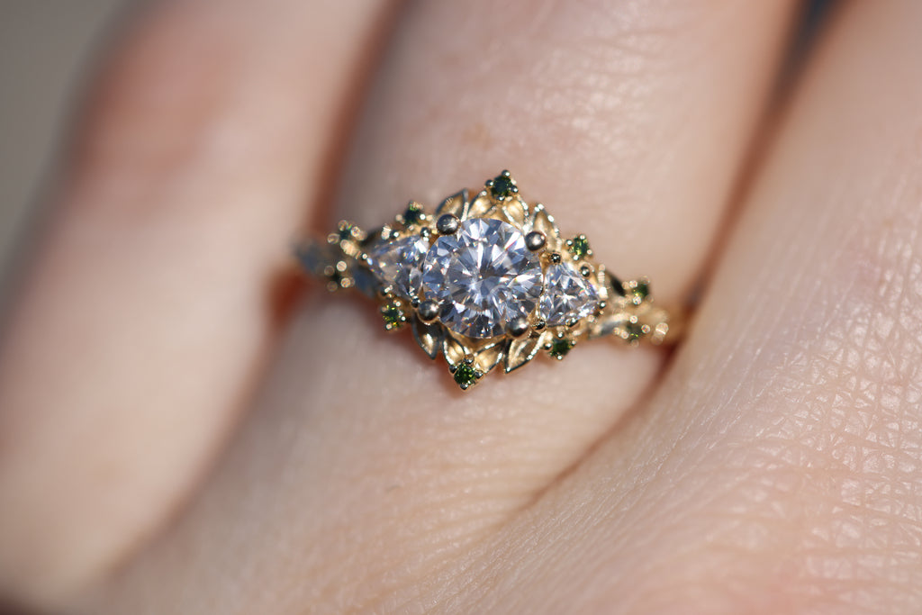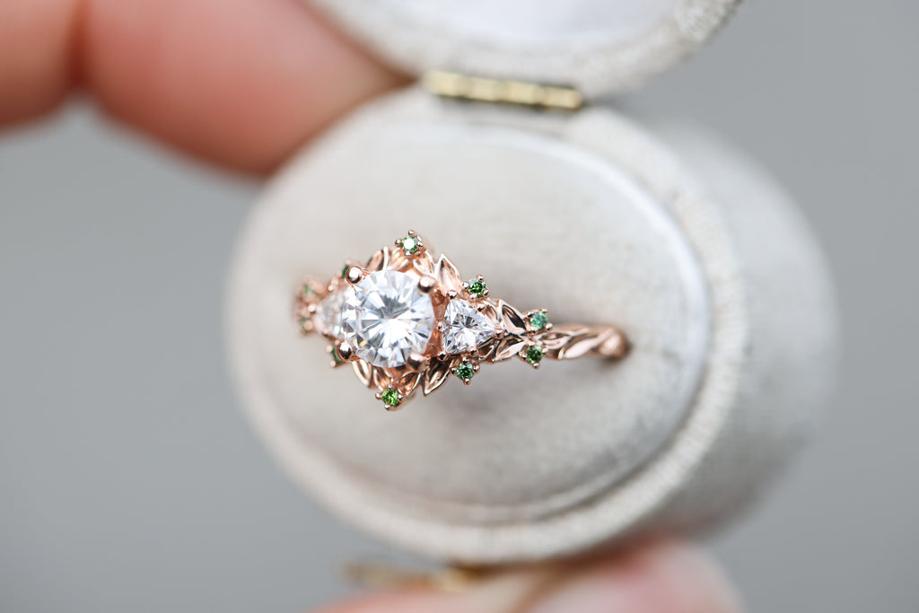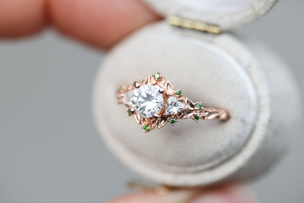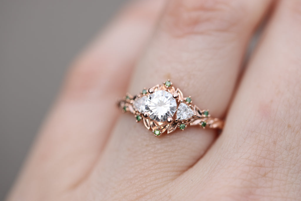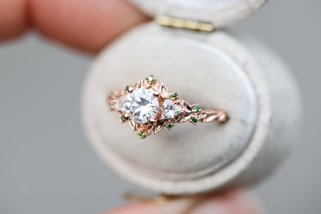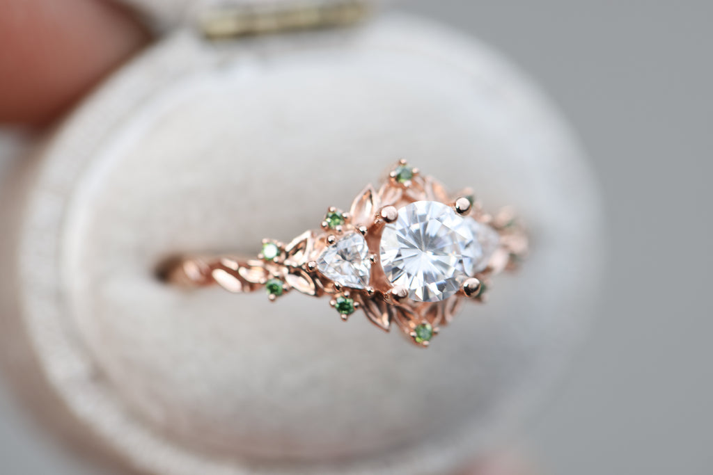 Briar rose three stone with 5.5mm round moissanite and green diamonds accents