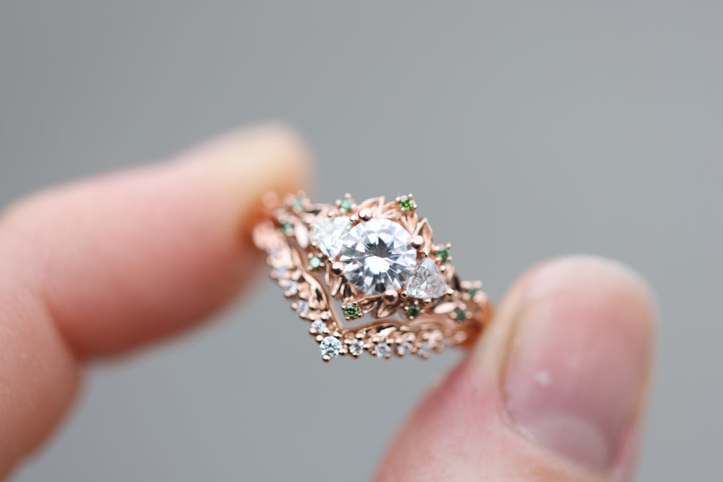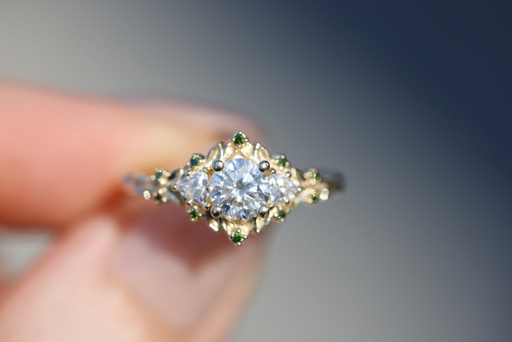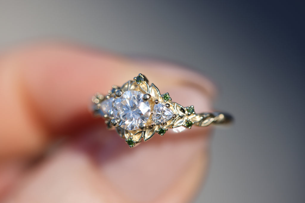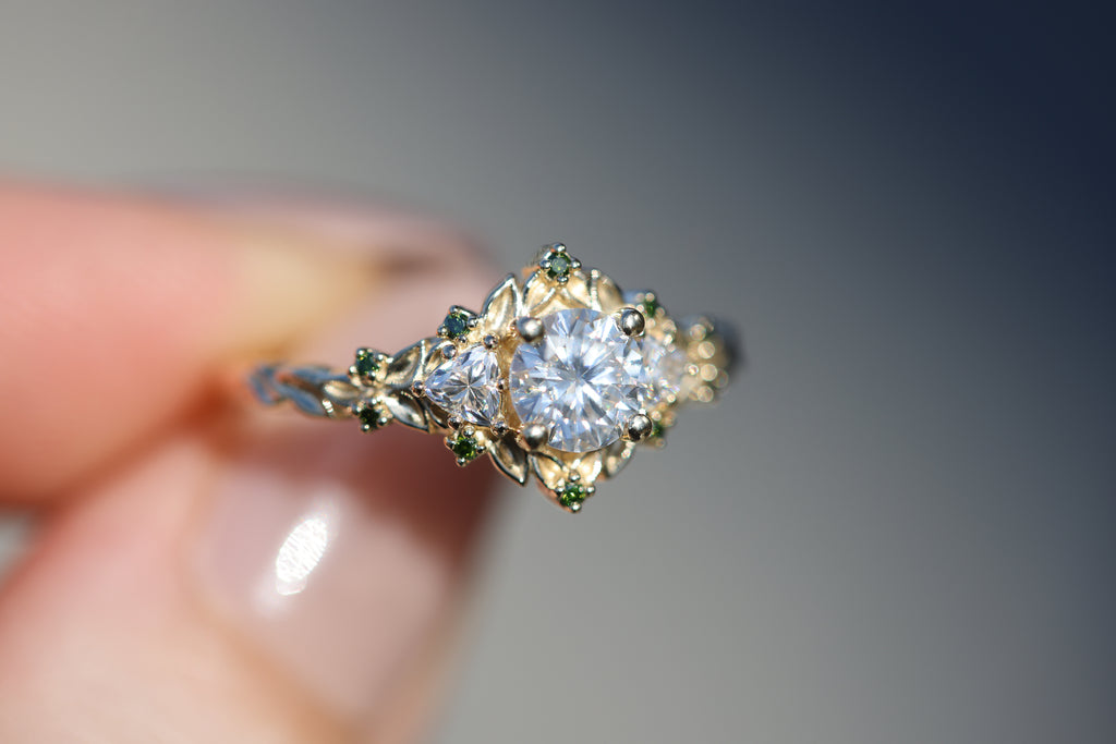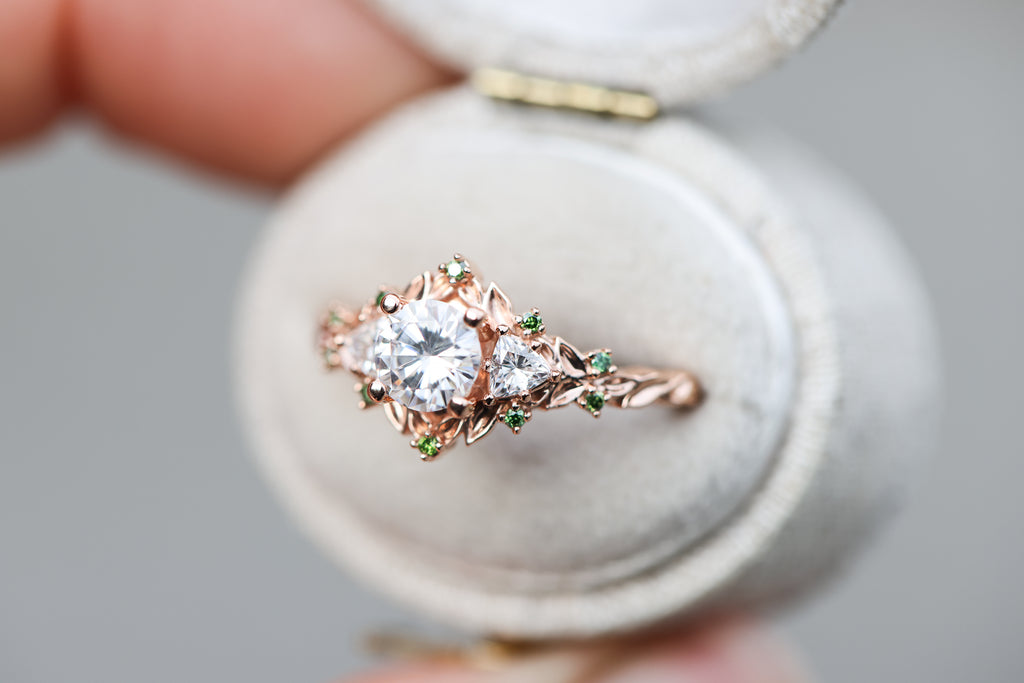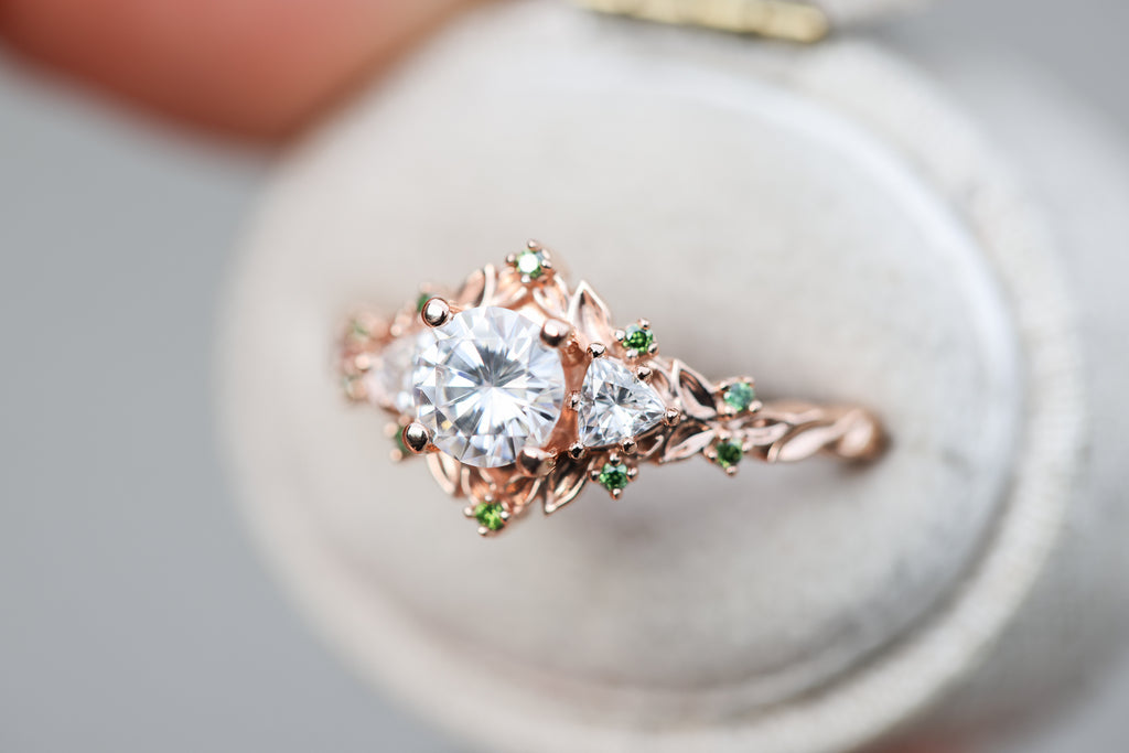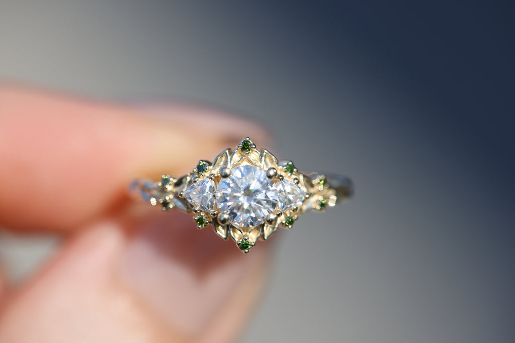 Briar rose three stone with 5.5mm round moissanite and green diamonds accents