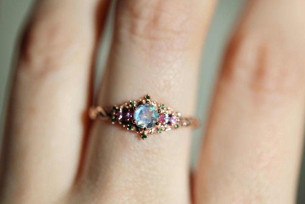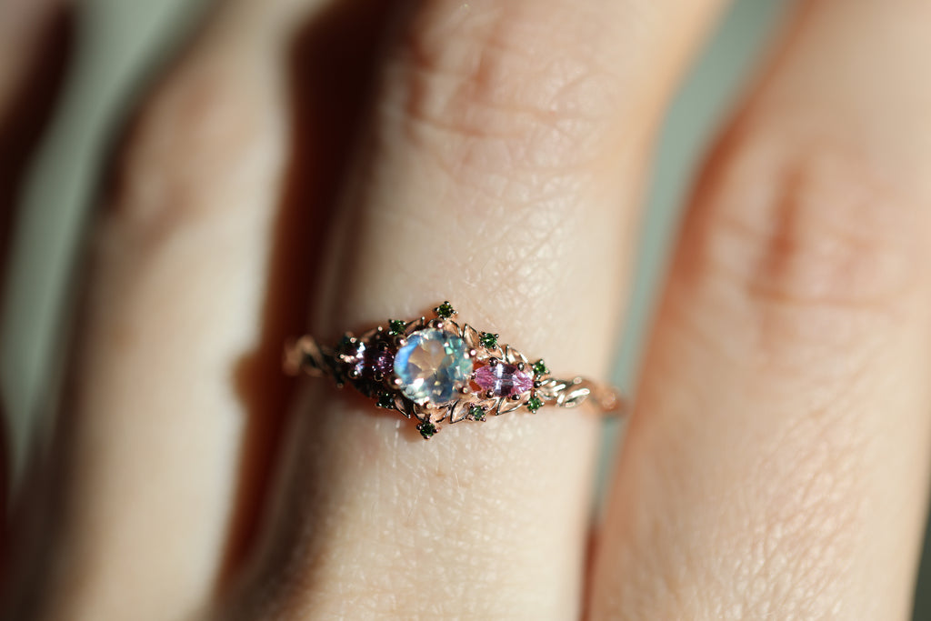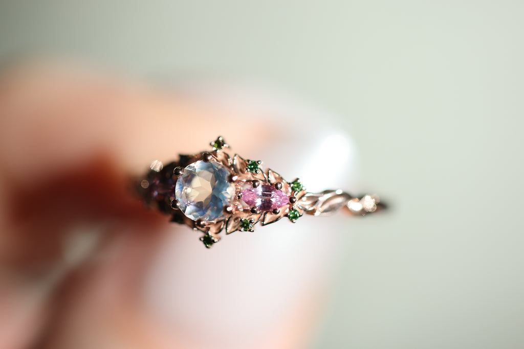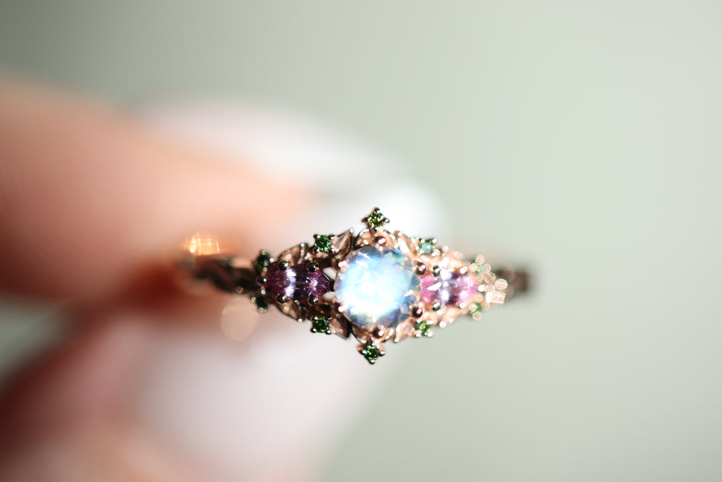 Briar rose three stone with 5mm round moonstone and pink sapphire/green diamond accents