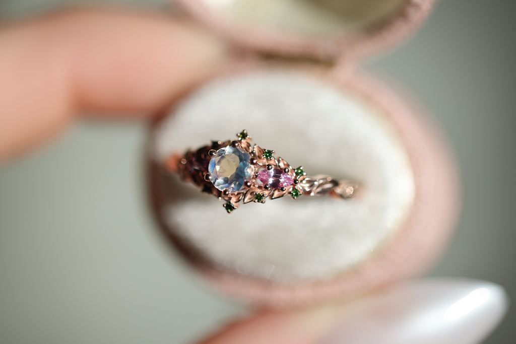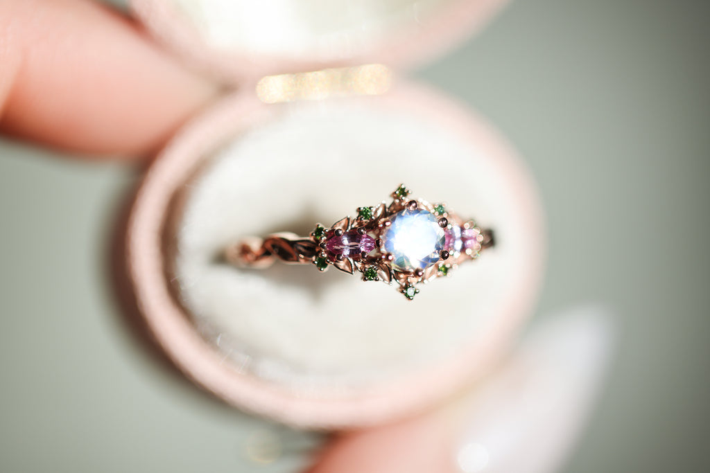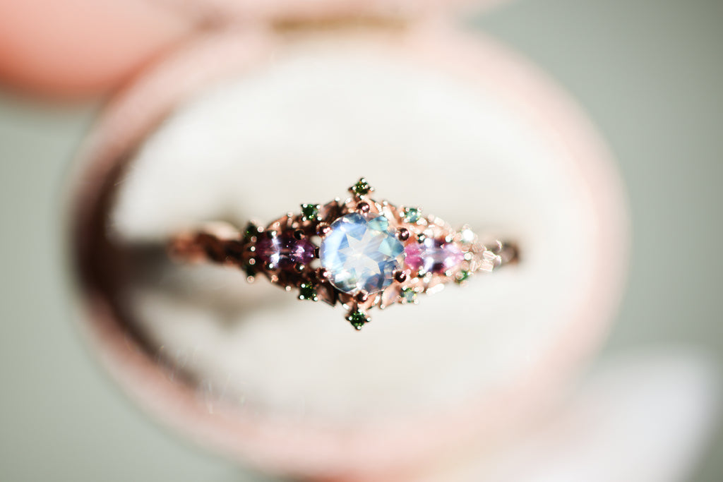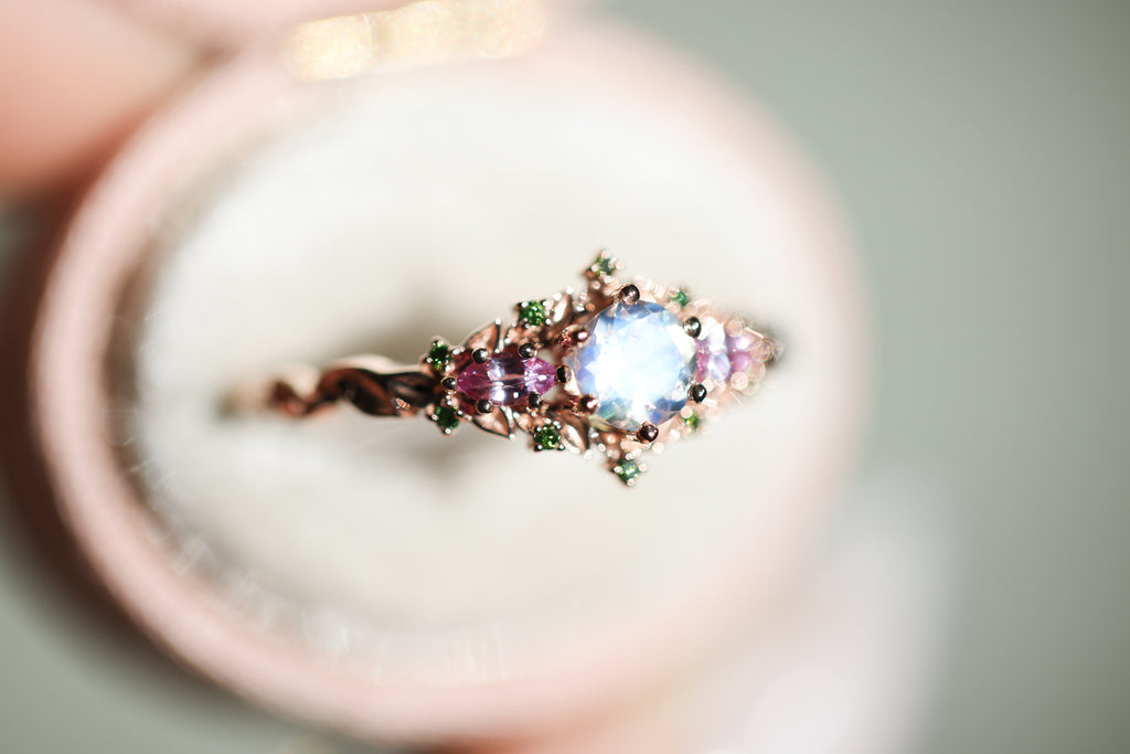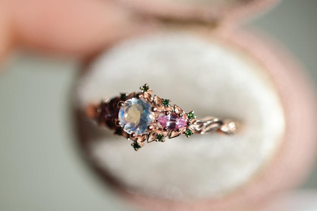 Briar rose three stone with 5mm round moonstone and pink sapphire/green diamond accents