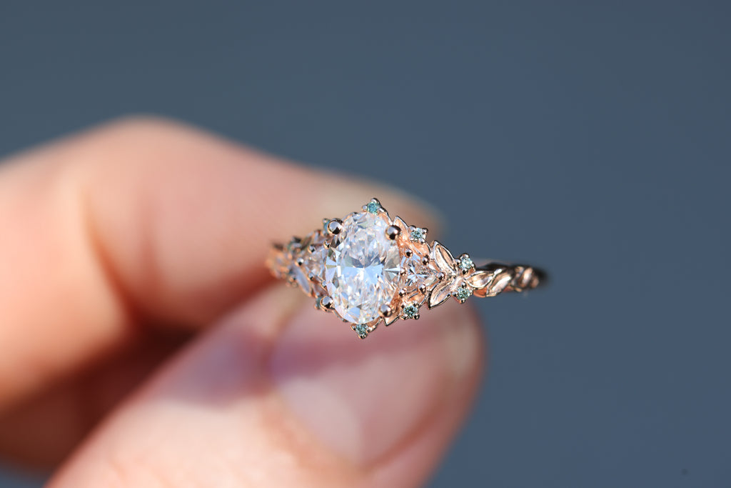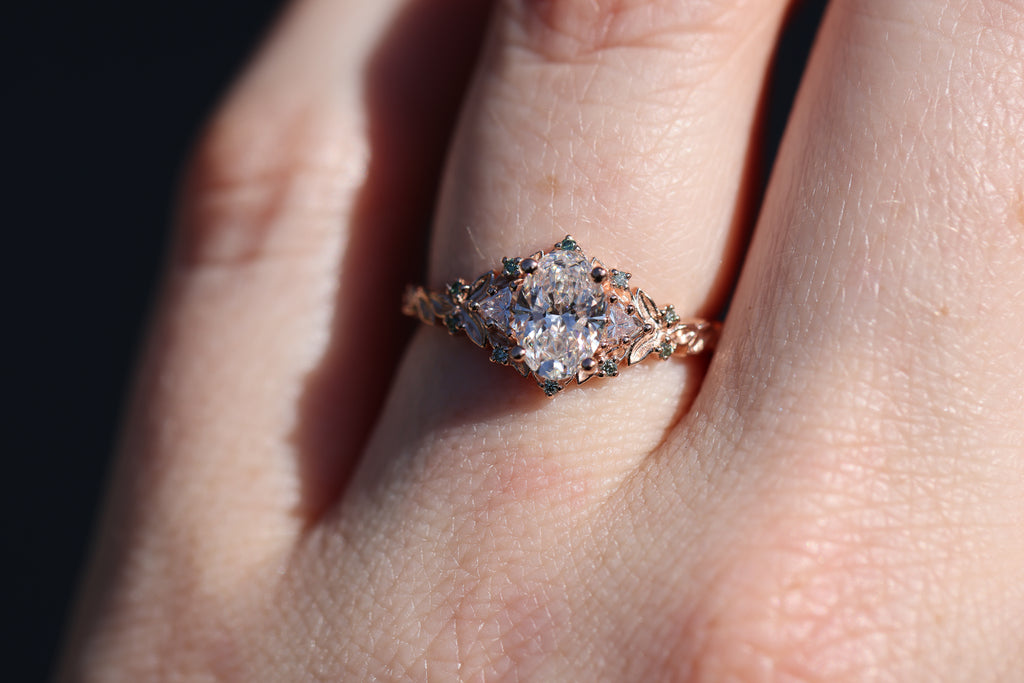 Briar Rose Three Stone with .7ct Oval Lab Diamond and Mint Diamond Accents