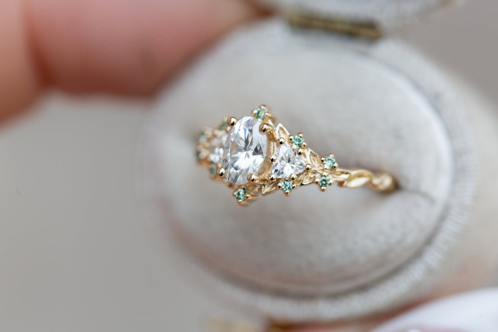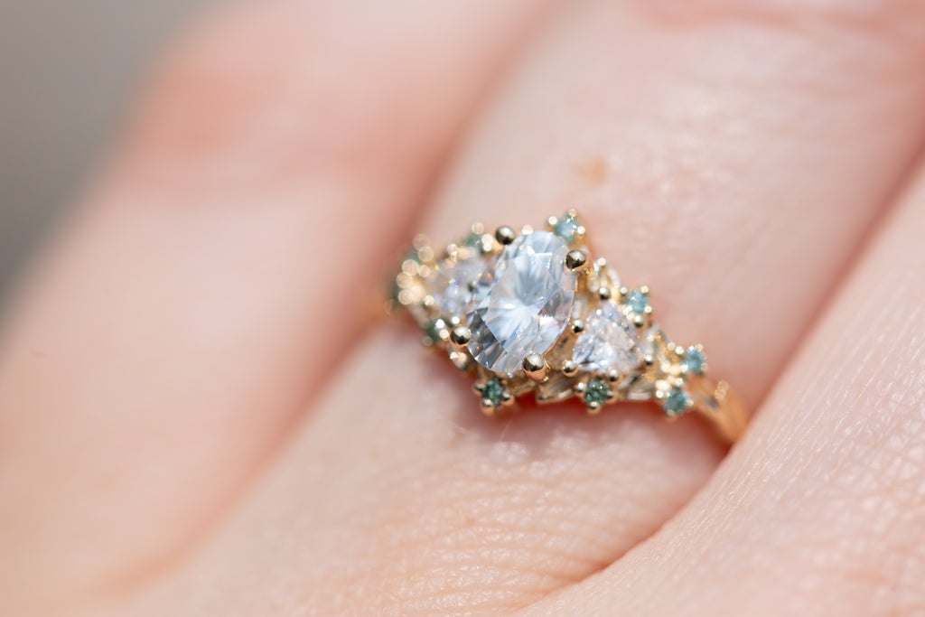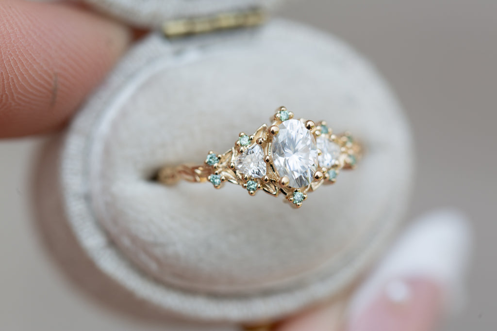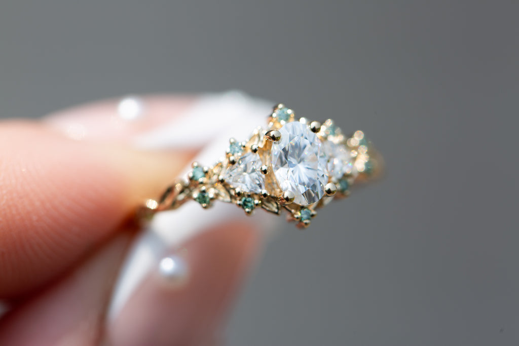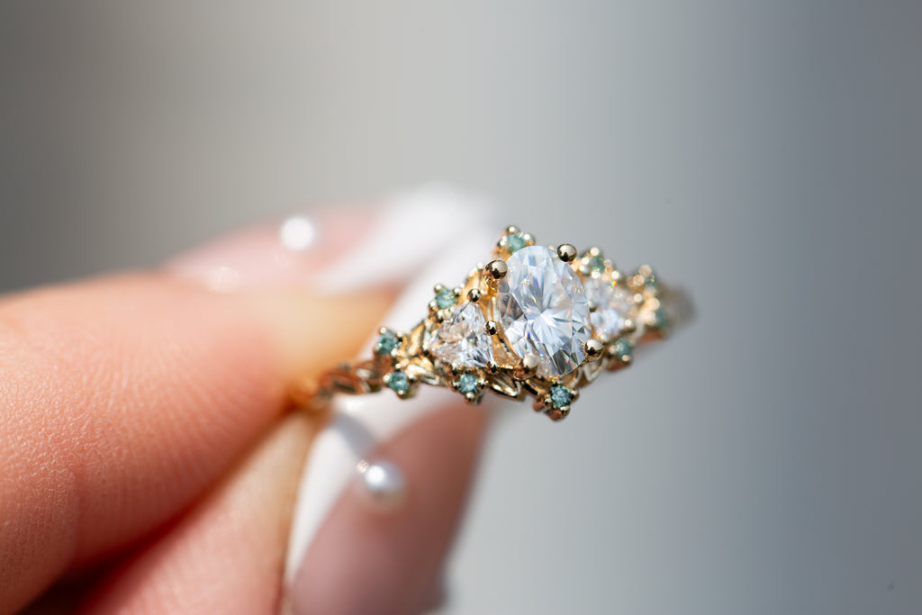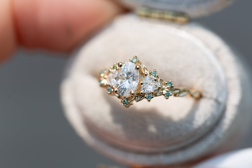 - 1mm mint irradiated diamond accent stones placed along the leaves