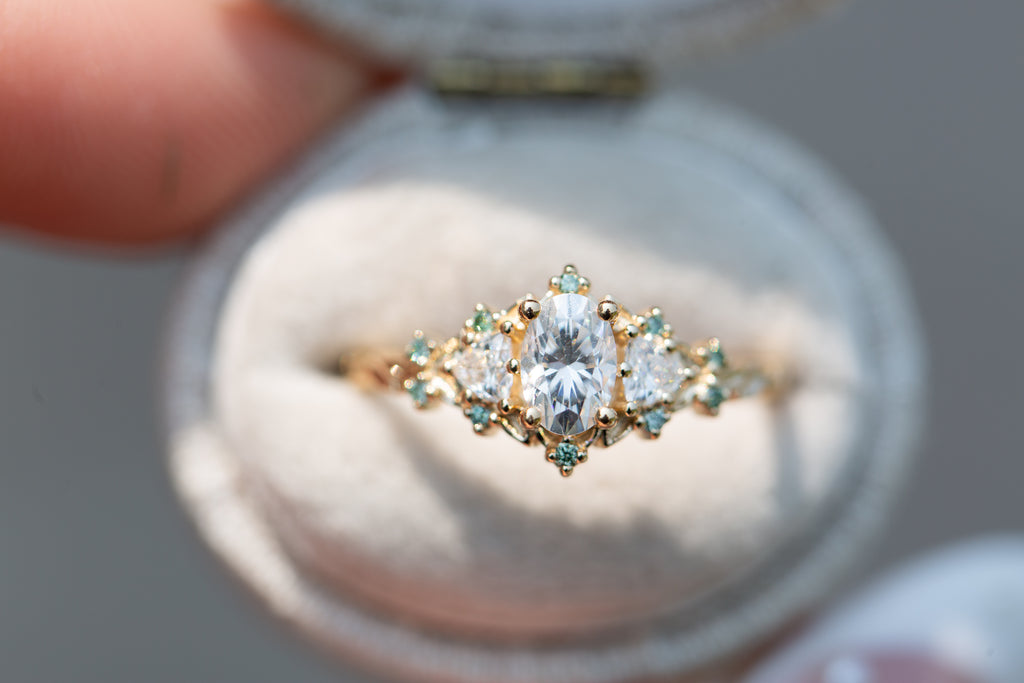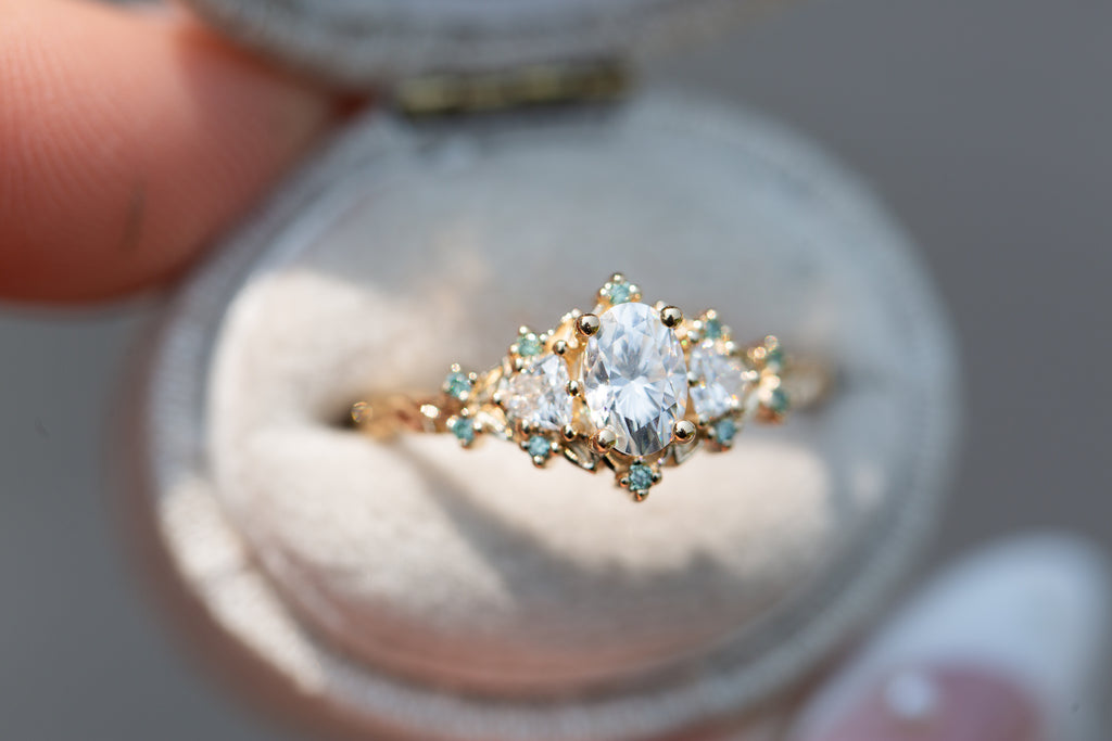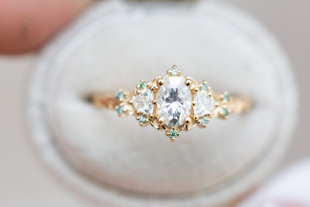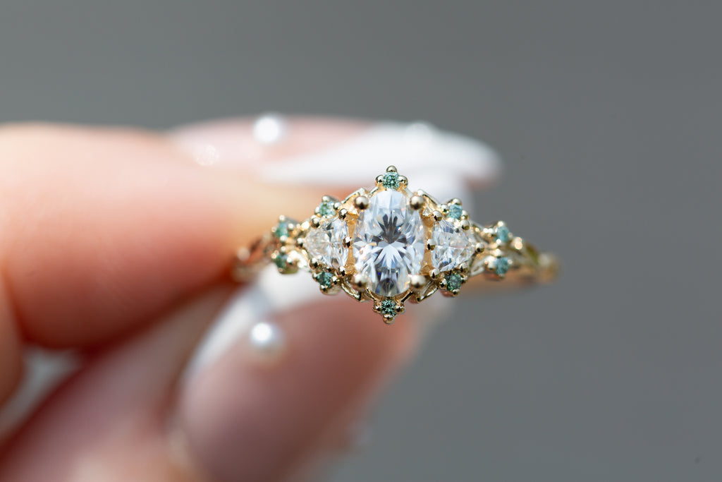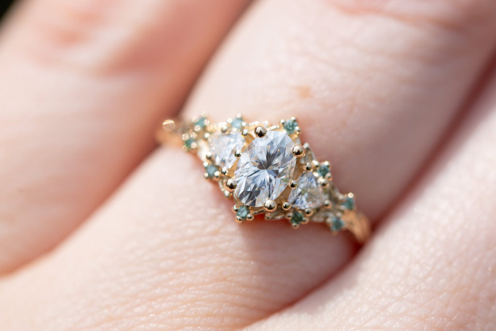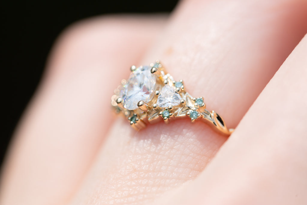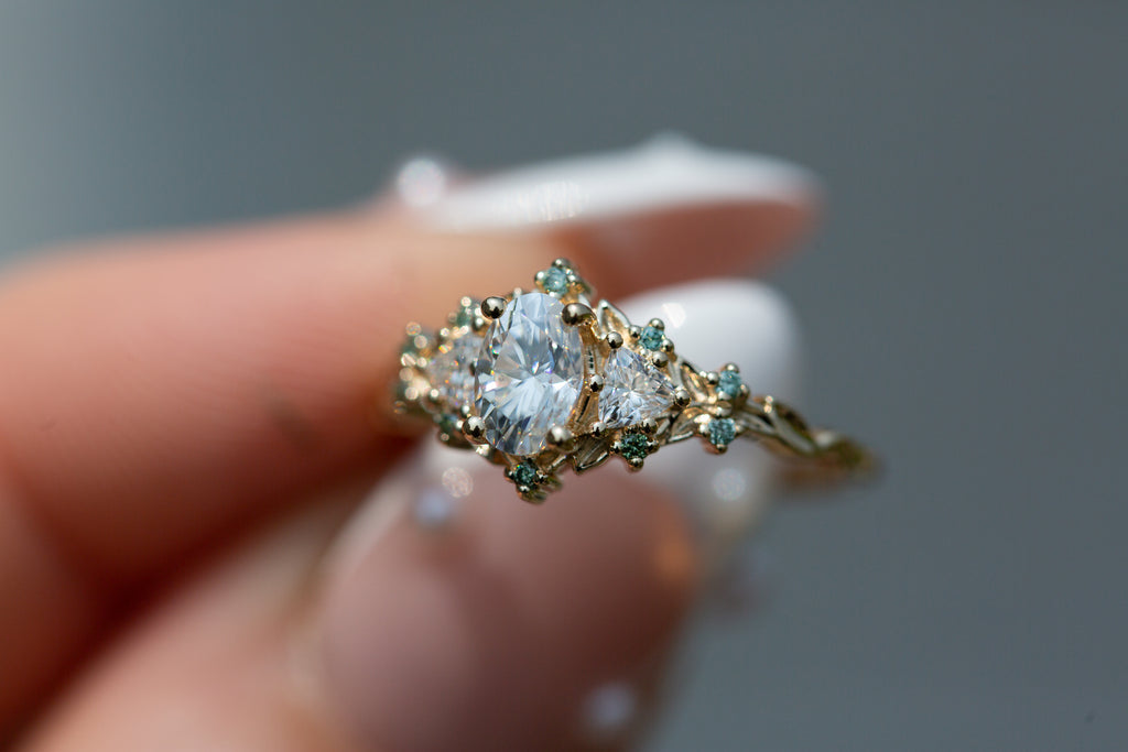 - 1mm mint irradiated diamond accent stones placed along the leaves