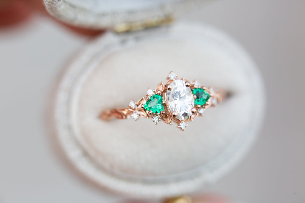 Briar rose three stone with oval moissanite and lab emerald (fairy queen ring)