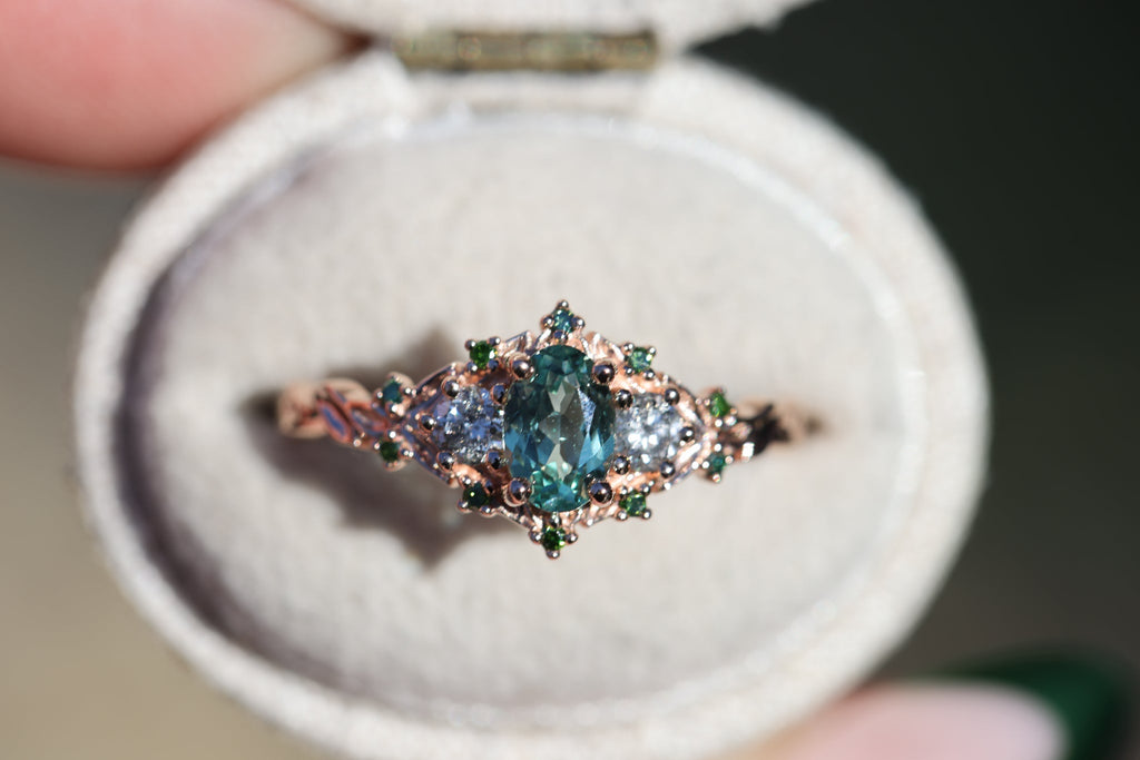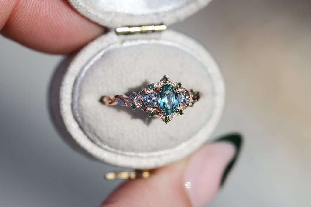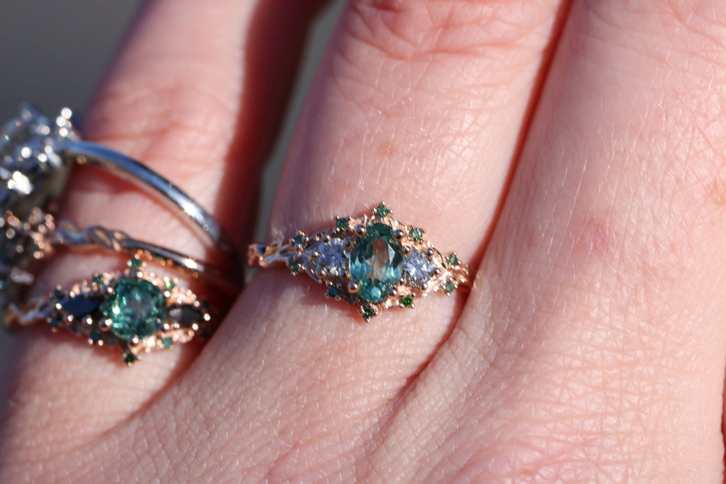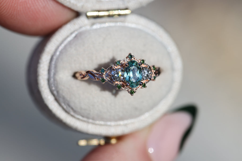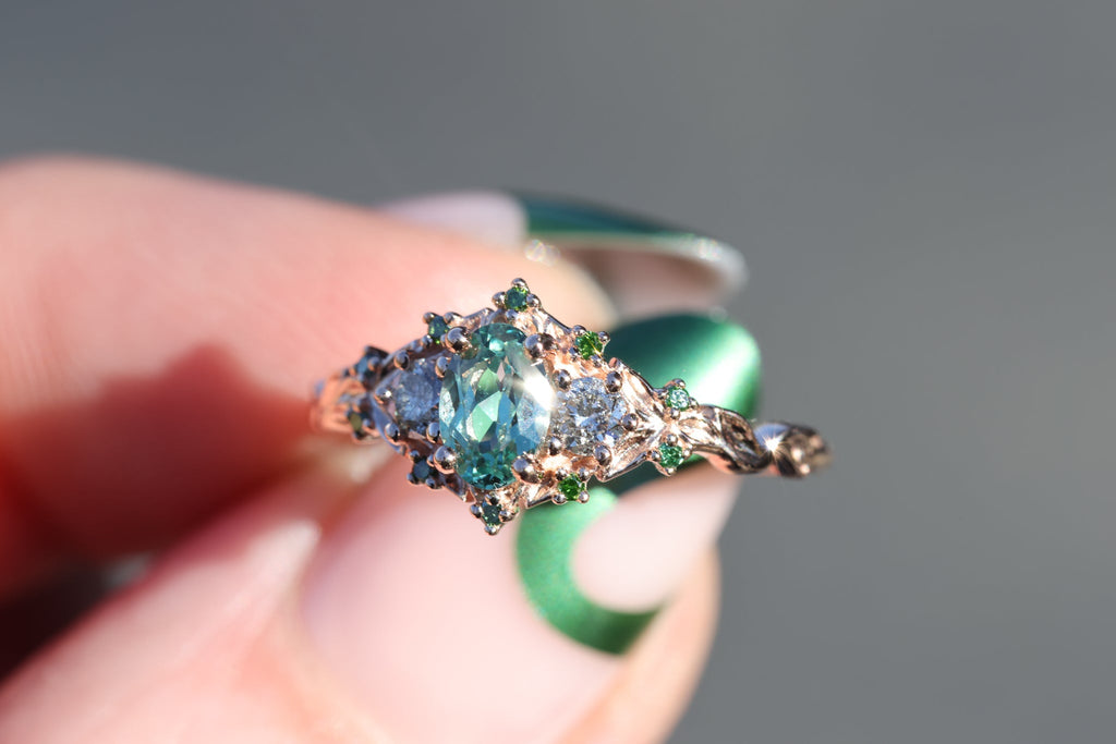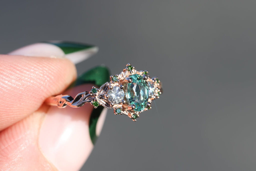Briar rose three stone with oval lab green sapphire and salt and pepper diamonds