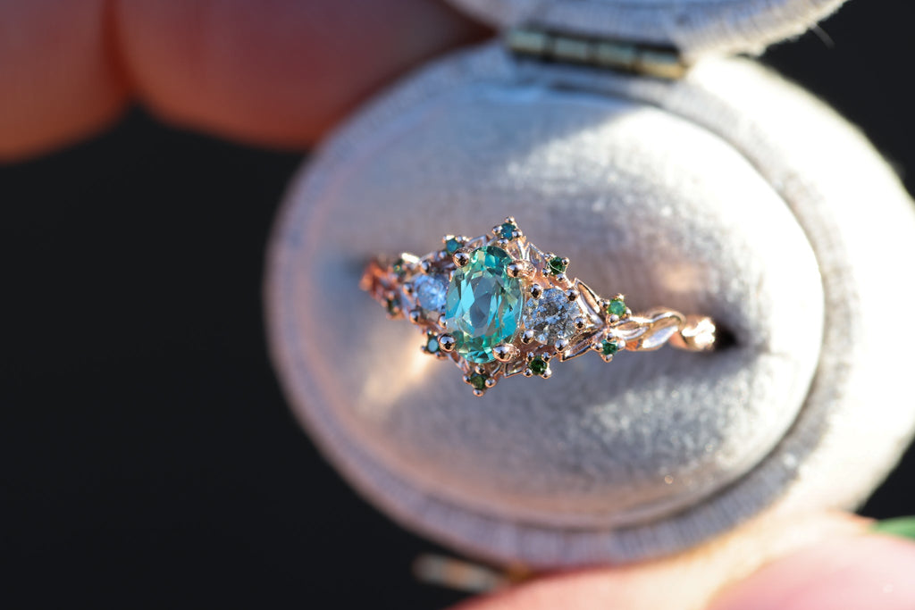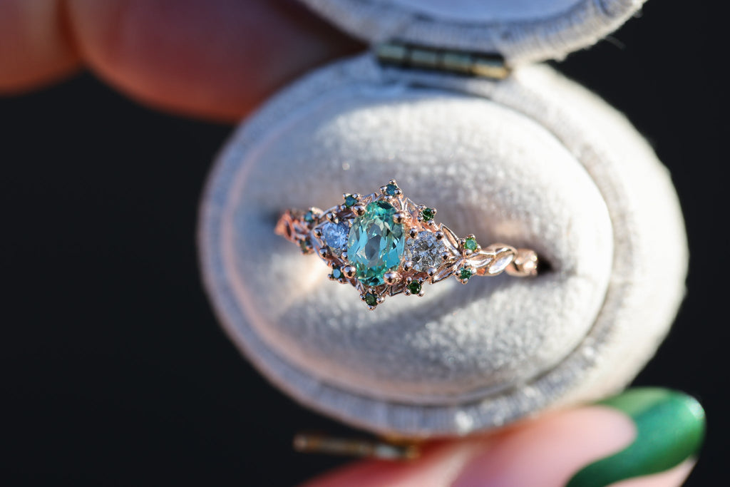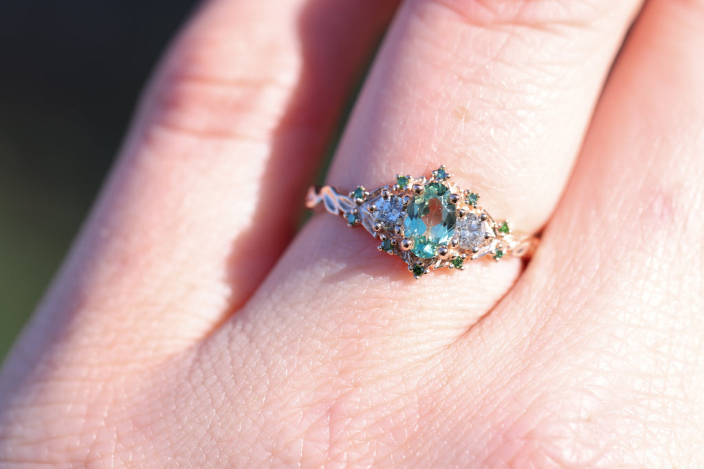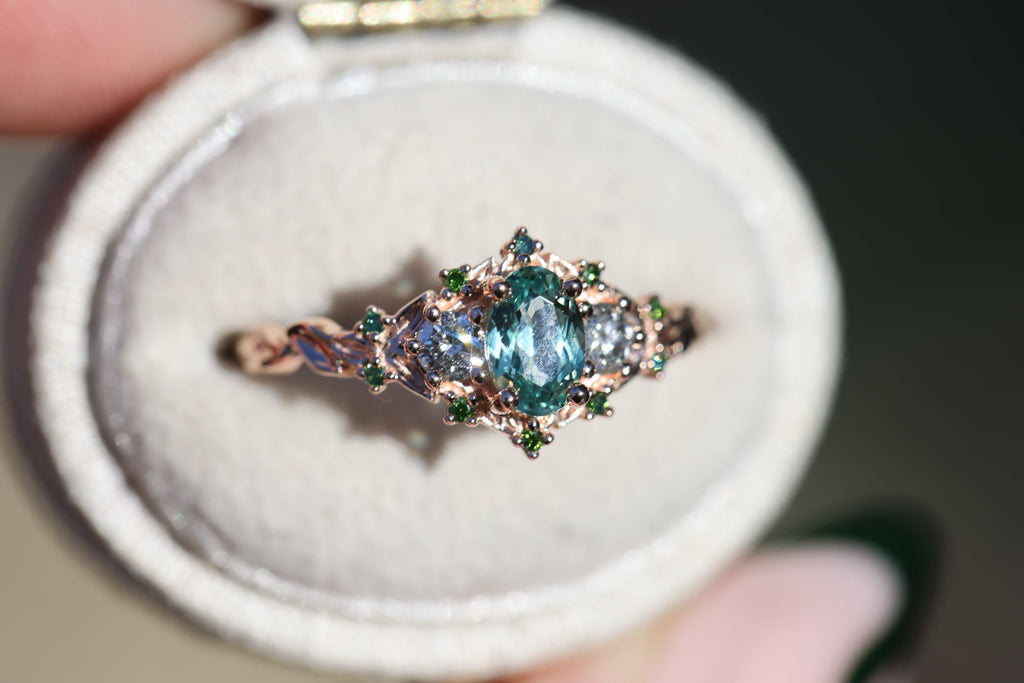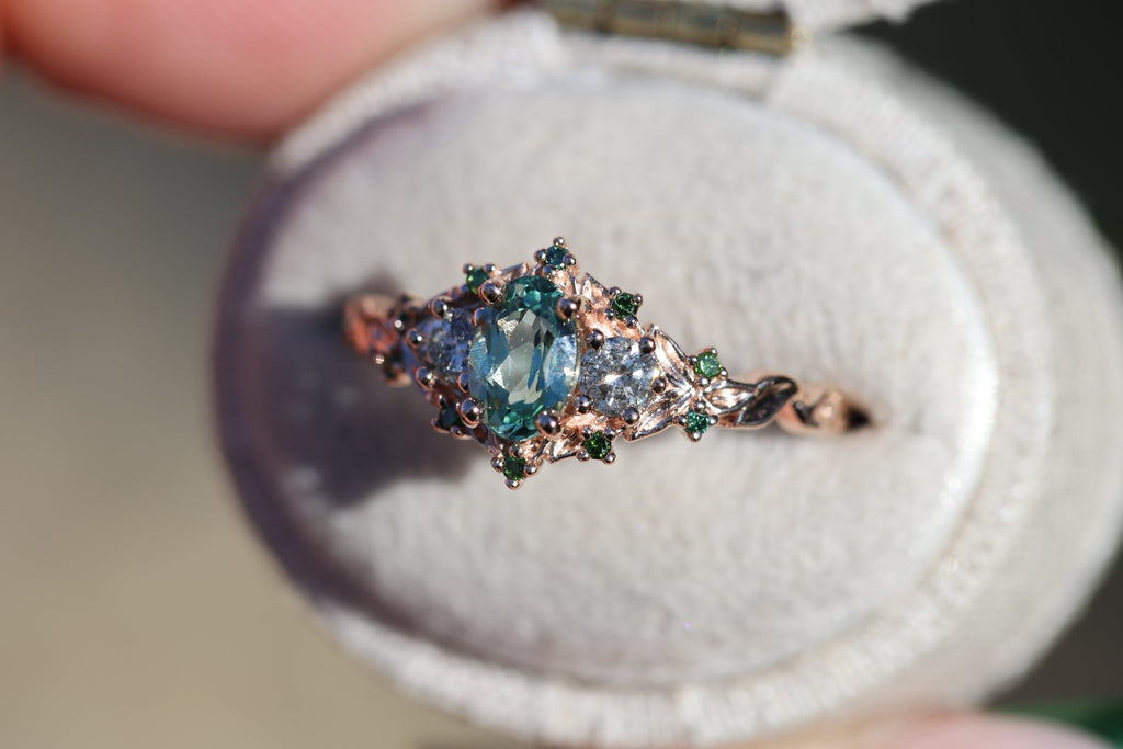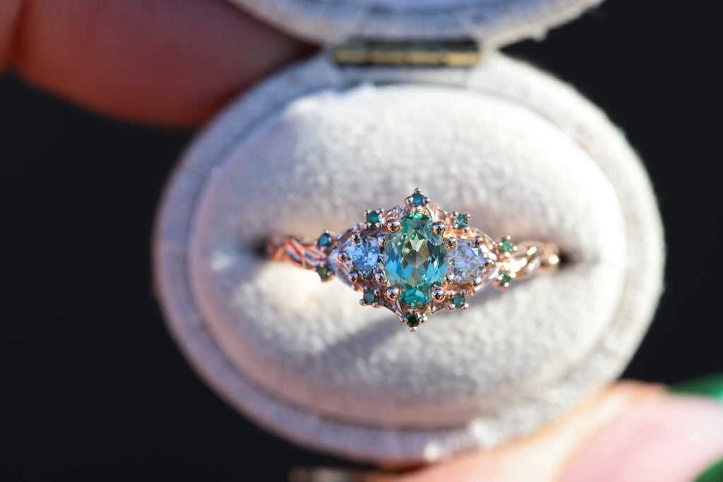 Briar rose three stone with oval lab green sapphire and salt and pepper diamonds