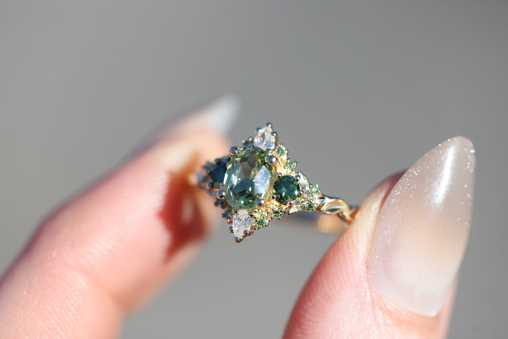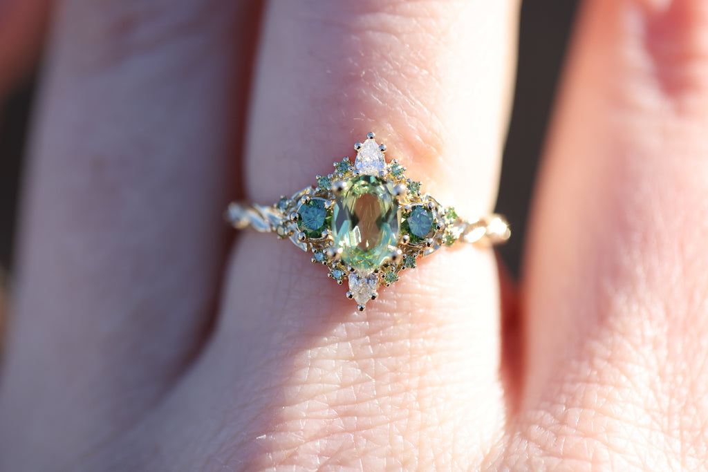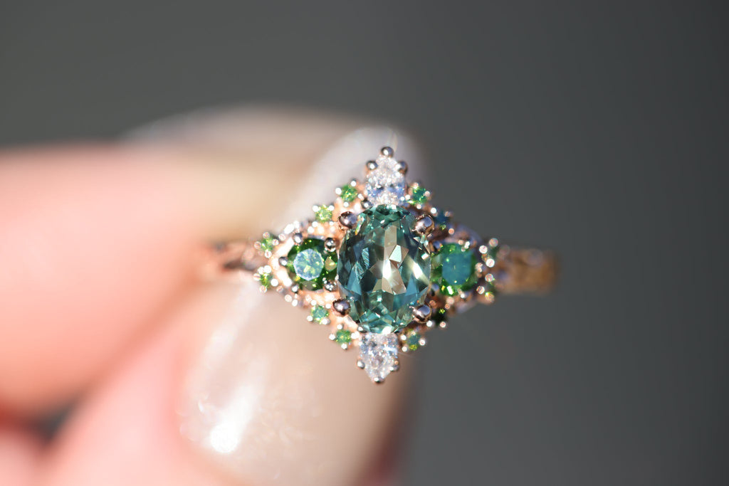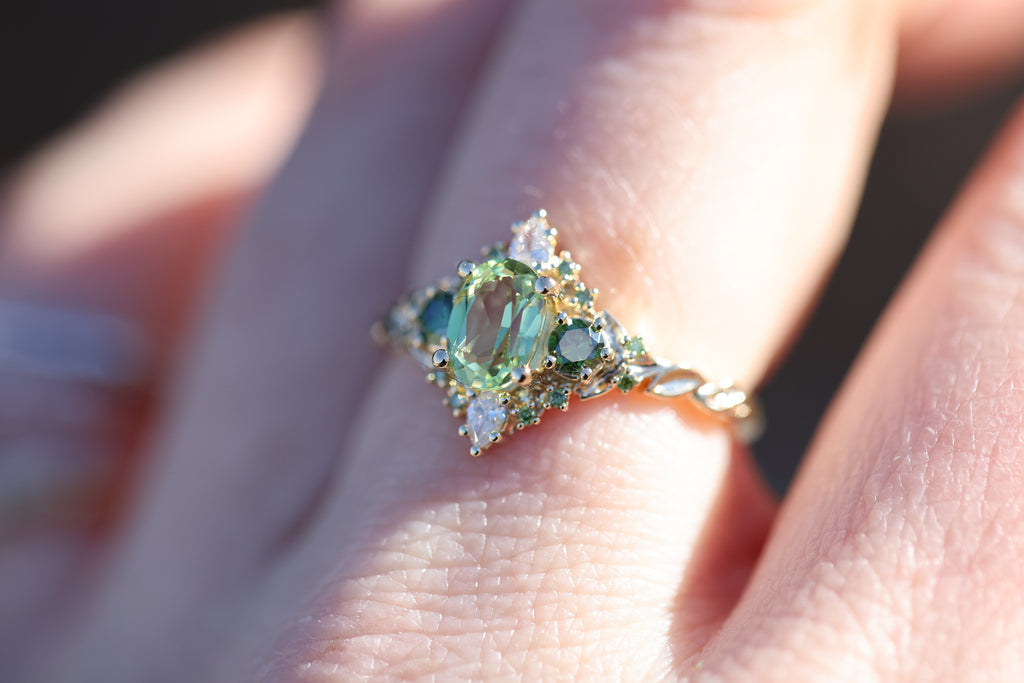 - 7x5mm oval lab green sapphire center. This is green in color (PLEASE NOTE it is a lighter green that can shift to a more medium color in different lighting), metal will also heavily affect the color with white gold making it appear lighter.
