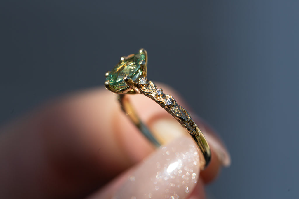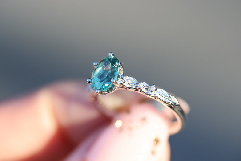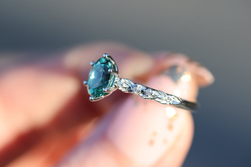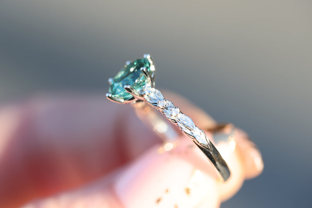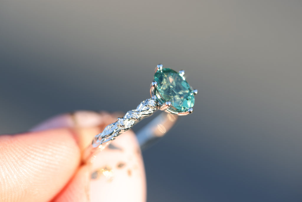 - 8x6mm oval lab green sapphire. This is green in color (PLEASE NOTE it is a lighter green that can shift to a more medium color in different lighting). Metal will also heavily affect the color with white gold making it appear lighter.