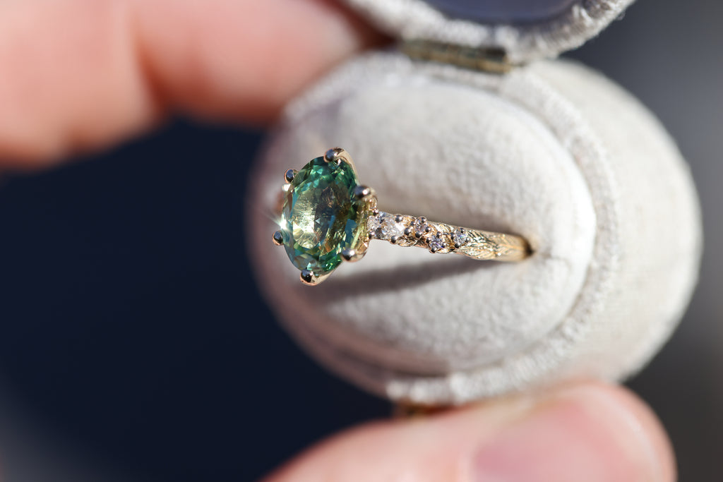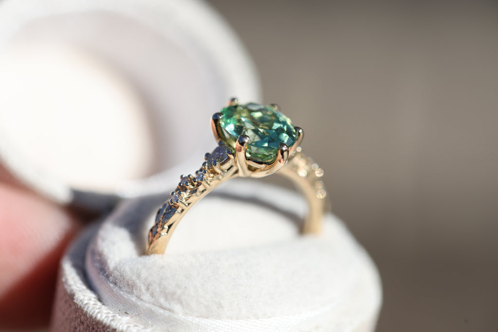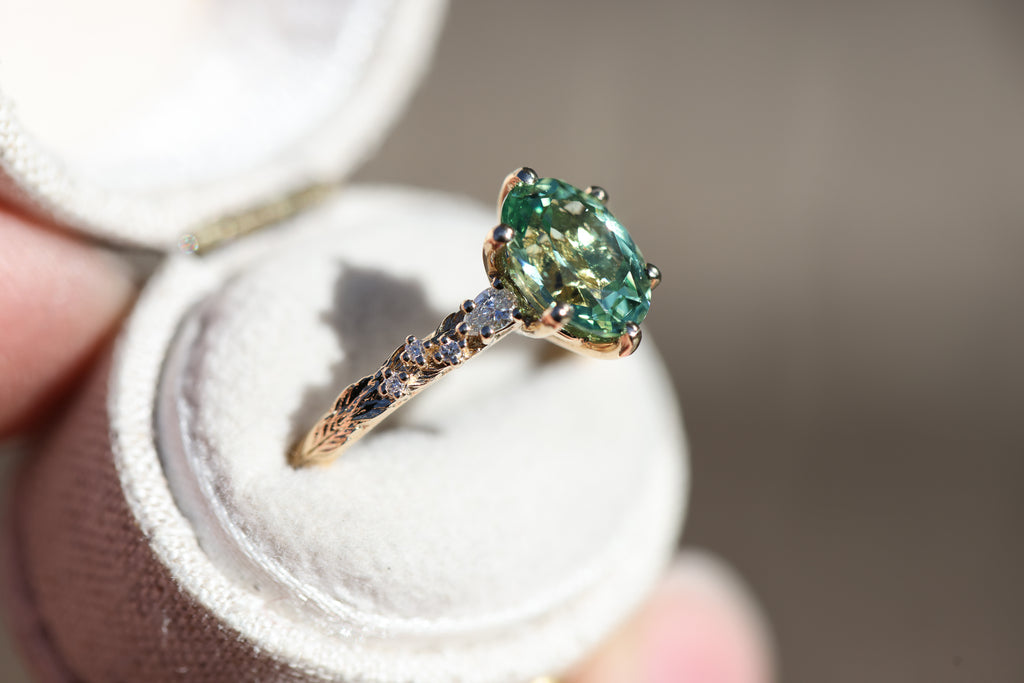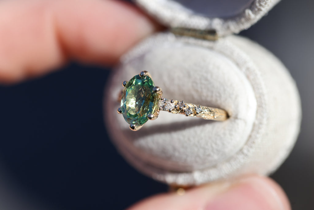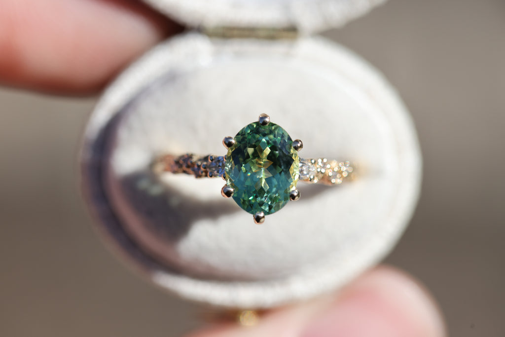 9x7mm oval lab green sapphire (lab green sapphires can be a lighter green in certain lighting and are not a great option if you are wanting a darker or more saturated green stone)