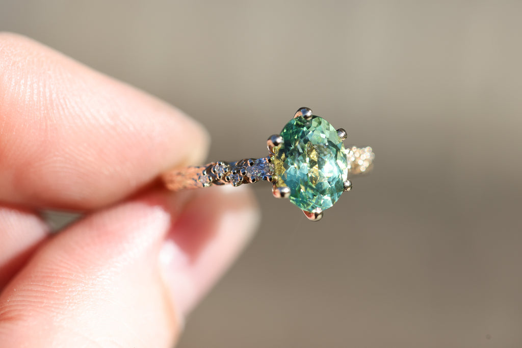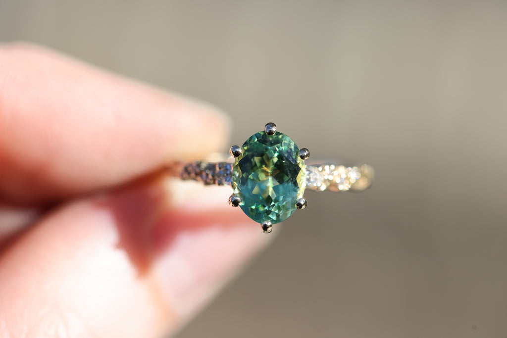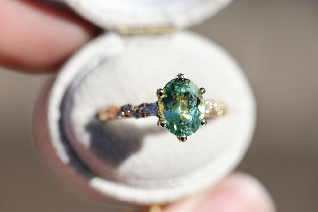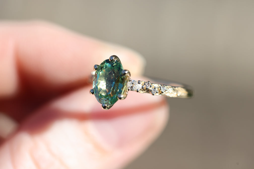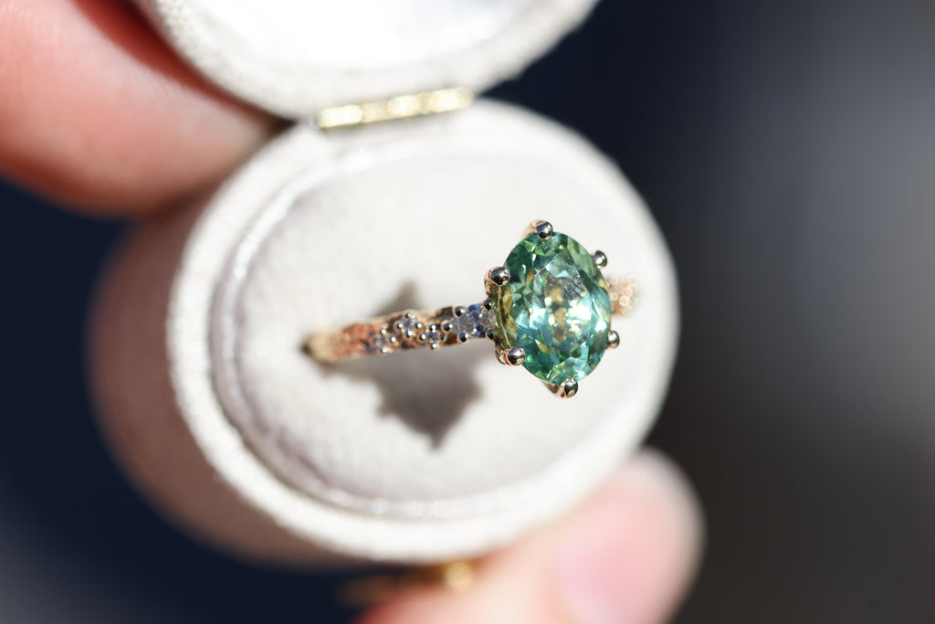 9x7mm oval lab green sapphire (lab green sapphires can be a lighter green in certain lighting and are not a great option if you are wanting a darker or more saturated green stone)