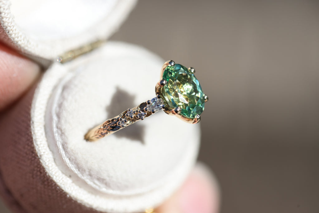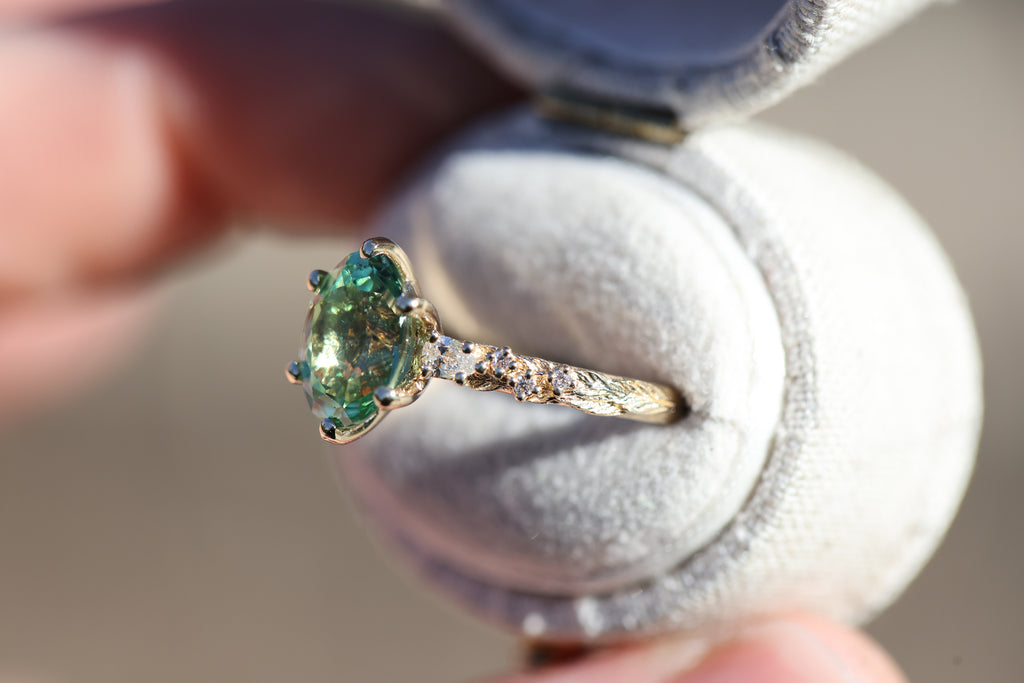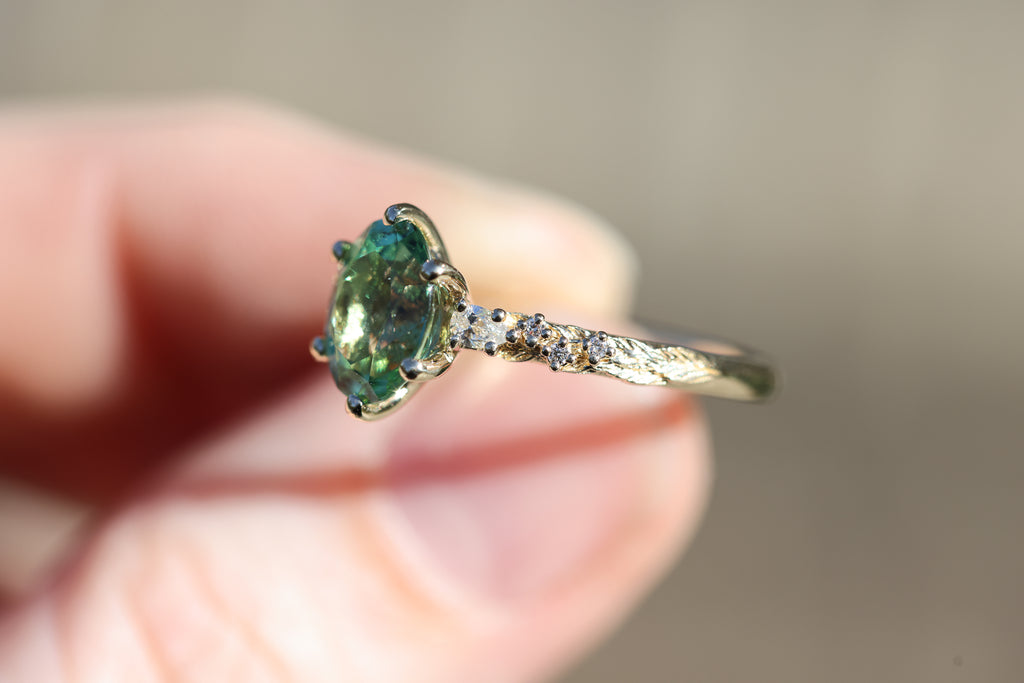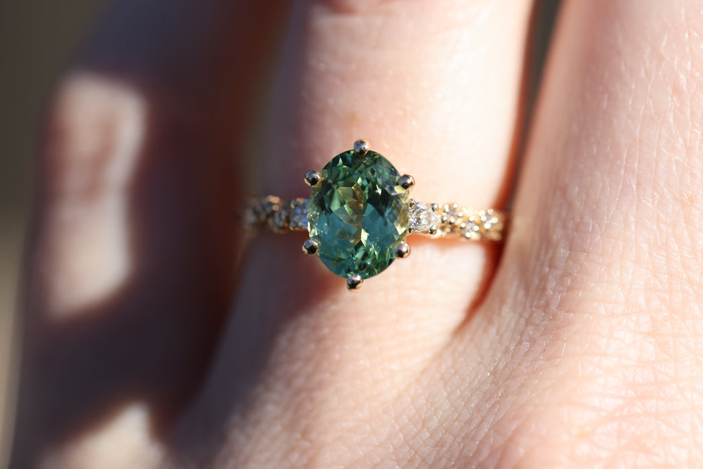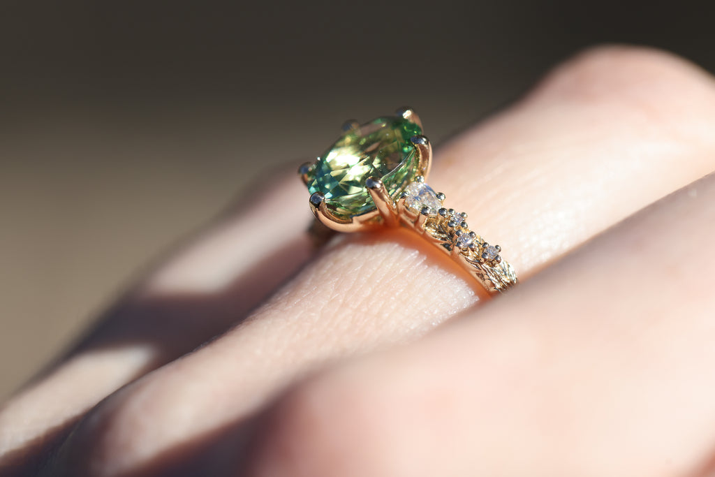 Rowan three stone with lab green sapphire