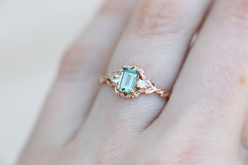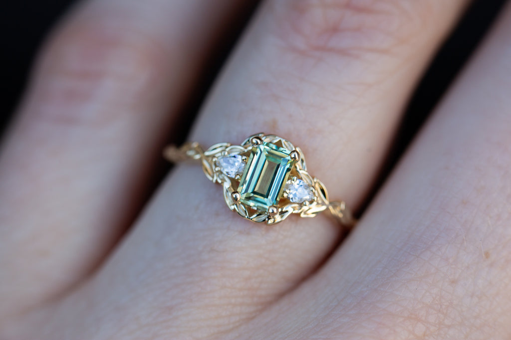 This beautiful ring features my Wisteria setting and a lab green sapphire center stone.