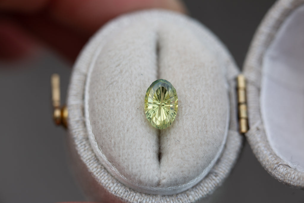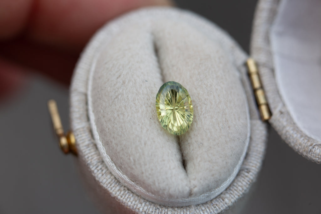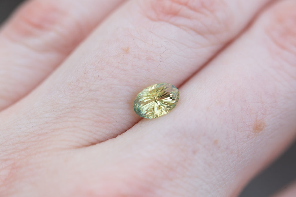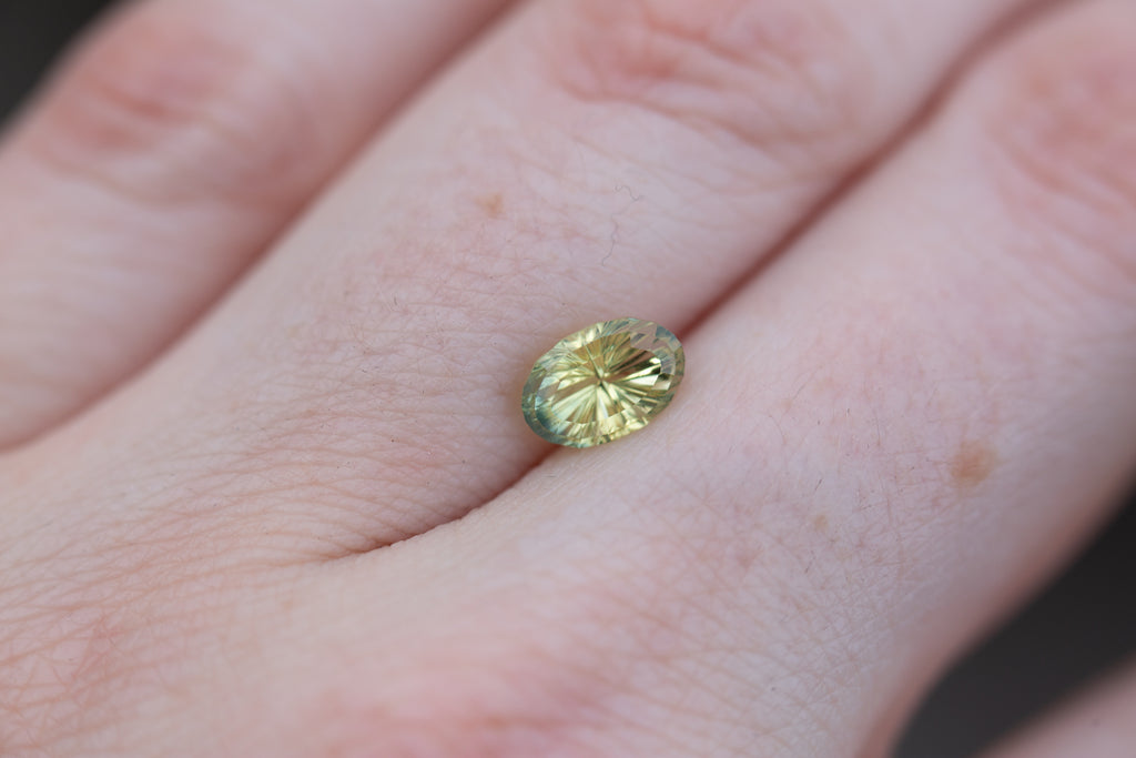 This absolutely stunning starbright cut sapphire from John Dyer gems has unique facets for a beautiful sparkle and one of a kind parti green coloring that almost fades from green to yellow