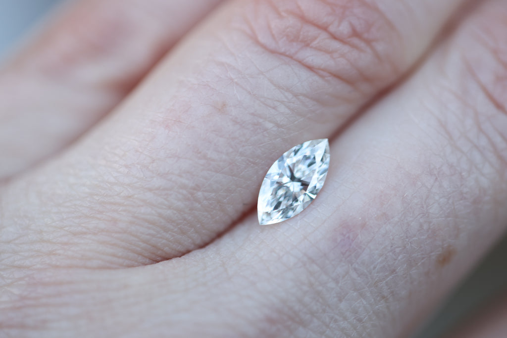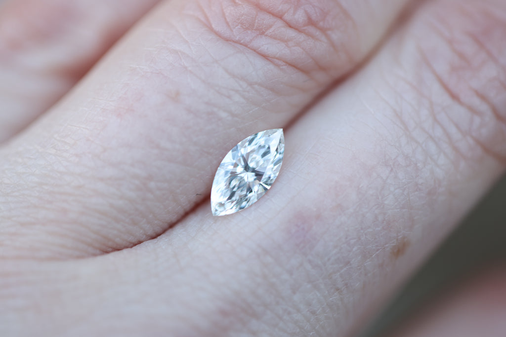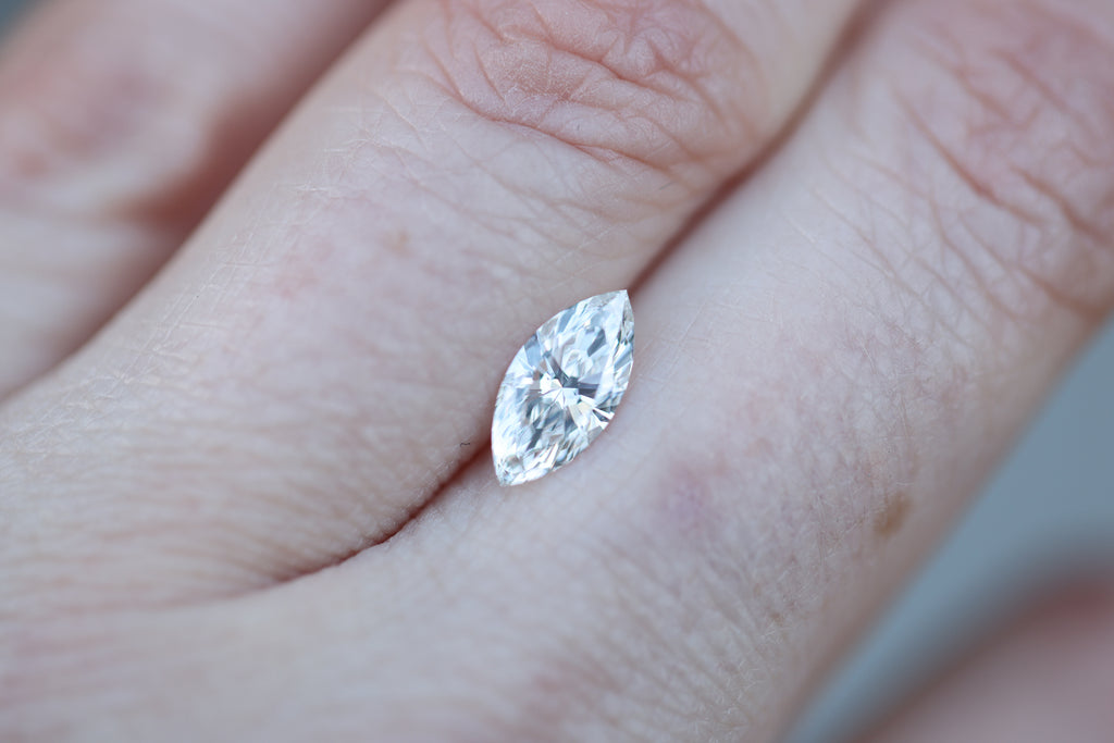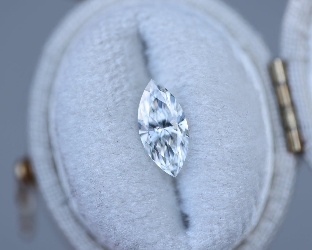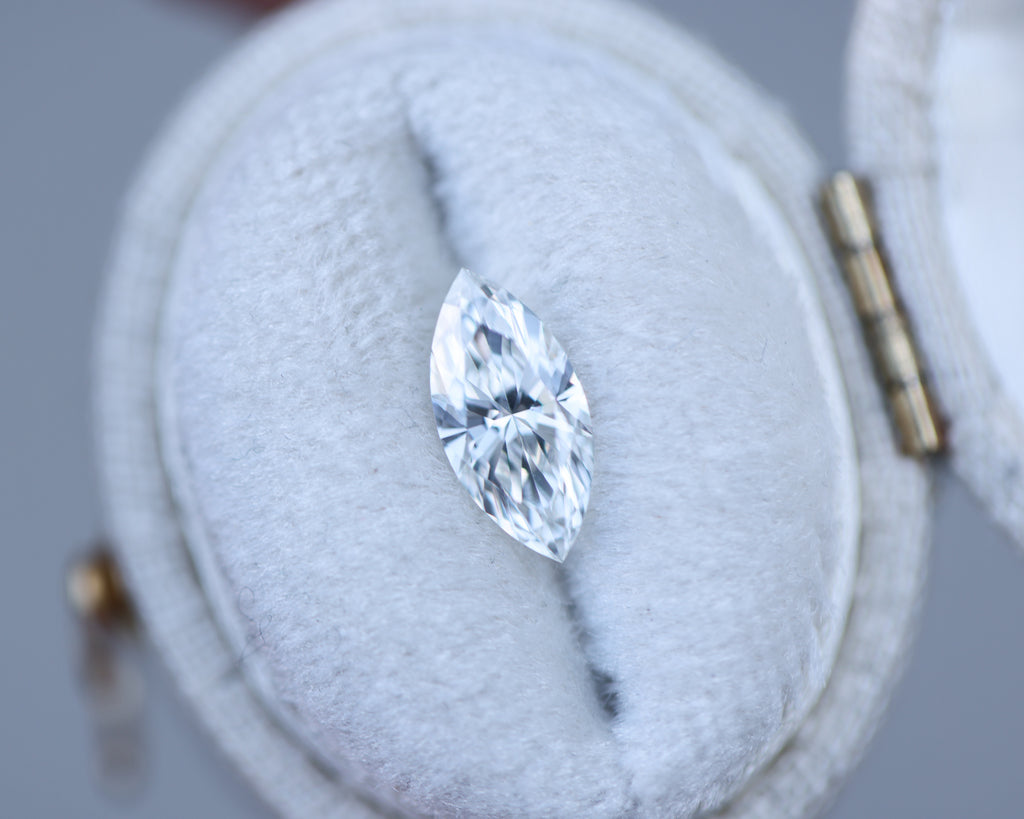 This beauty is a marquise lab diamond with the prettiest sparkle!