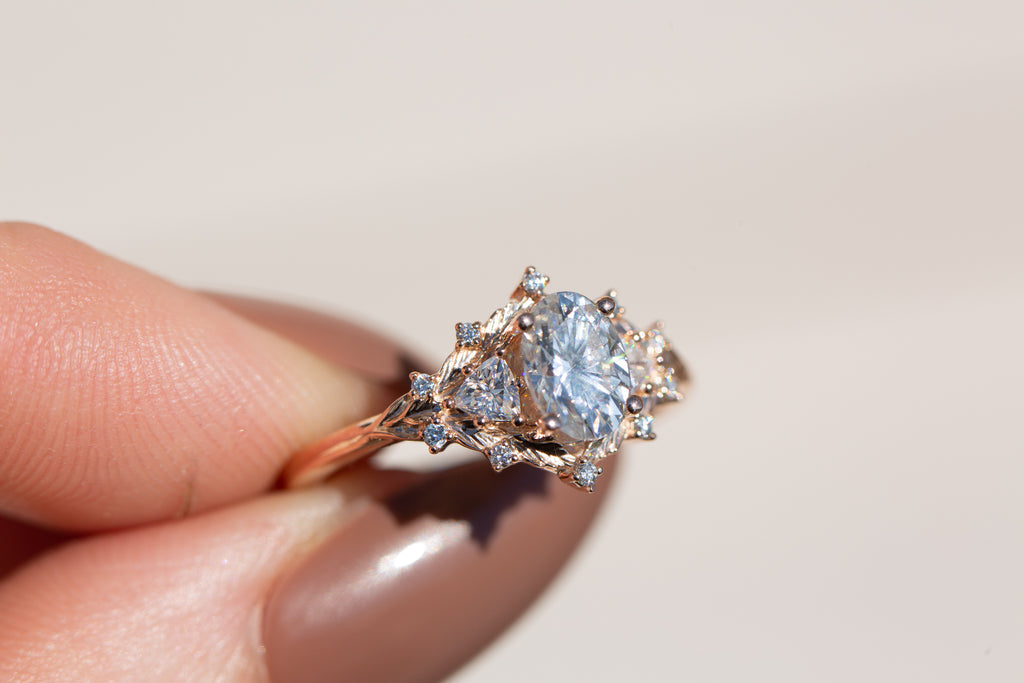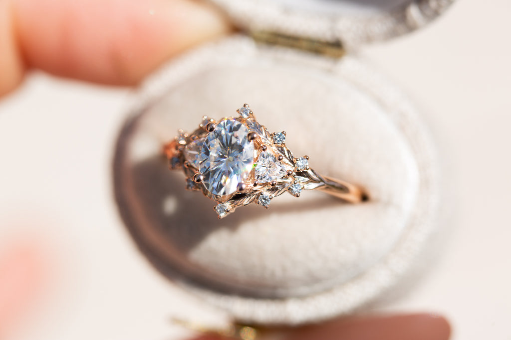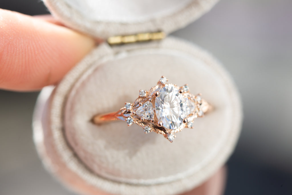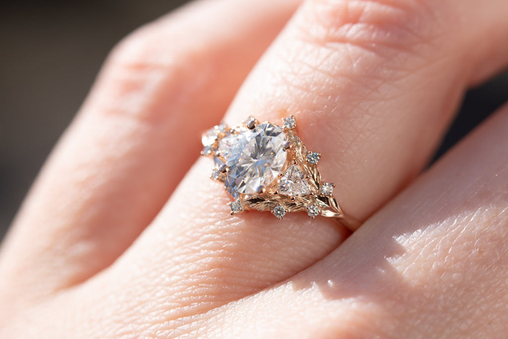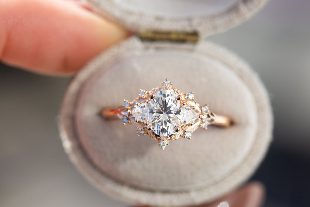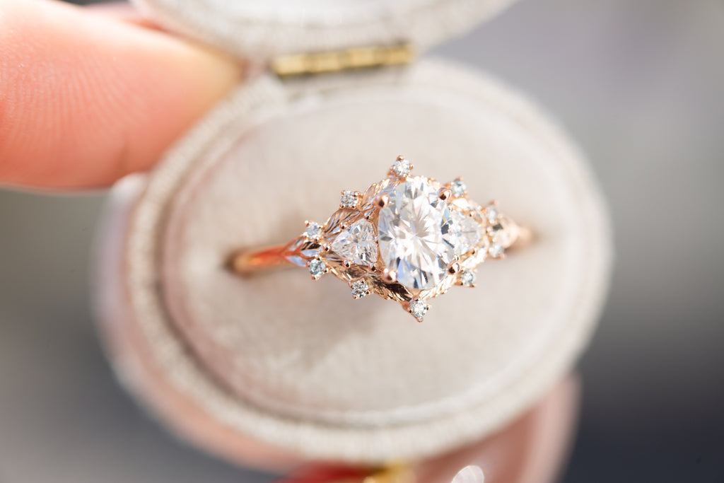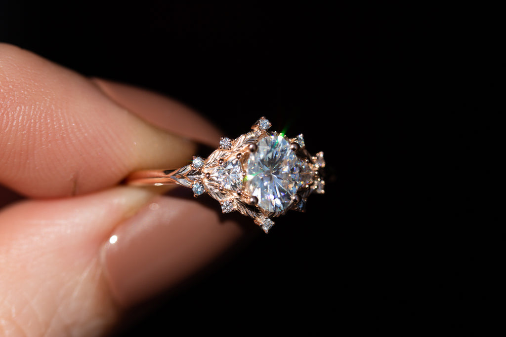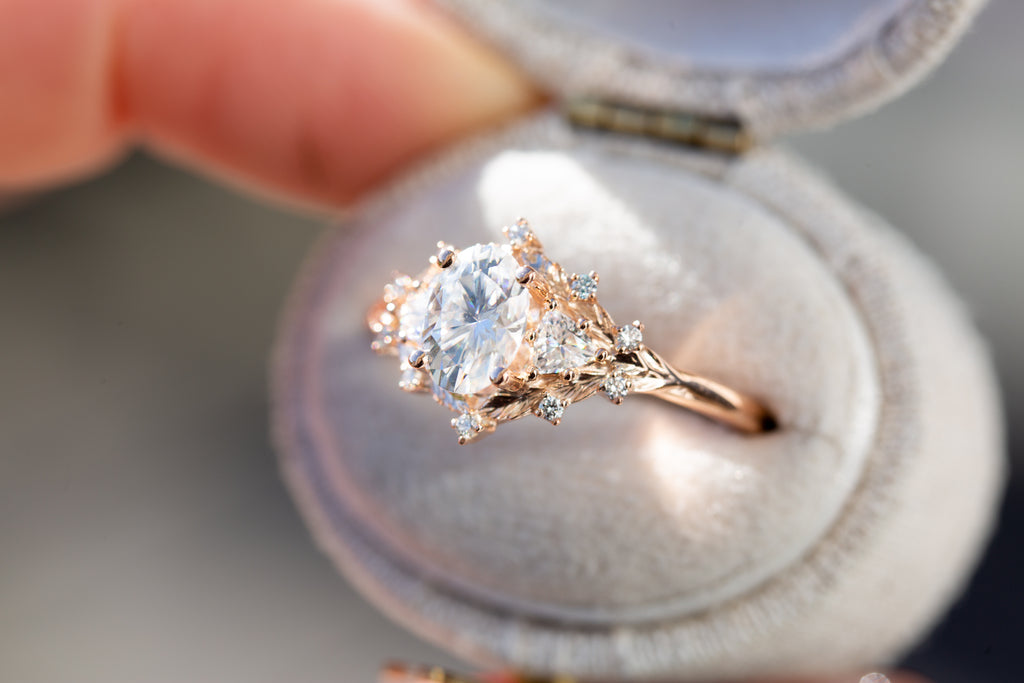 Woodland three stone setting with oval moissanite