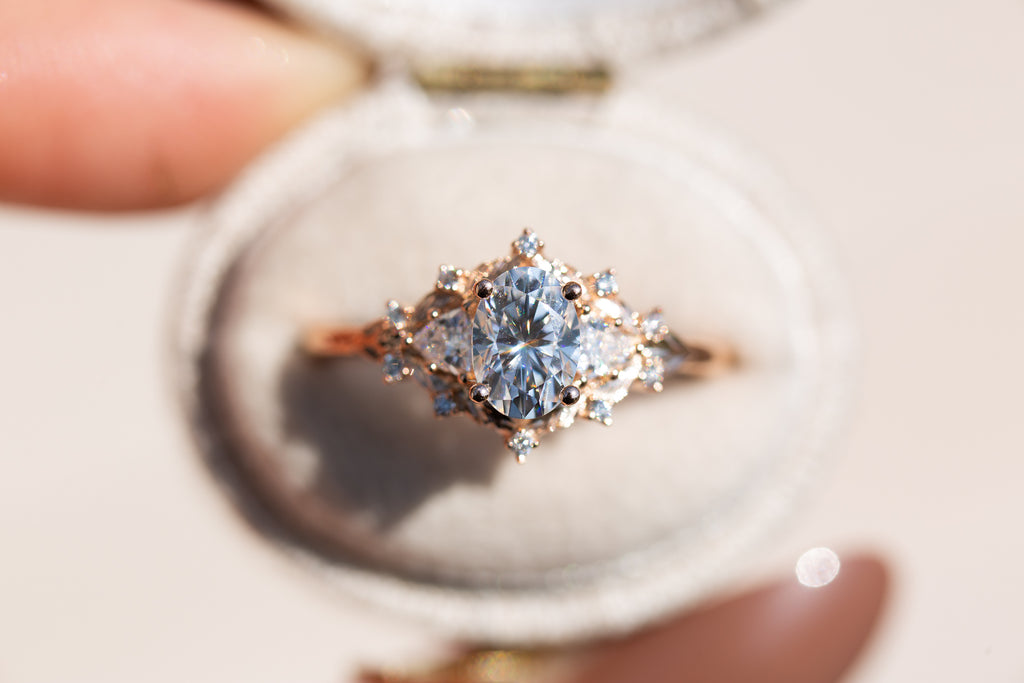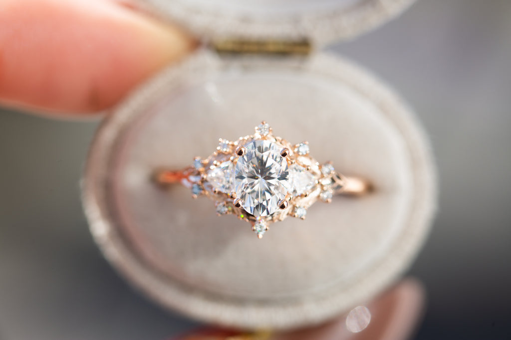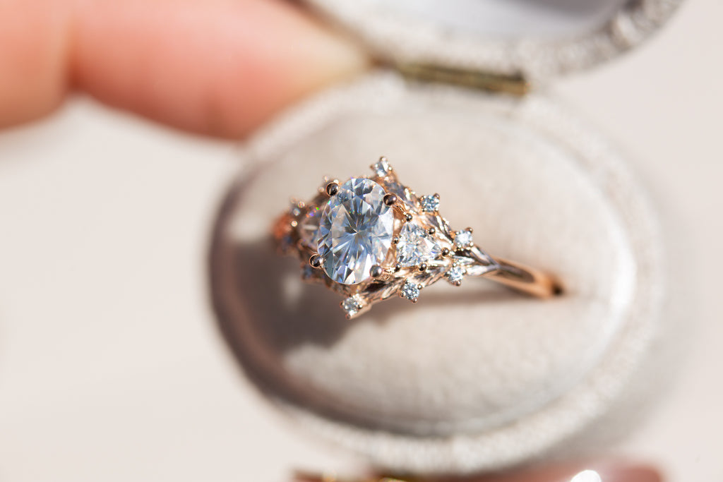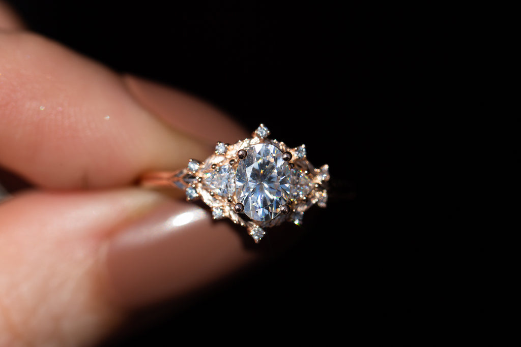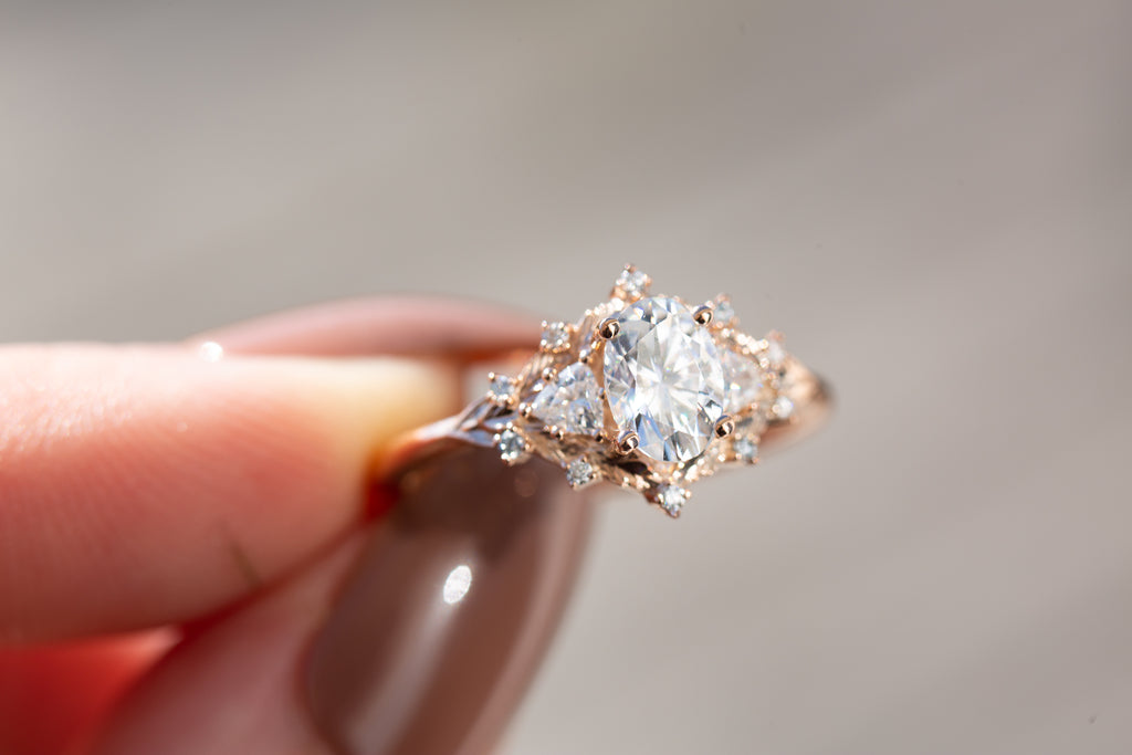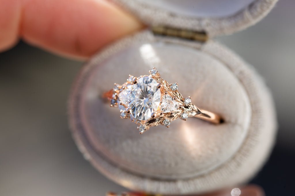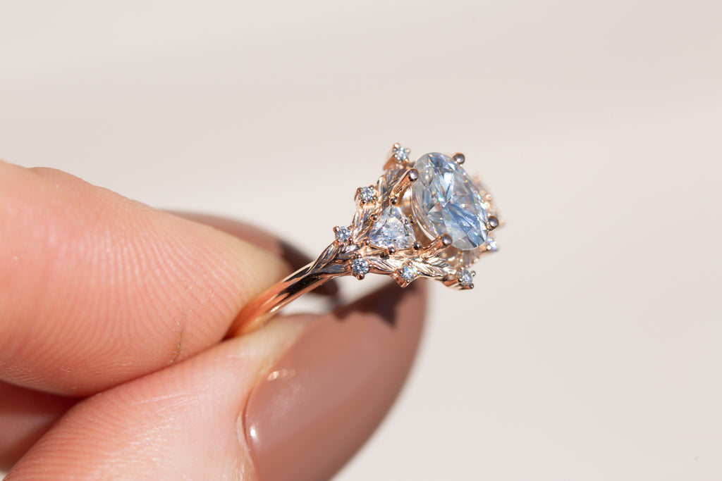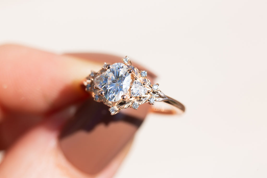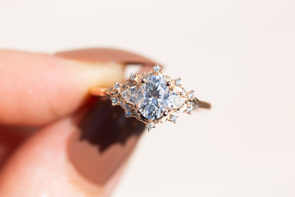 Woodland three stone setting with oval moissanite