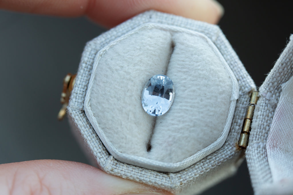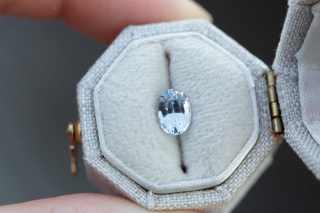 This oval pastel blue sapphire is so lovely! It sometimes looks light purple/pinkish and is just such a beautiful icy stone!