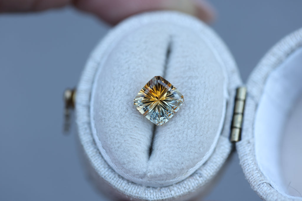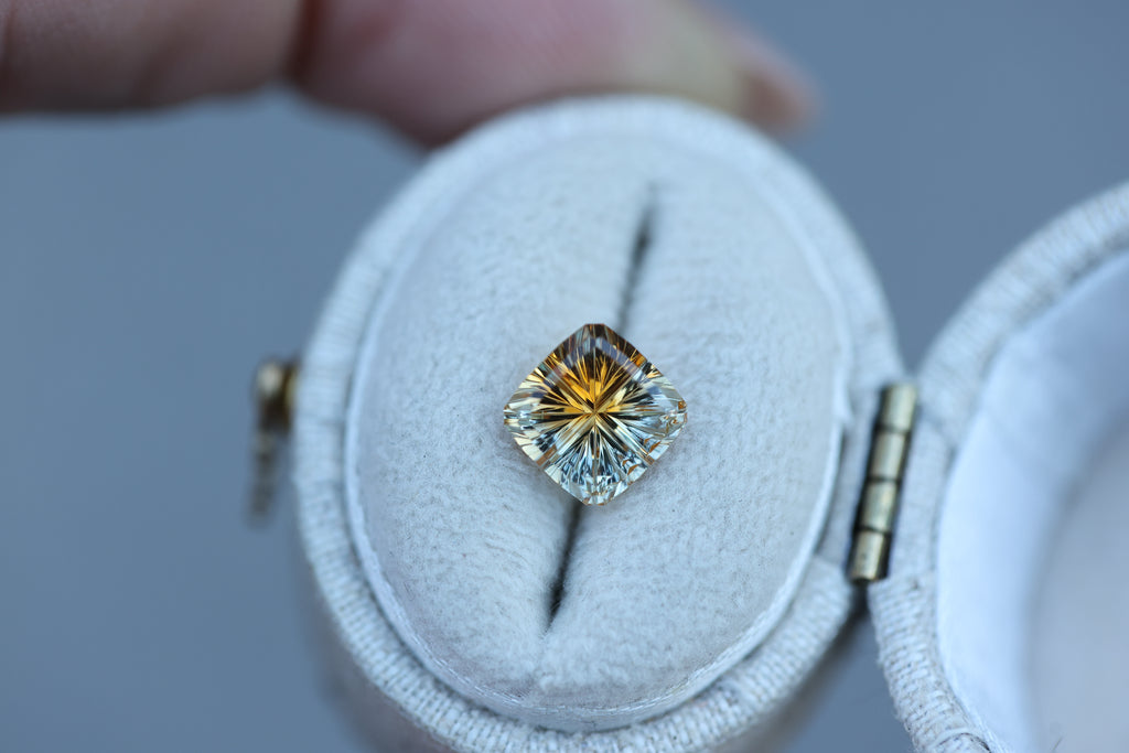 This stone is an absolutely stunning mix of orange and blue! Ice and fire. Can be set the way I have it in the ring box or the more traditional square set so flat sides NSEW
