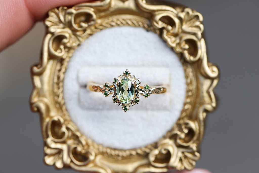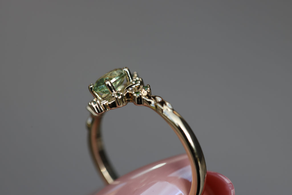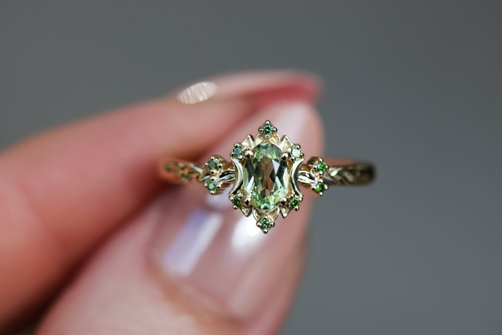 - 6x4mm oval lab green sapphire center stone. This is green in color. (PLEASE NOTE it is a lighter green that can shift to a more medium color in different lighting). Metal will also heavily affect the color with white gold making it appear lighter.
