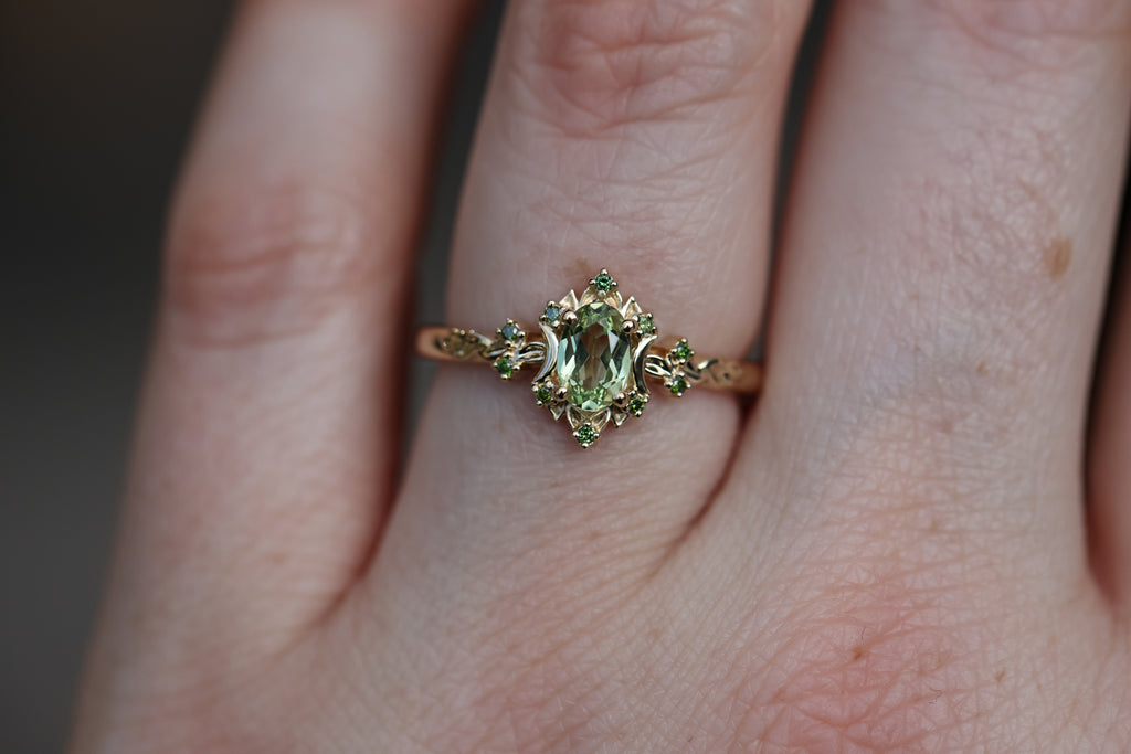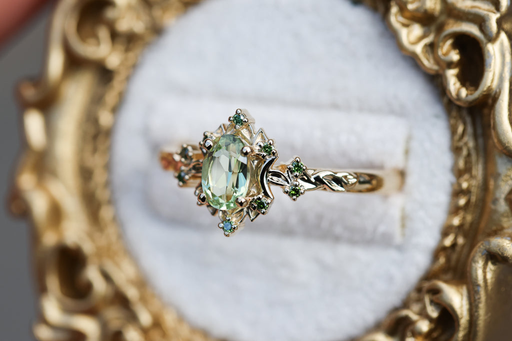 Briar Rose Halo Moon with 6x4mm oval lab green sapphire