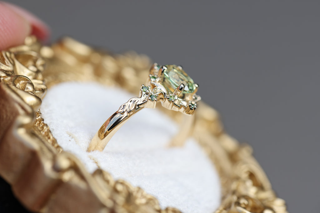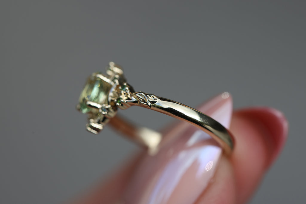 - Ten, 1mm green irradiated diamond accent stones placed along the leaves