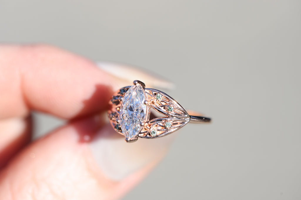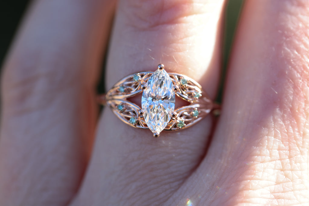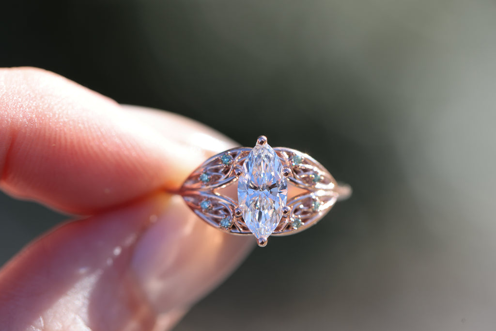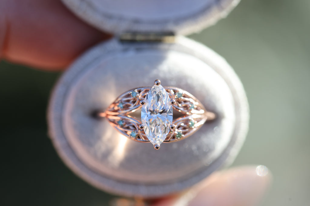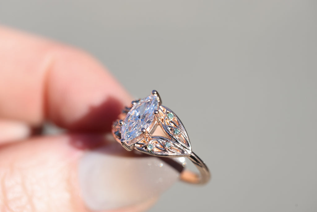 - 1ct (around 10x5mm) lab diamond, DEF coloring VVS2 or better. Will come with certification from IGI or GCAL