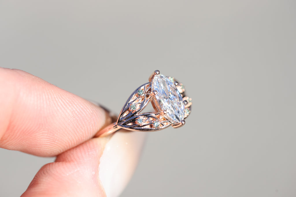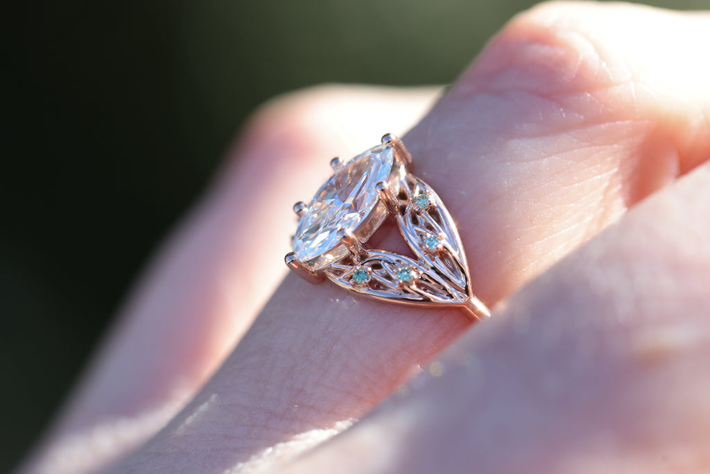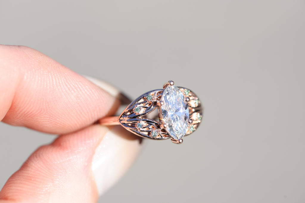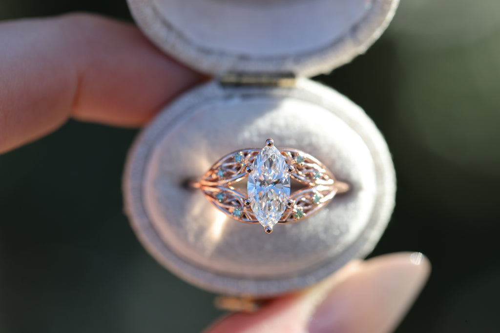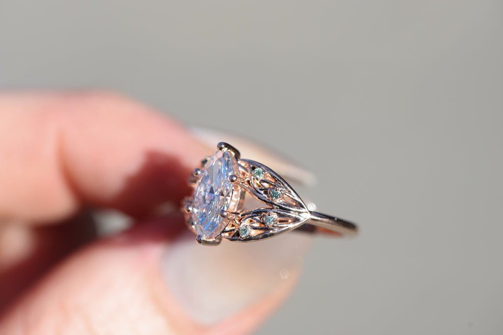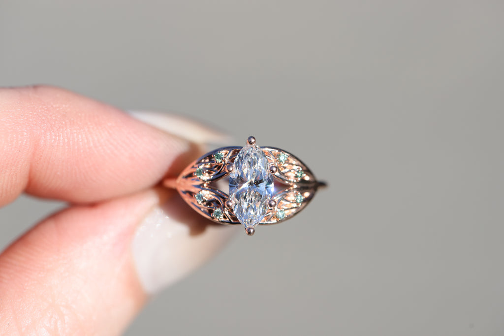 - 1ct (around 10x5mm) lab diamond, DEF coloring VVS2 or better. Will come with certification from IGI or GCAL