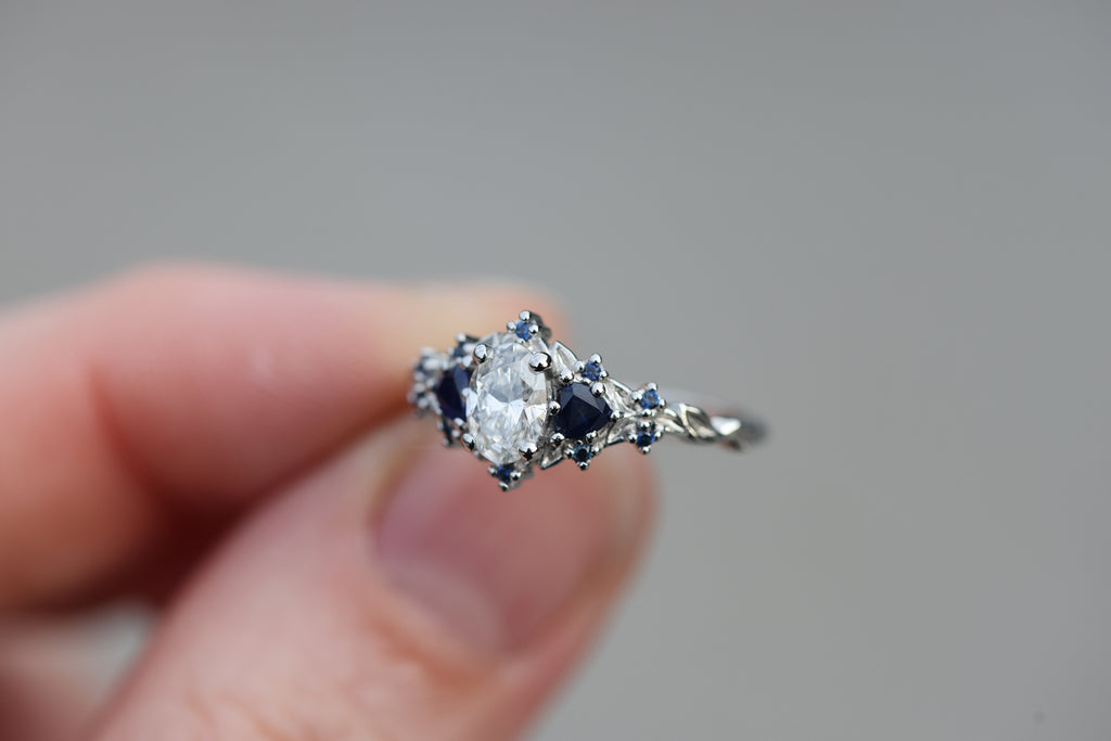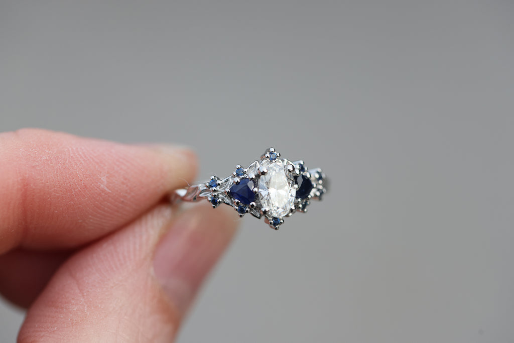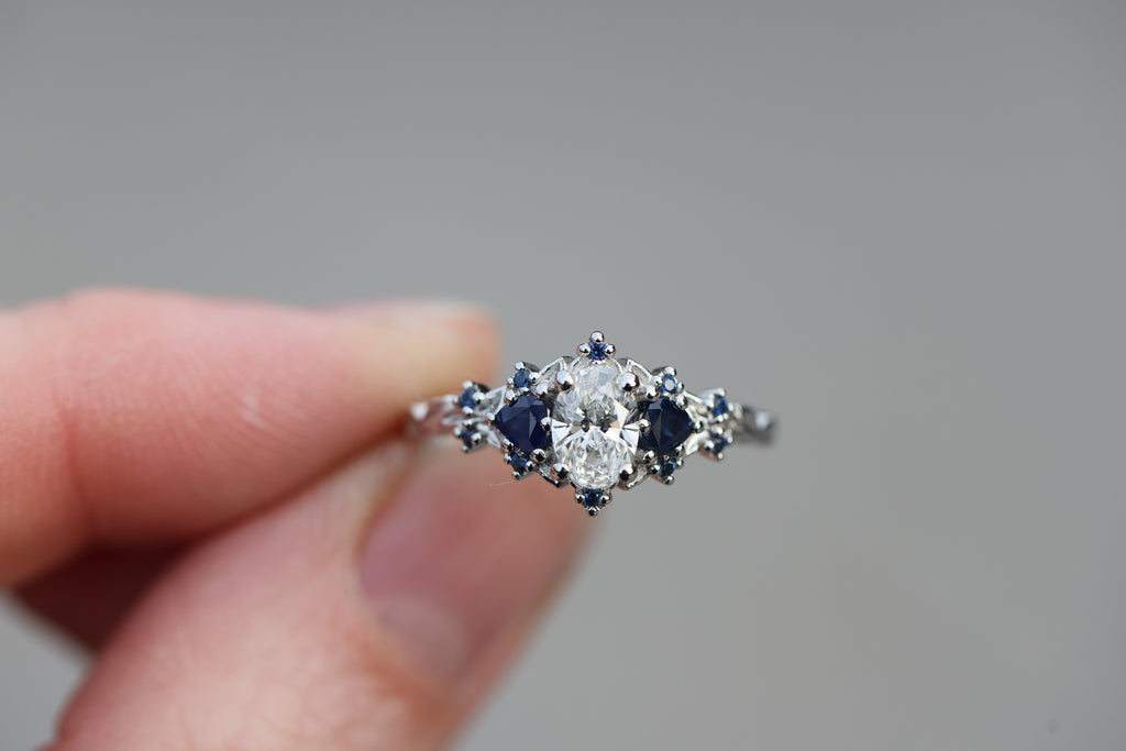-Sides/Accents: 3mm trillion natural blue sapphire, 1mm natural blue sapphire