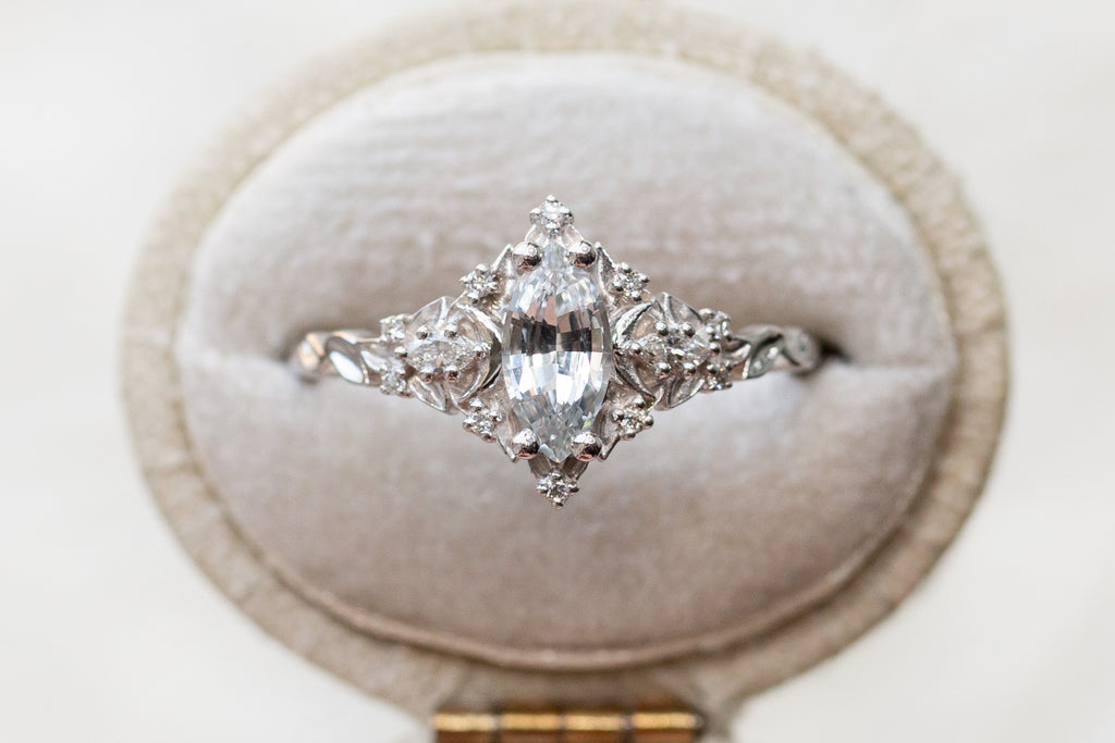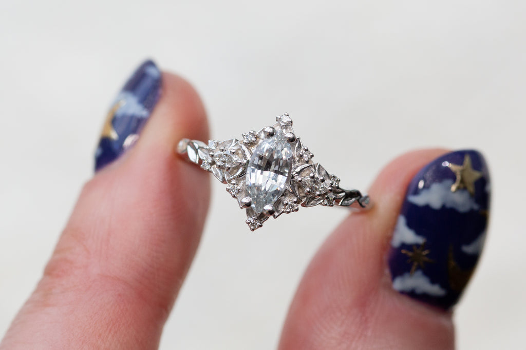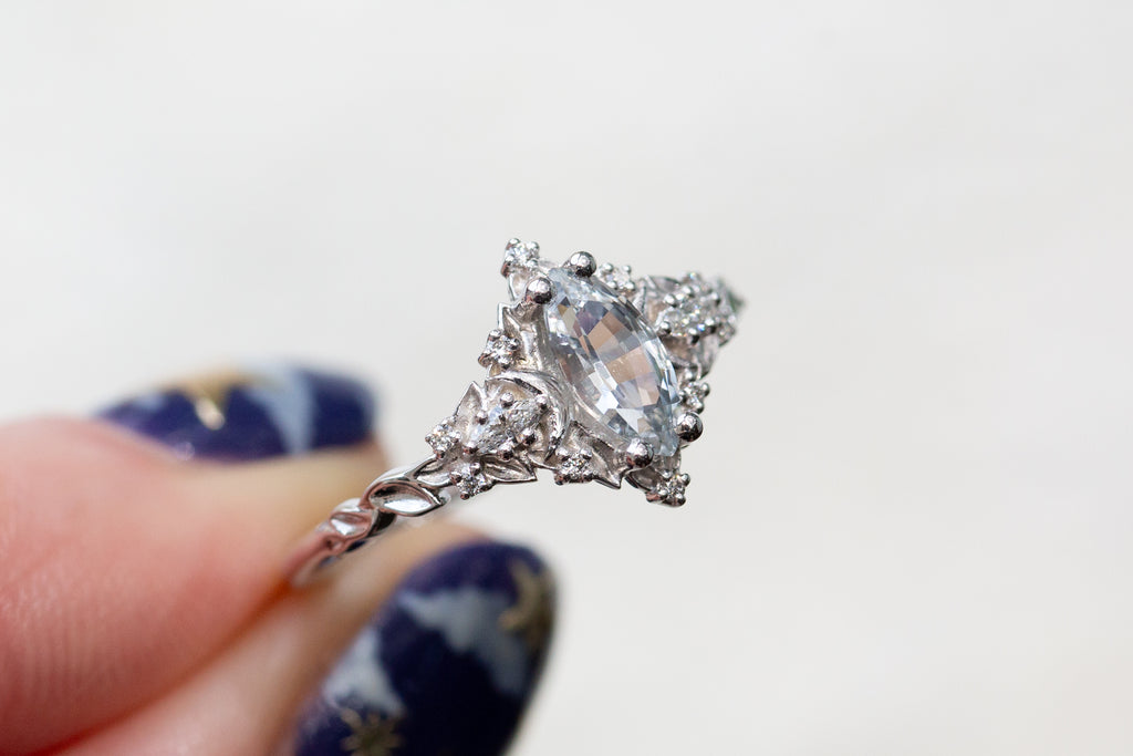 READY TO SHIP - Size 7, 18k white gold Briar Moon Three Stone