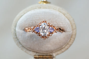 - Side/accent stones: 3mm trillion tanzanite, 1mm lab diamond