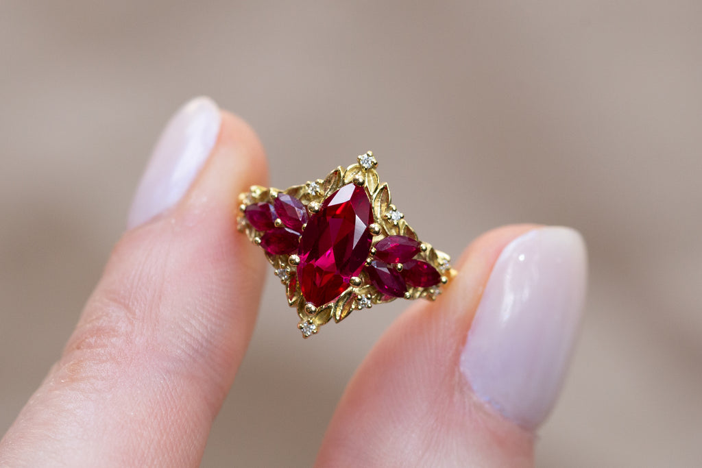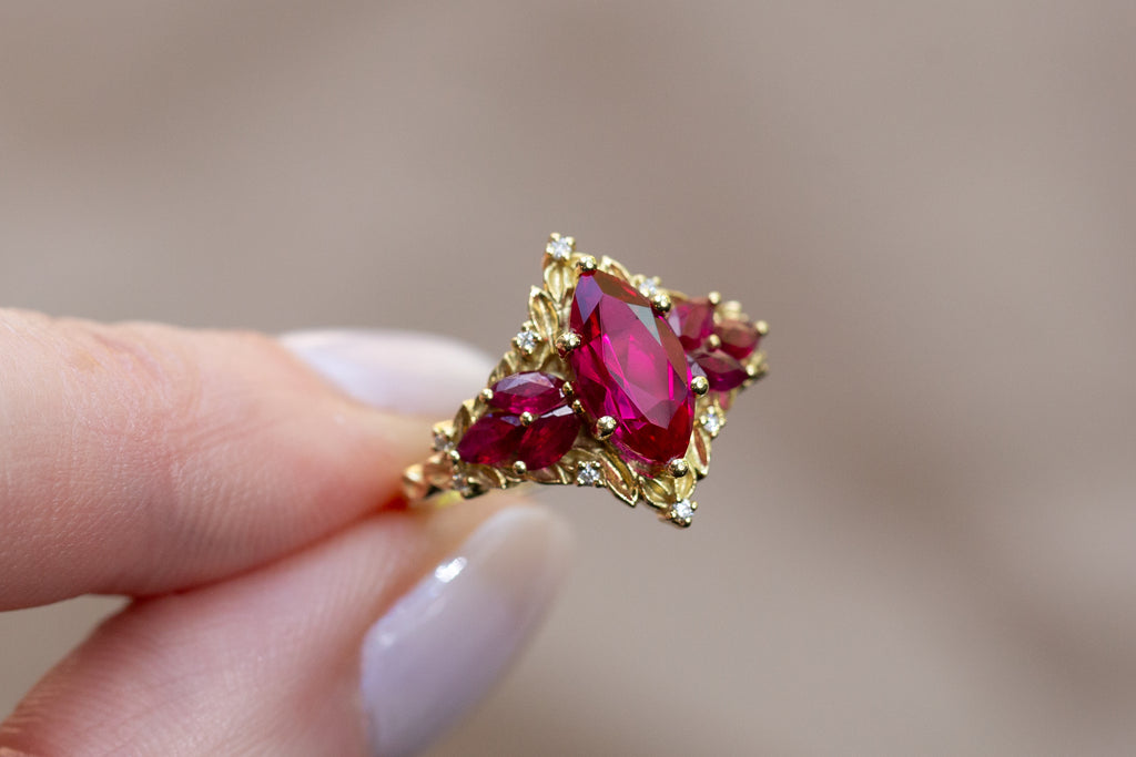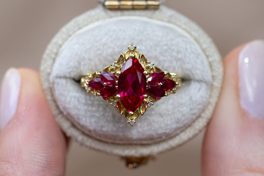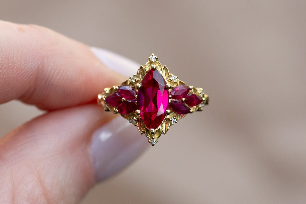 -Side/Accents: 4x2mm marquise natural ruby, 1mm round natural diamond