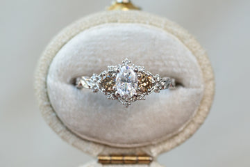 - Side/accent stones: 3mm round champagne diamond, 1mm lab diamond